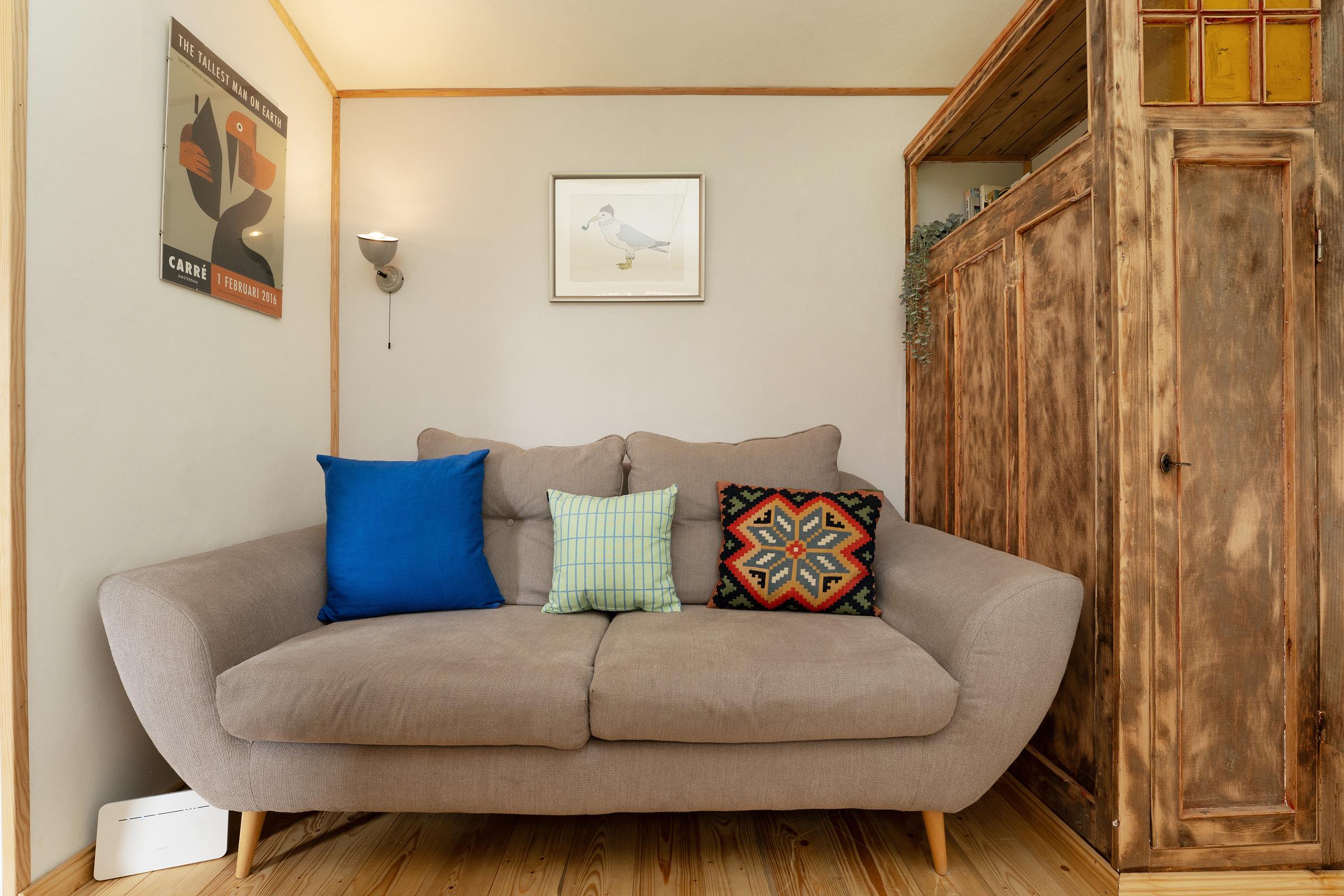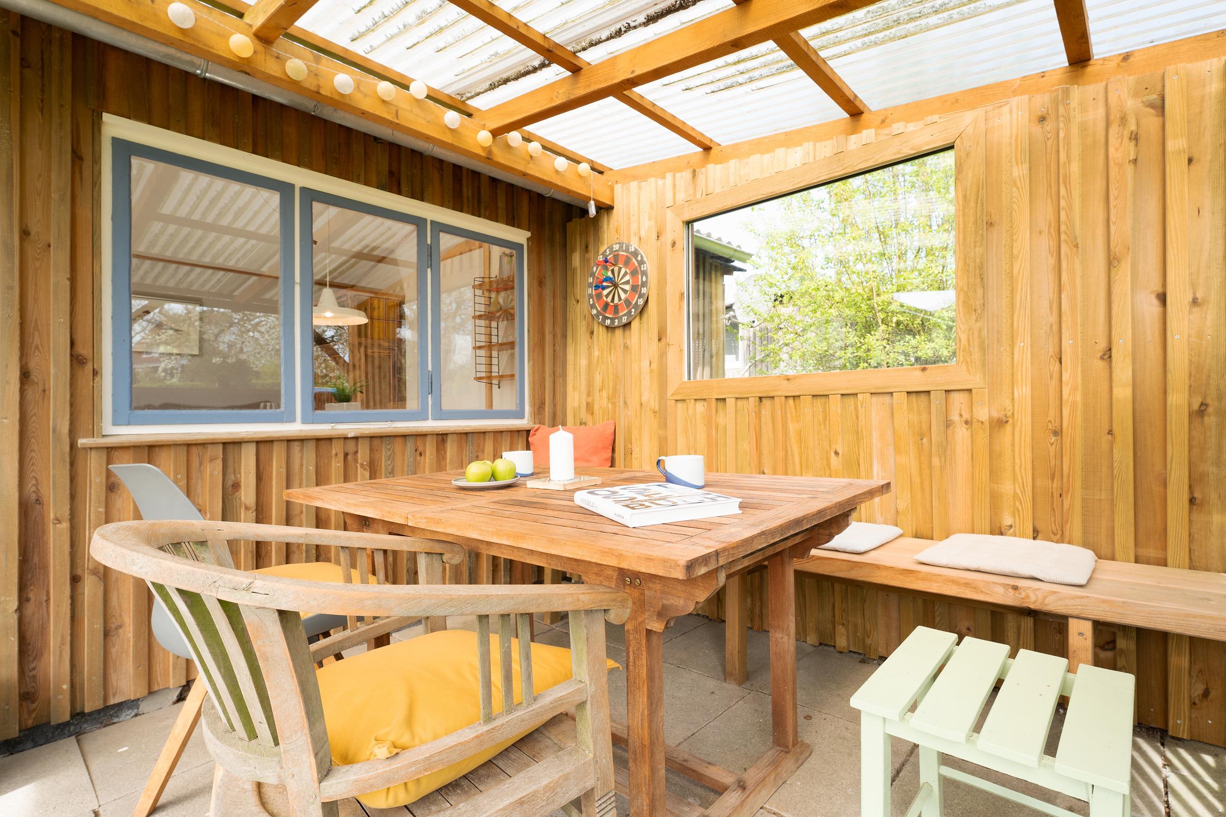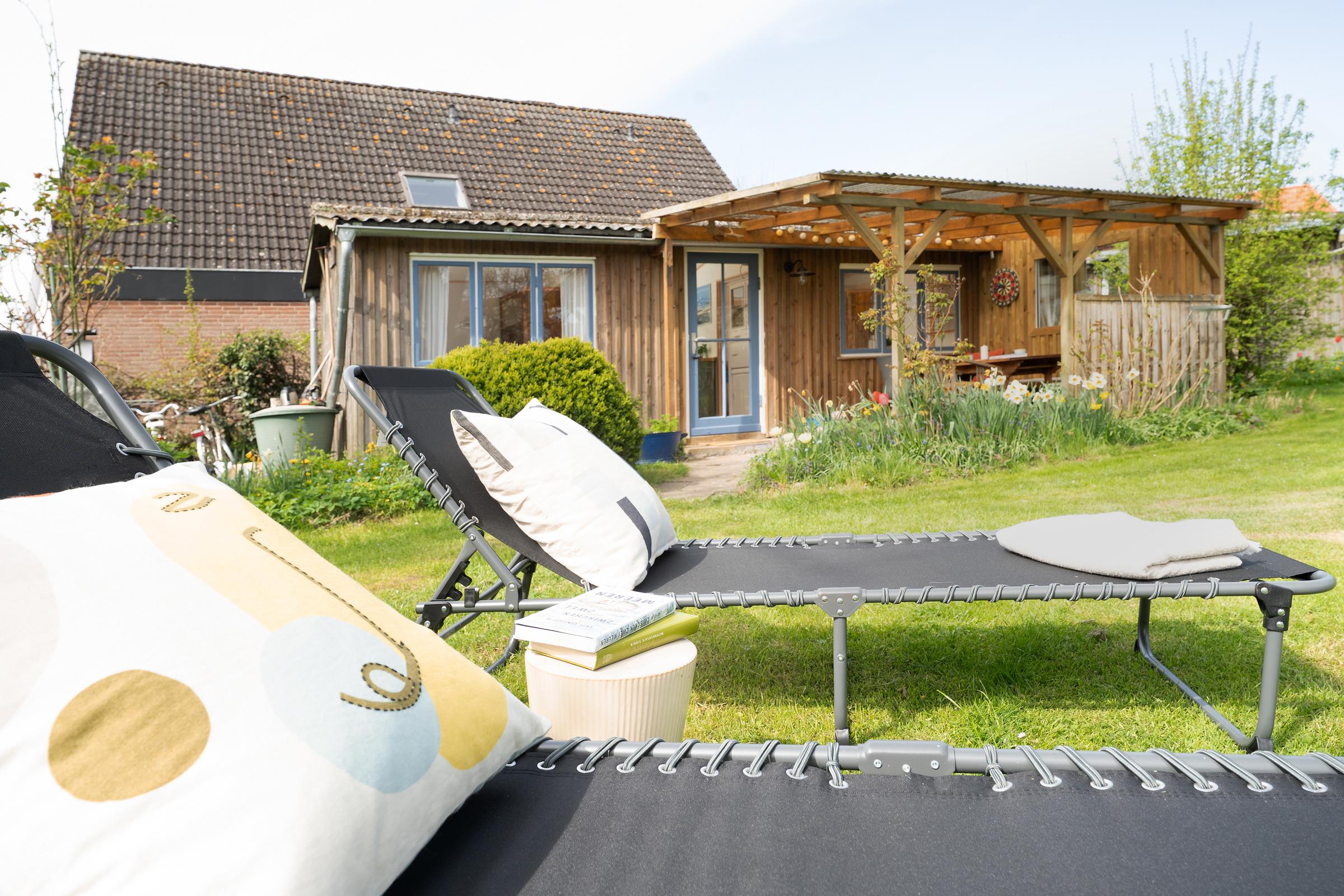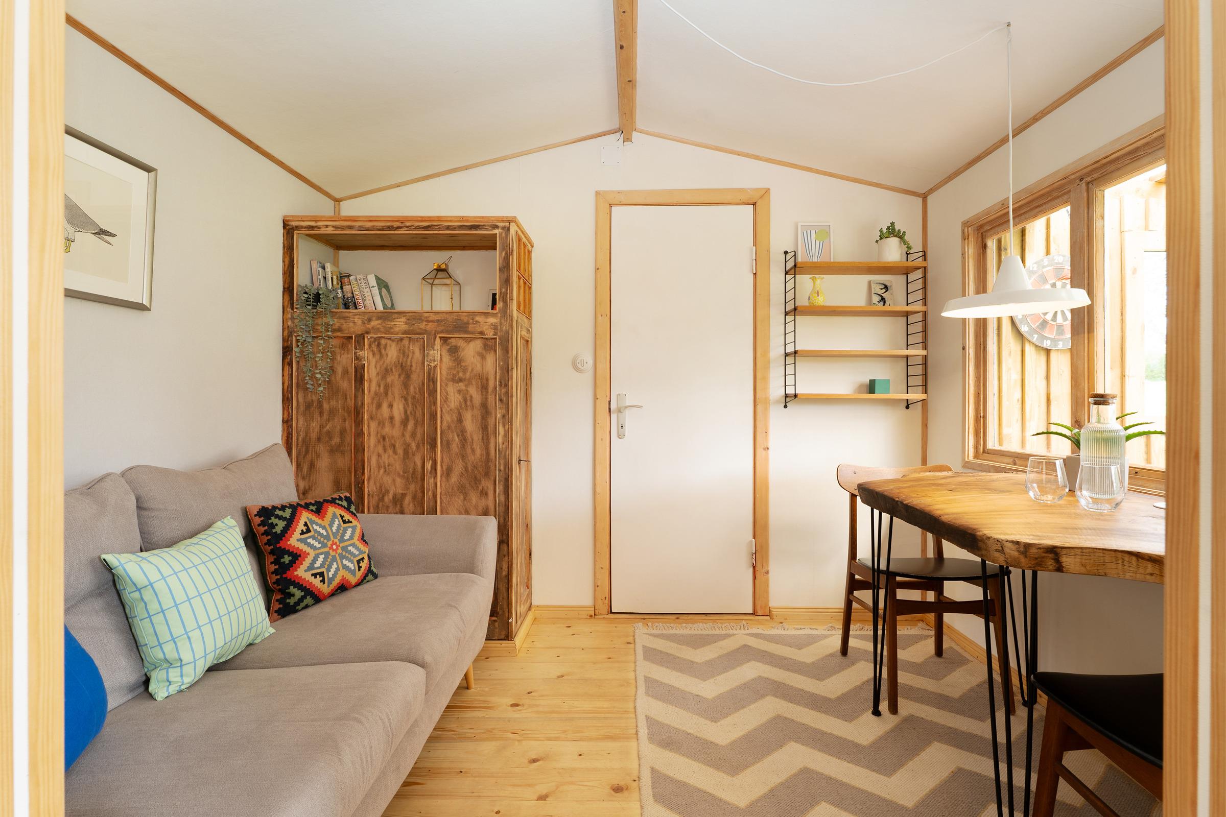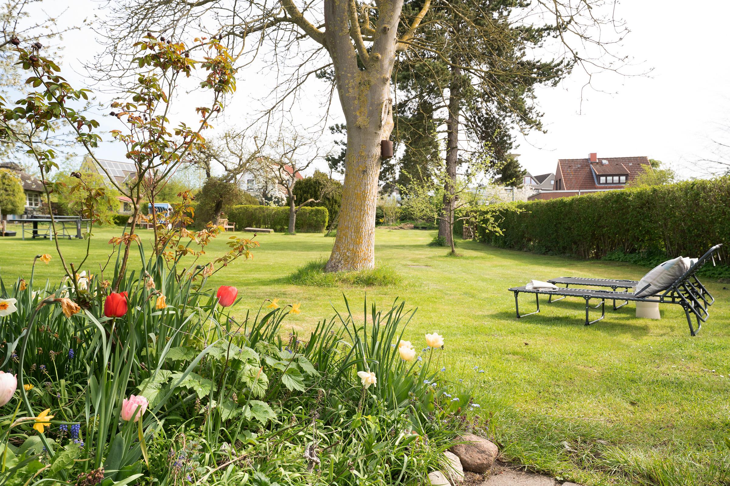 Der Wohnbereich ist funktional gestaltet und bietet eine komfortable Sitzecke für entspannte Abende. Die große Terrasse ist mit Gartenmöbeln ausgestattet – perfekt für ein Frühstück an der frischen Luft. Auch eine Tischtennisplatte steht Ihnen im Gemeinschaftsgarten zur Verfügung.