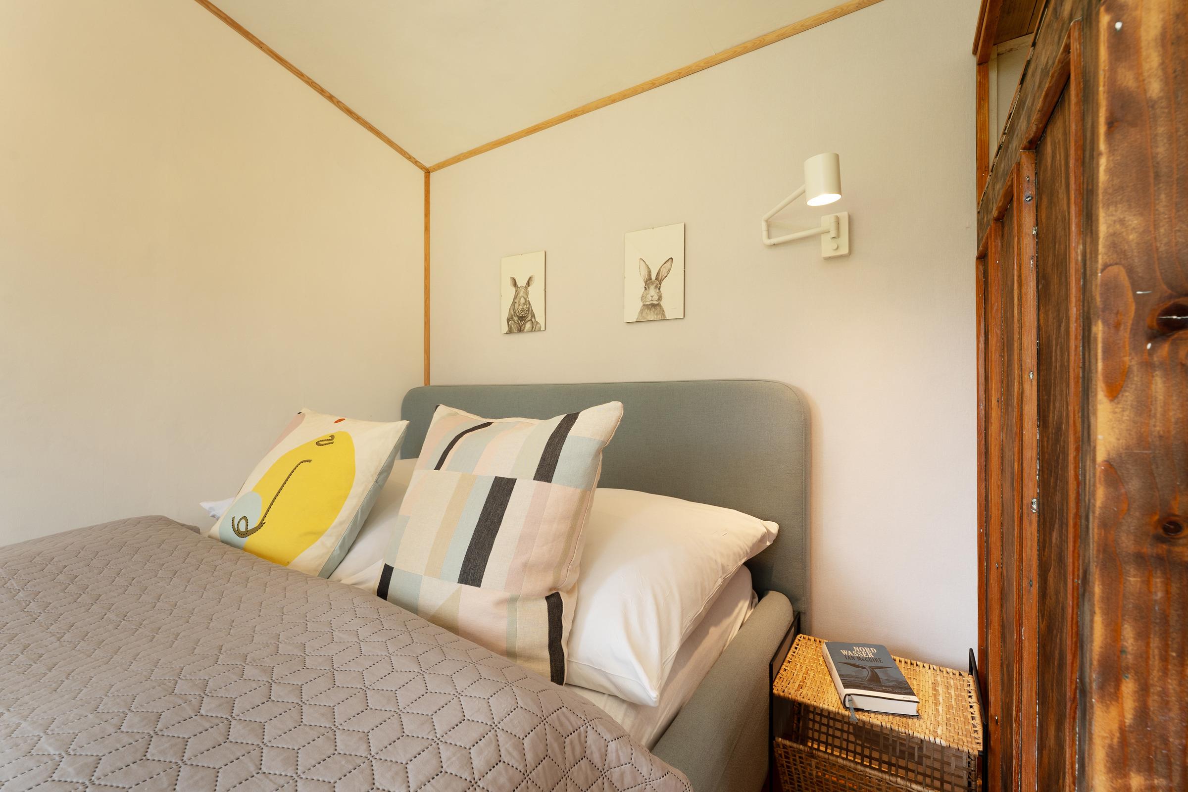 Das Schlafzimmer bietet ein bequemes Doppelbett für erholsamen Schlaf. Im modernen Bad finden Sie eine bodengleiche Dusche, Waschbecken und WC sowie einen Handtuchheizkörper für zusätzlichen Komfort.