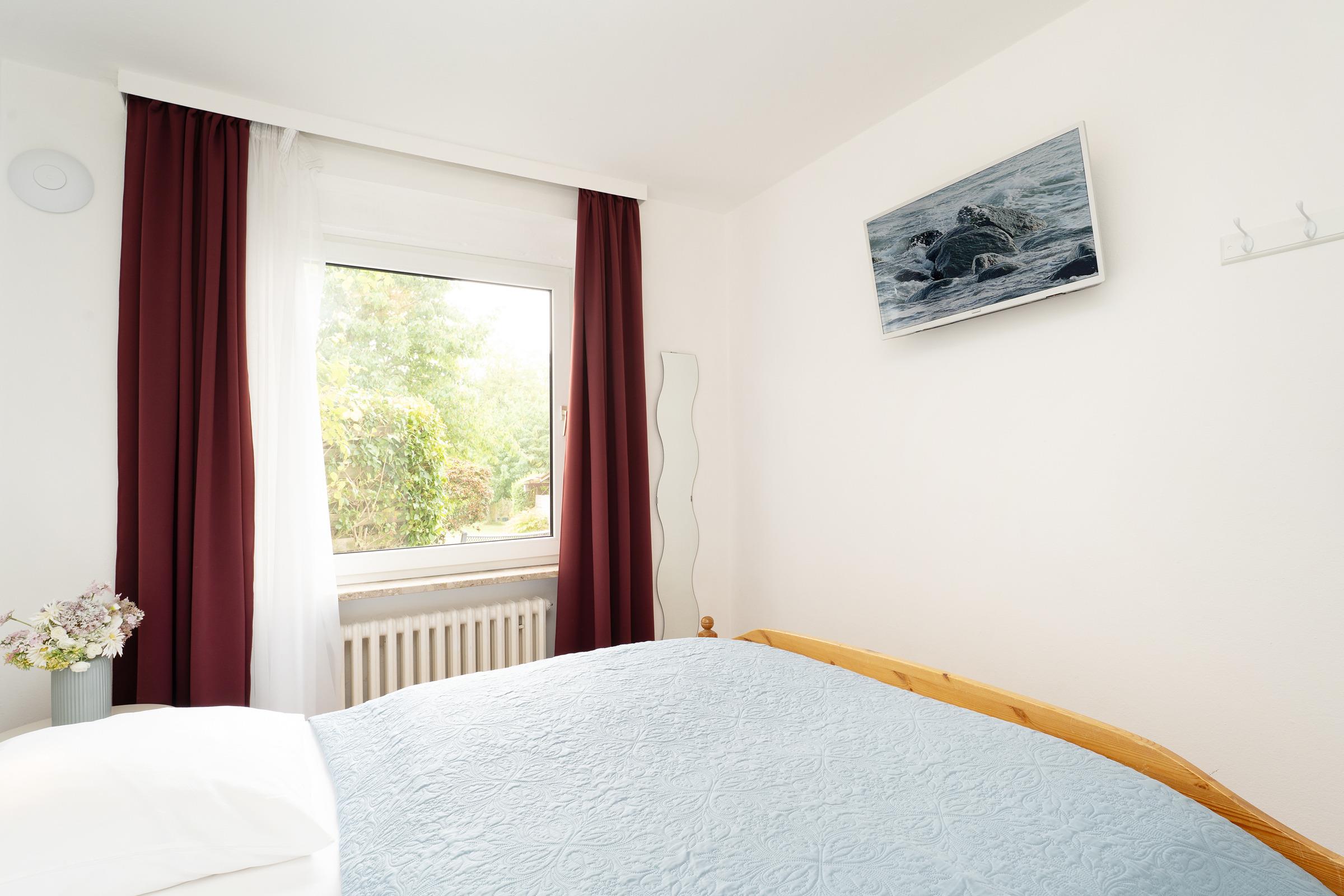 Schlafzimmer 1: 1 Doppelbett (2x 90 x 200 cm), Kleiderschrank, Fernseher, Verdunkelung: Vorhang, kein Platz für ein Babybett vorhanden
