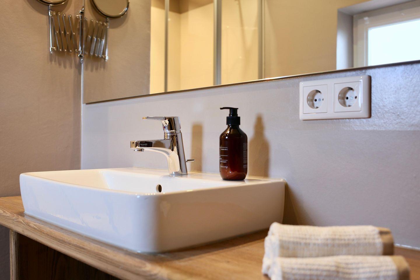 ° Badezimmer mit Dusche, Waschtisch, Föhn und Kosmetikspiegel