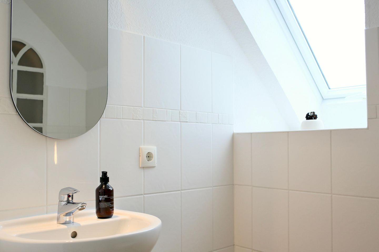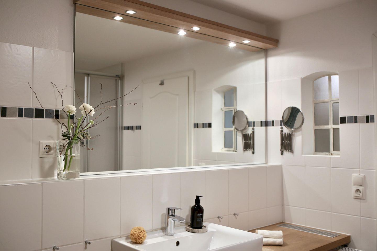 ° Badezimmer mit Dusche, Waschtisch, Föhn und Kosmetikspiegel