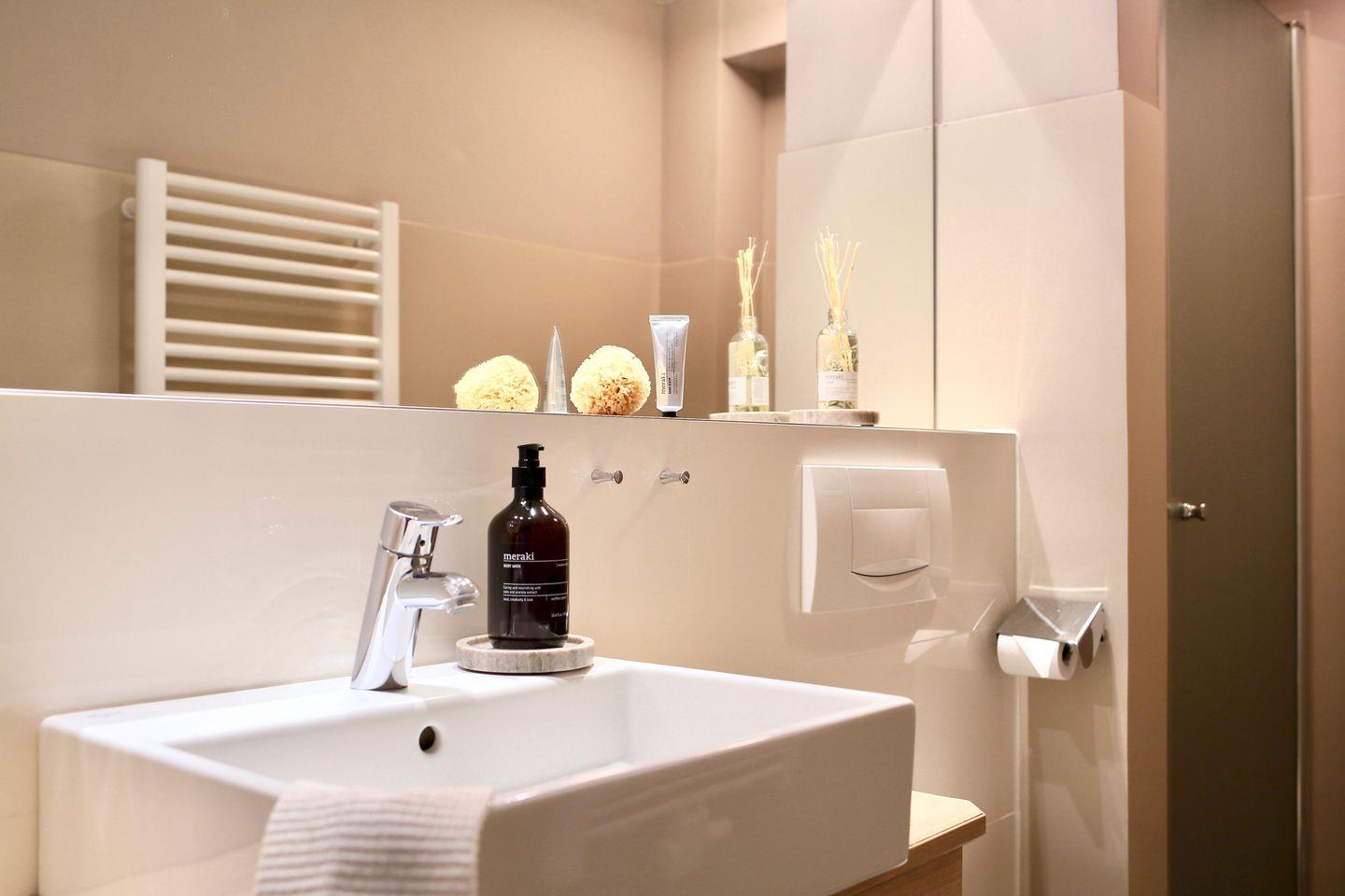 ° Badezimmer mit Dusche, Waschtisch, Föhn und Kosmetikspiegel
