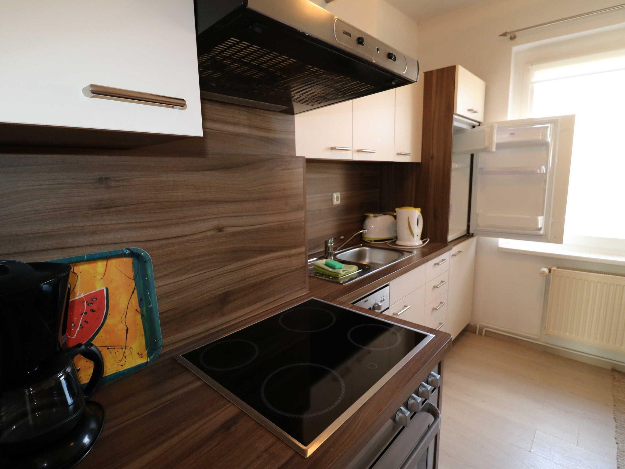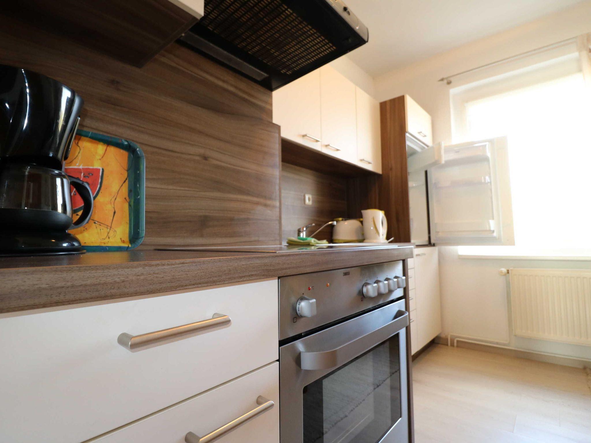* Komplett eingerichtete Küche mit Essplatz, inkl. Geschirrspüler, Kühlschrank mit Gefrierfach, Backofen, Wasserkocher & Toaster