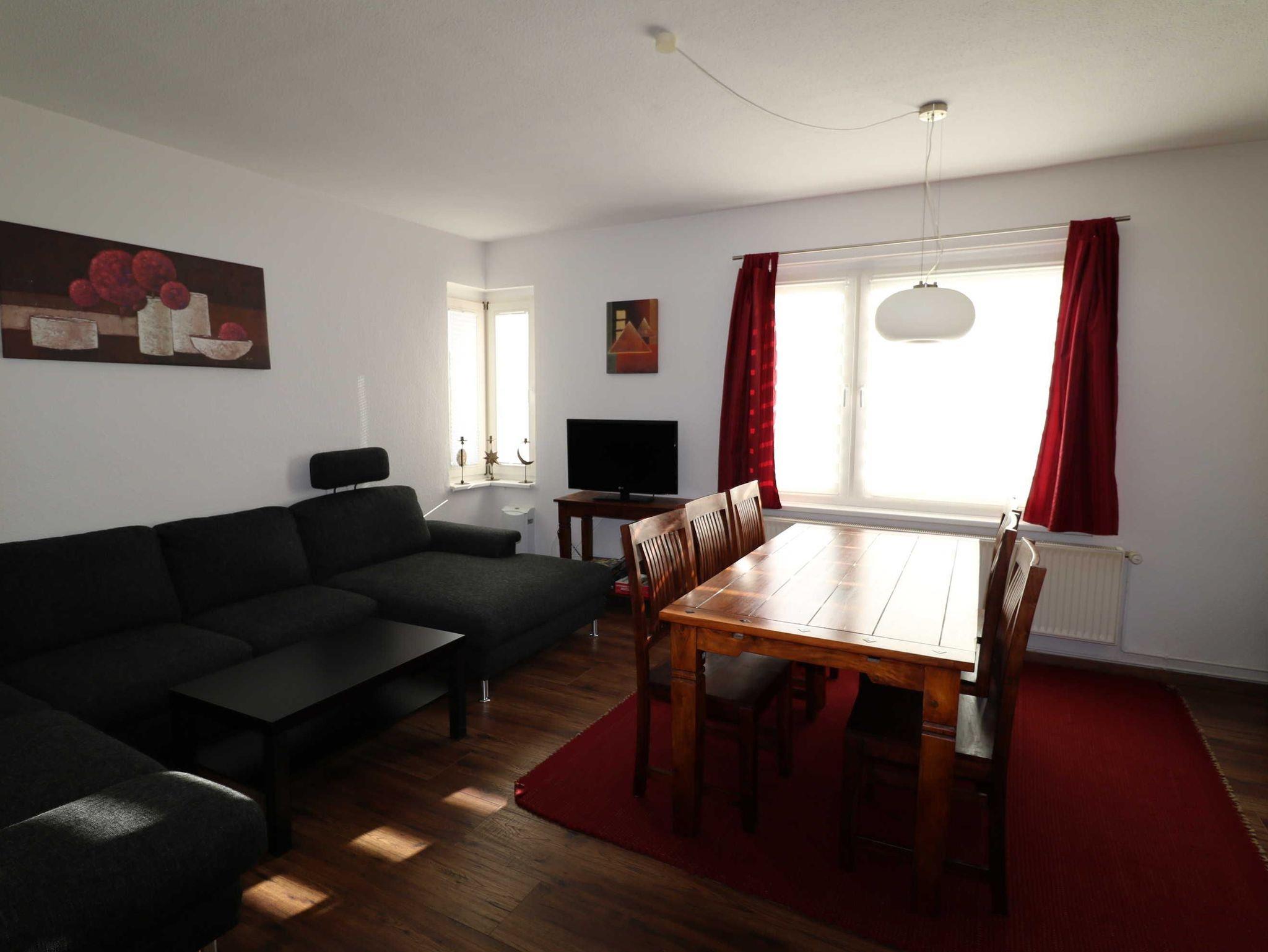 * Wohnzimmer mit moderner Couch (Aufbettung für 2 Pers), großem Esstisch, Flachbild-TV und Musikanlage