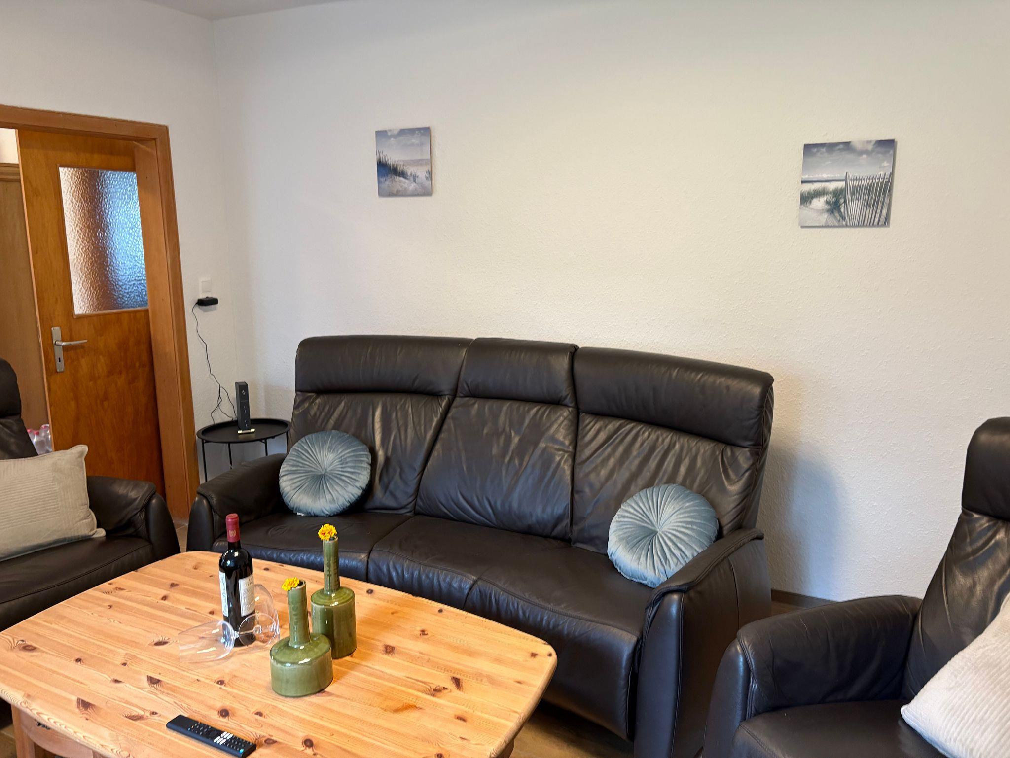 Gemütliche, moderne eingerichtete Ferienwohnung in ruhiger Lage. Die Wohnung besteht aus Küche, Wohn-Esszimmer, begehbare Dusche, sep. WC, zwei Schlafzimmer mit Doppelbetten und eine überdachte Terrasse mit Blick auf eine Pferdekoppel.
