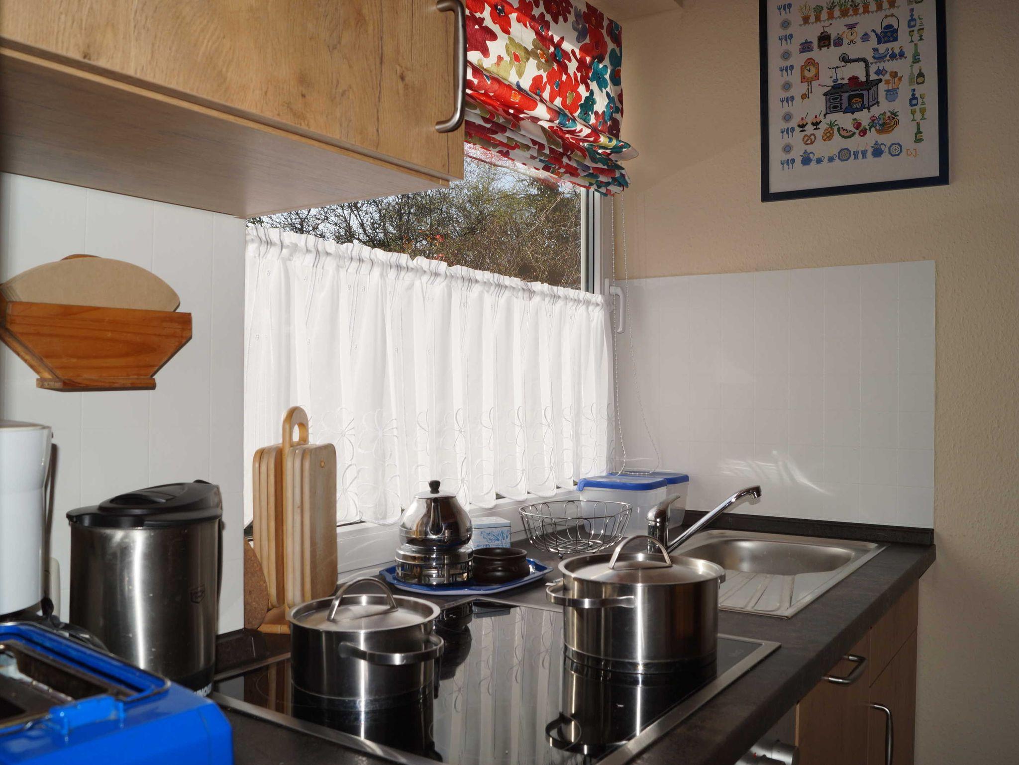 Die Ferienwohnung ist ebenerdig. Es erwartet Sie ein großer, offener Wohn- und Essbereich. Das Sofa kann auch als Schlafmöglichkeit genutzt werden. Im angrenzenden Schlafzimmer befindet sich ein Doppelbett und ein Etagenbett. Ein Kinderbett wird nach Bedarf dazugestellt. Zur voll ausgestatteten Küche gehört eine Spülmaschine und ein Kühlschrank mit Gefrierfach. Das Badezimmer mit Dusche und WC befindet sich ebenfalls gleich nebenan. Handtücher und Bettwäsche sind vorhanden und im Preis inbegriffen.