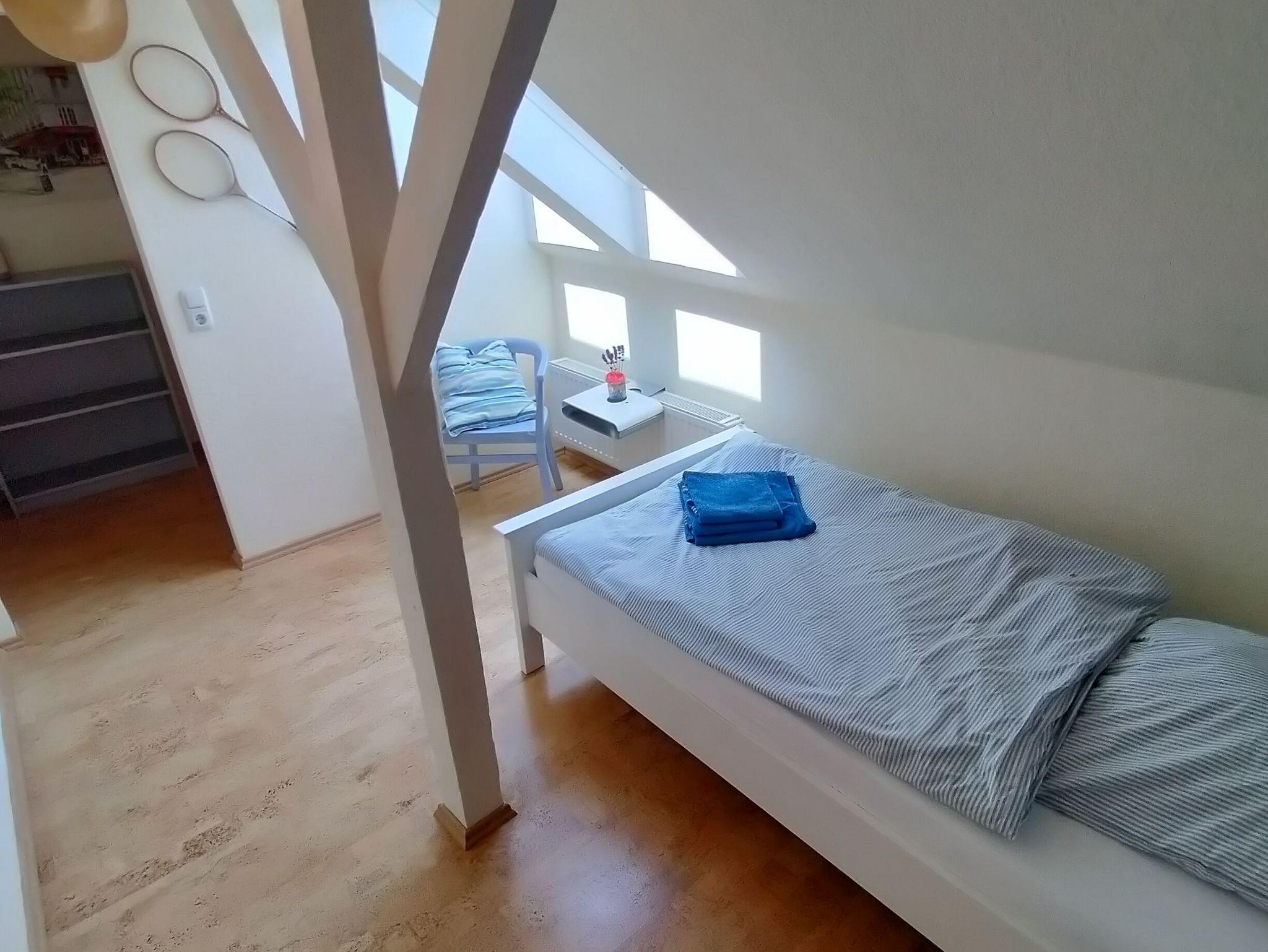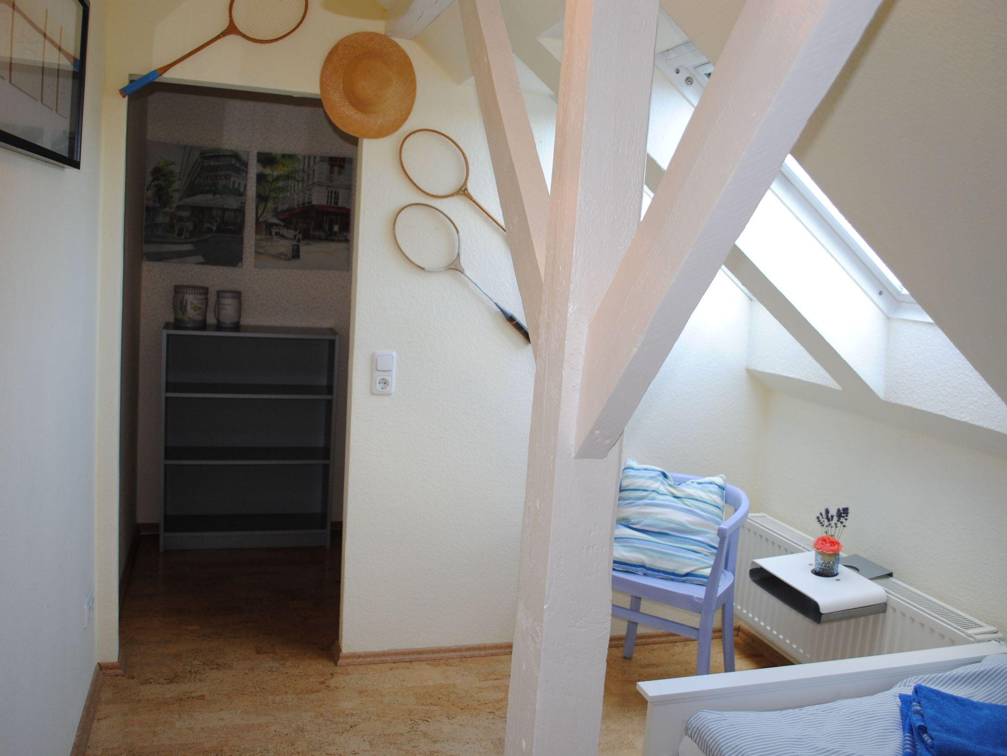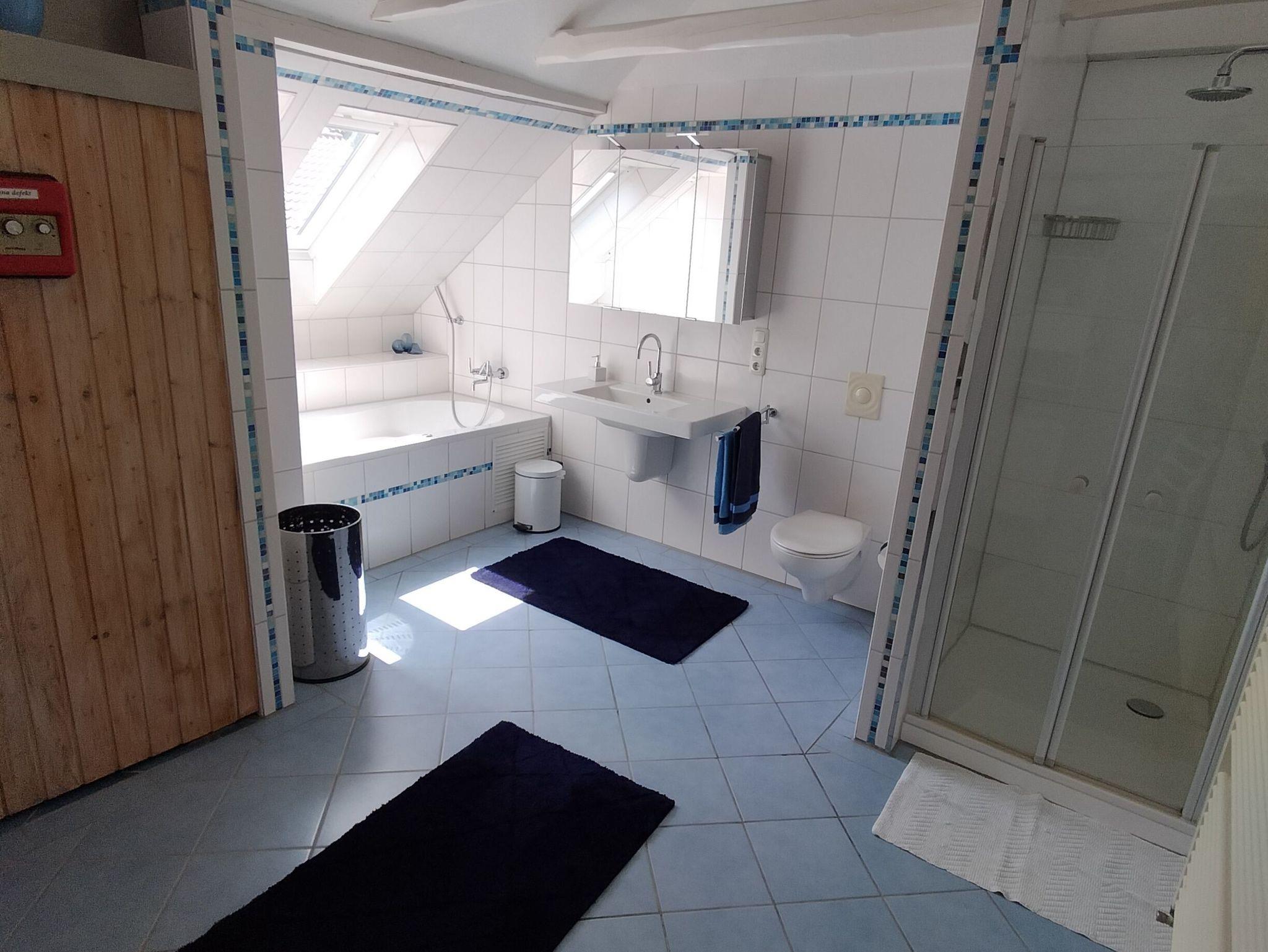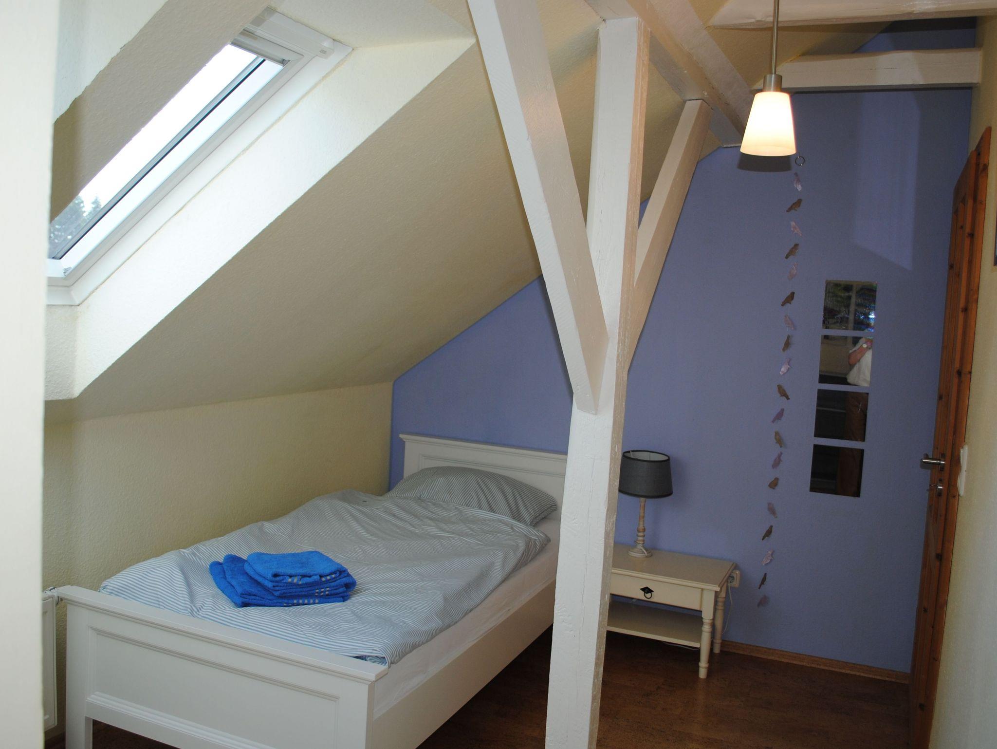 Die Wohnung erstreckt sich über 2 Etagen und verfügt über 2 Schlafzimmer mit Doppelbetten im Erdgeschoss. Im Dachgeschoss befinden sich 3 Schlafzimmer mit Einzelbetten. Das große Familienbad befindet sich im Dachgeschoss und verfügt über Badewanne, Dusche und WC. Im Erdgeschoss ist die Küche mit Essplatz und einem extra Wohnzimmer mit TV. Eine Spielesammlung für Spieleabende mit der ganzen Familie steht zur Verfügung.