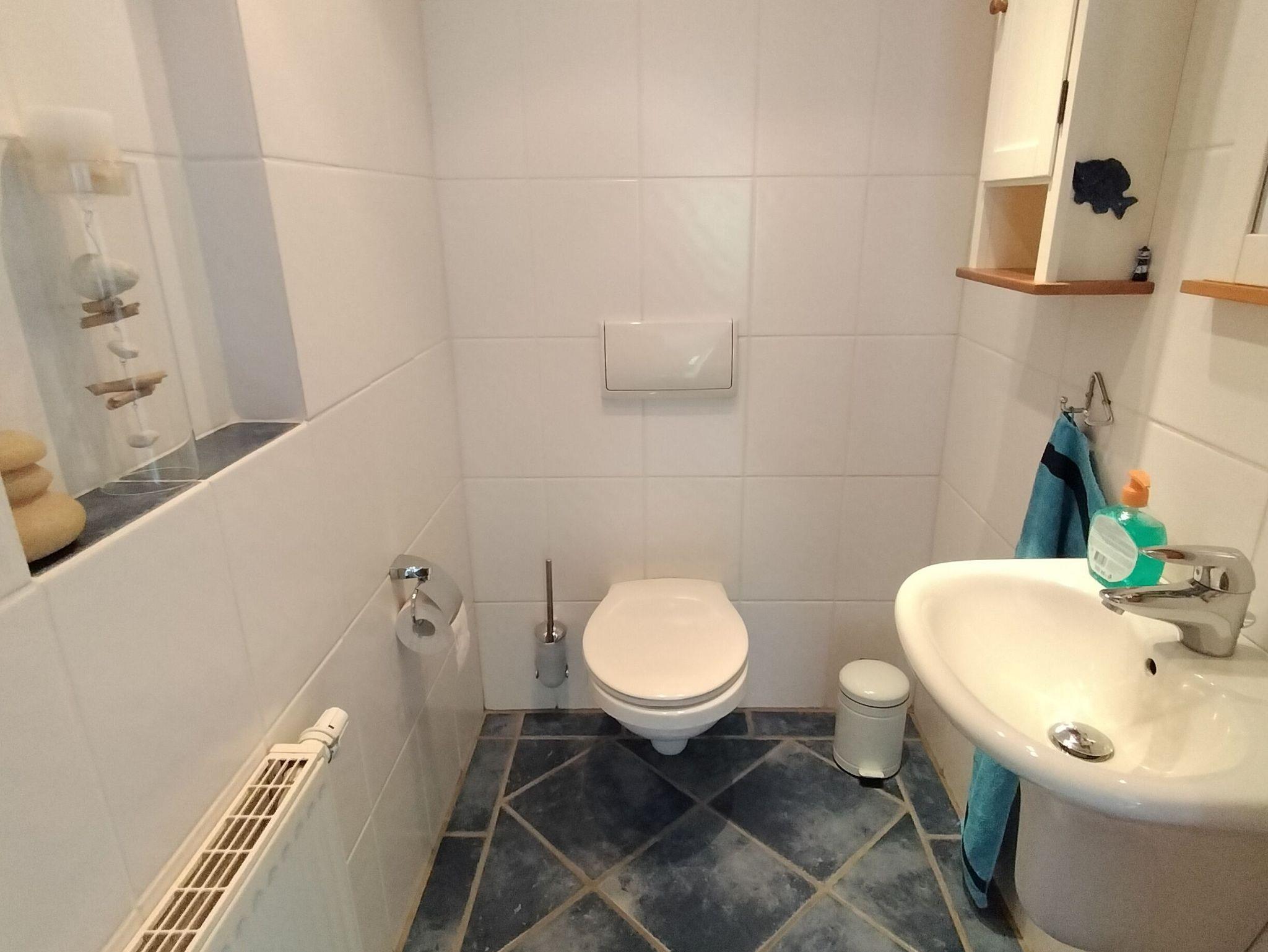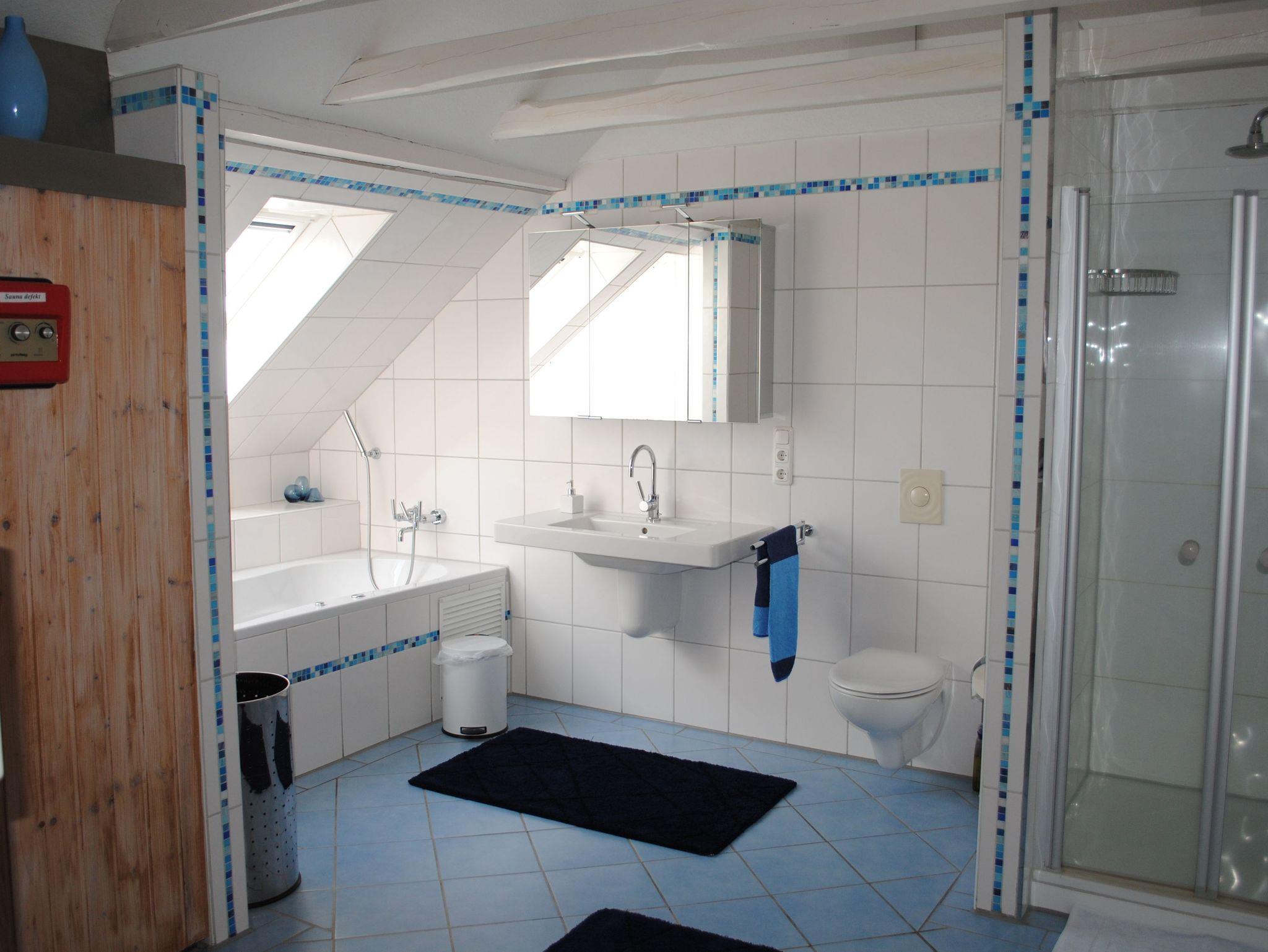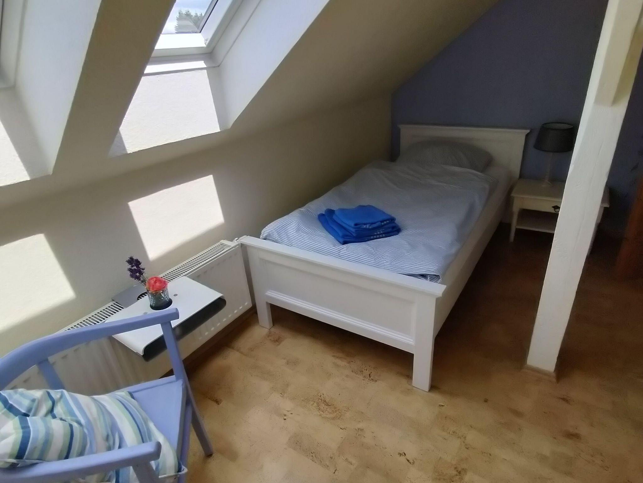 Die Wohnung erstreckt sich über 2 Etagen und verfügt über 2 Schlafzimmer mit Doppelbetten im Erdgeschoss. Im Dachgeschoss befinden sich 3 Schlafzimmer mit Einzelbetten. Das große Familienbad befindet sich im Dachgeschoss und verfügt über Badewanne, Dusche und WC. Im Erdgeschoss ist die Küche mit Essplatz und einem extra Wohnzimmer mit TV. Eine Spielesammlung für Spieleabende mit der ganzen Familie steht zur Verfügung.