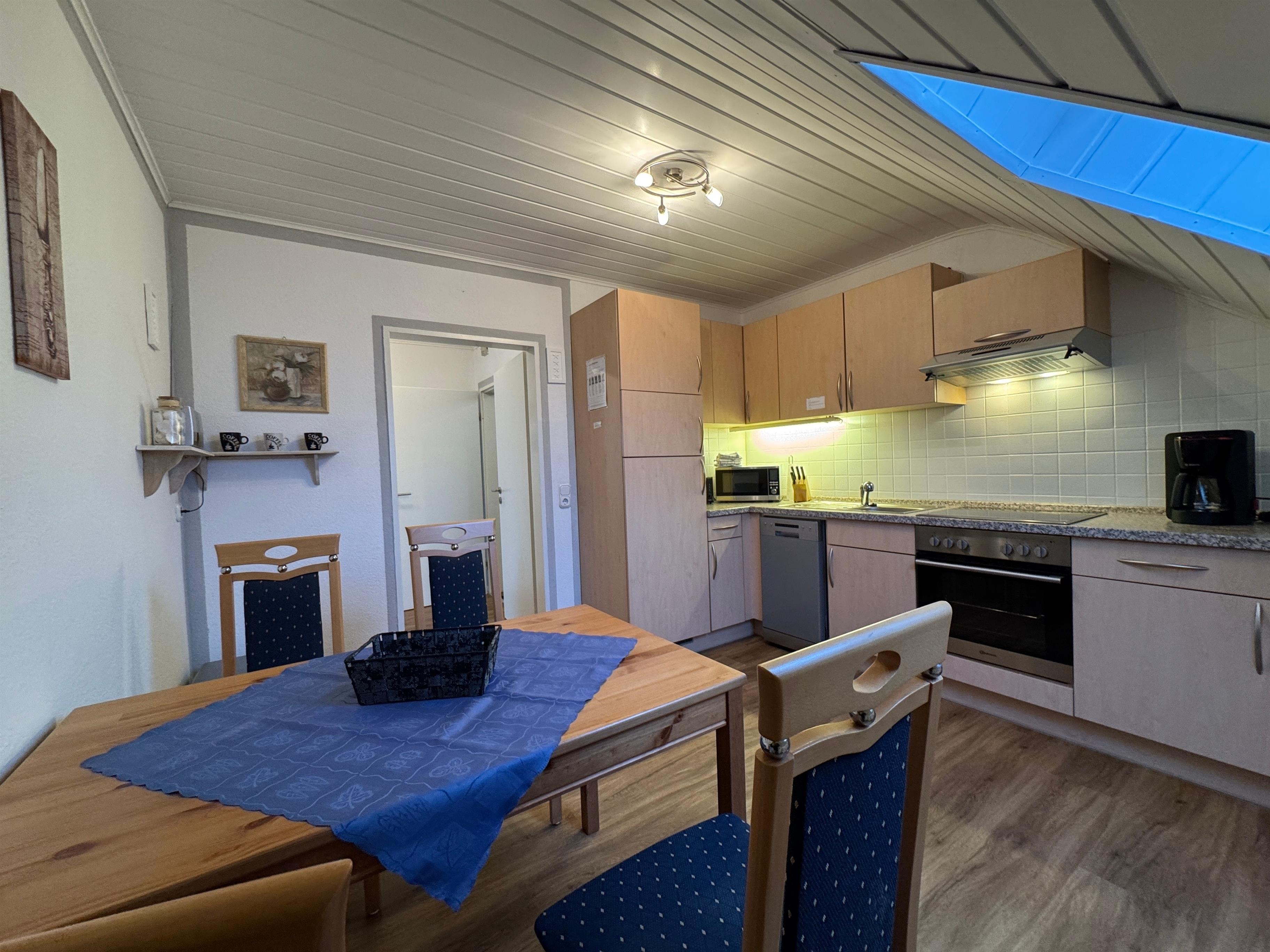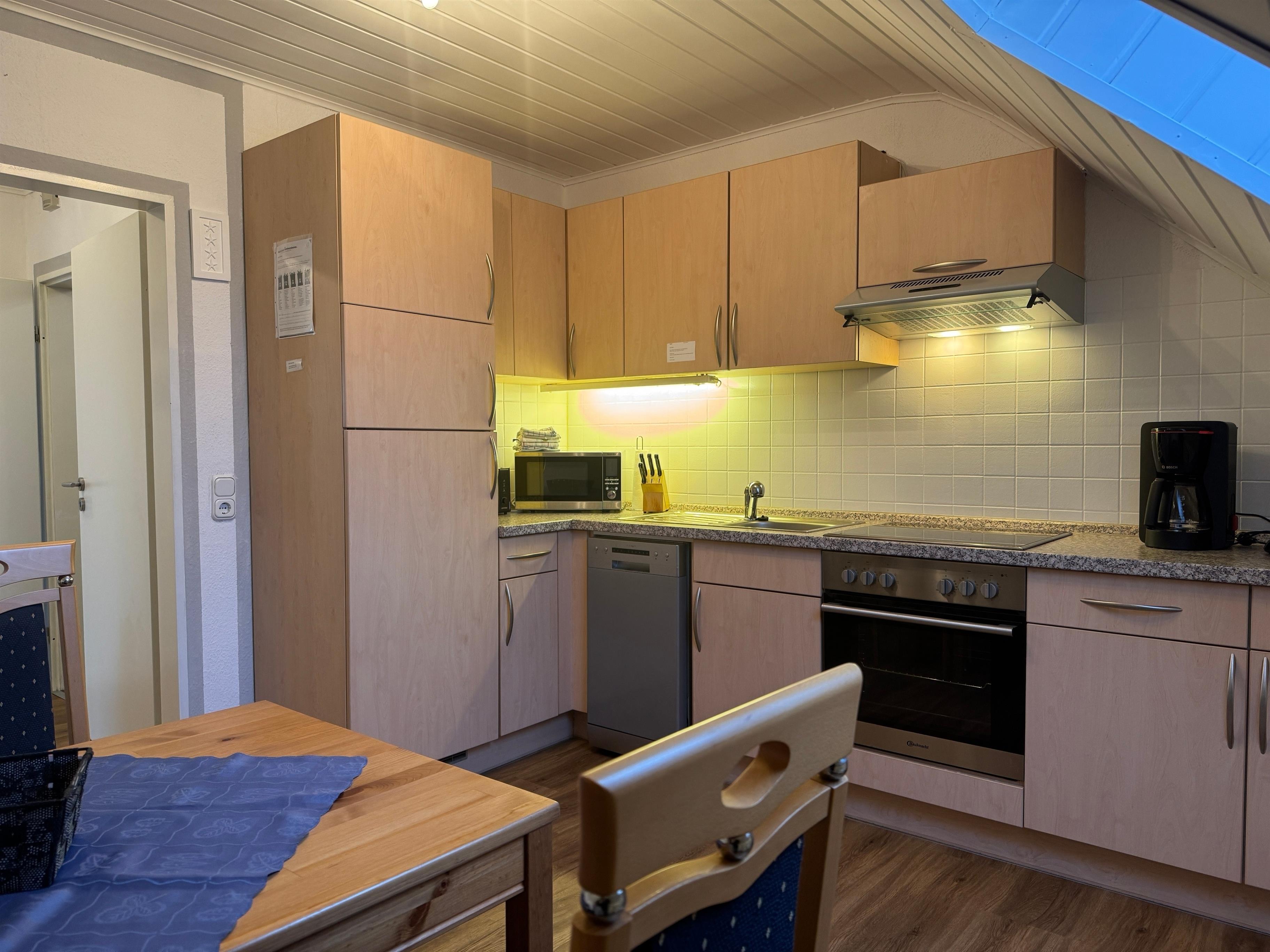 Die gut ausgestattete Küche besitzt unter anderem einen Kühlschrank, einen Herd zum Kochen und sogar eine Spülmaschine.