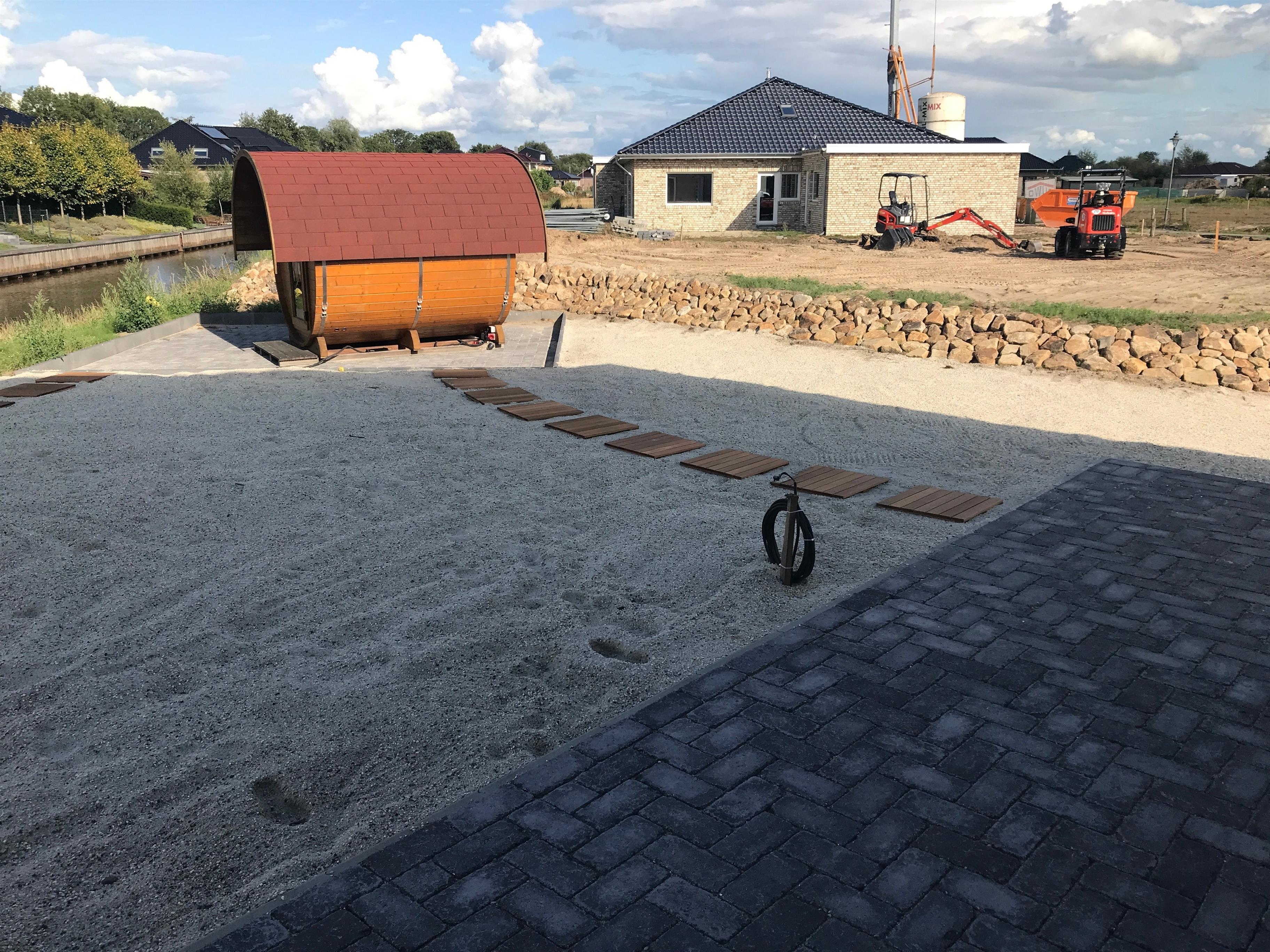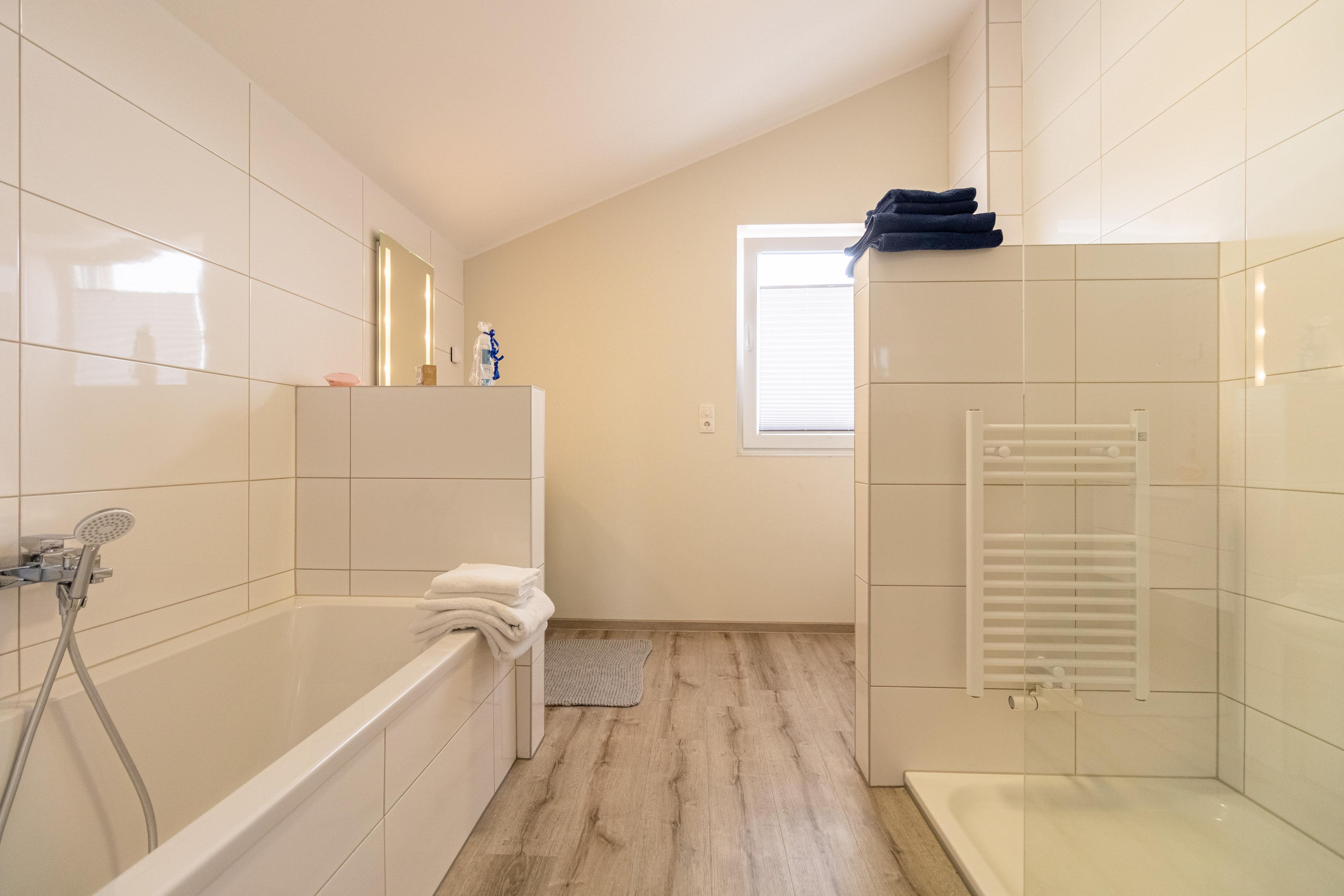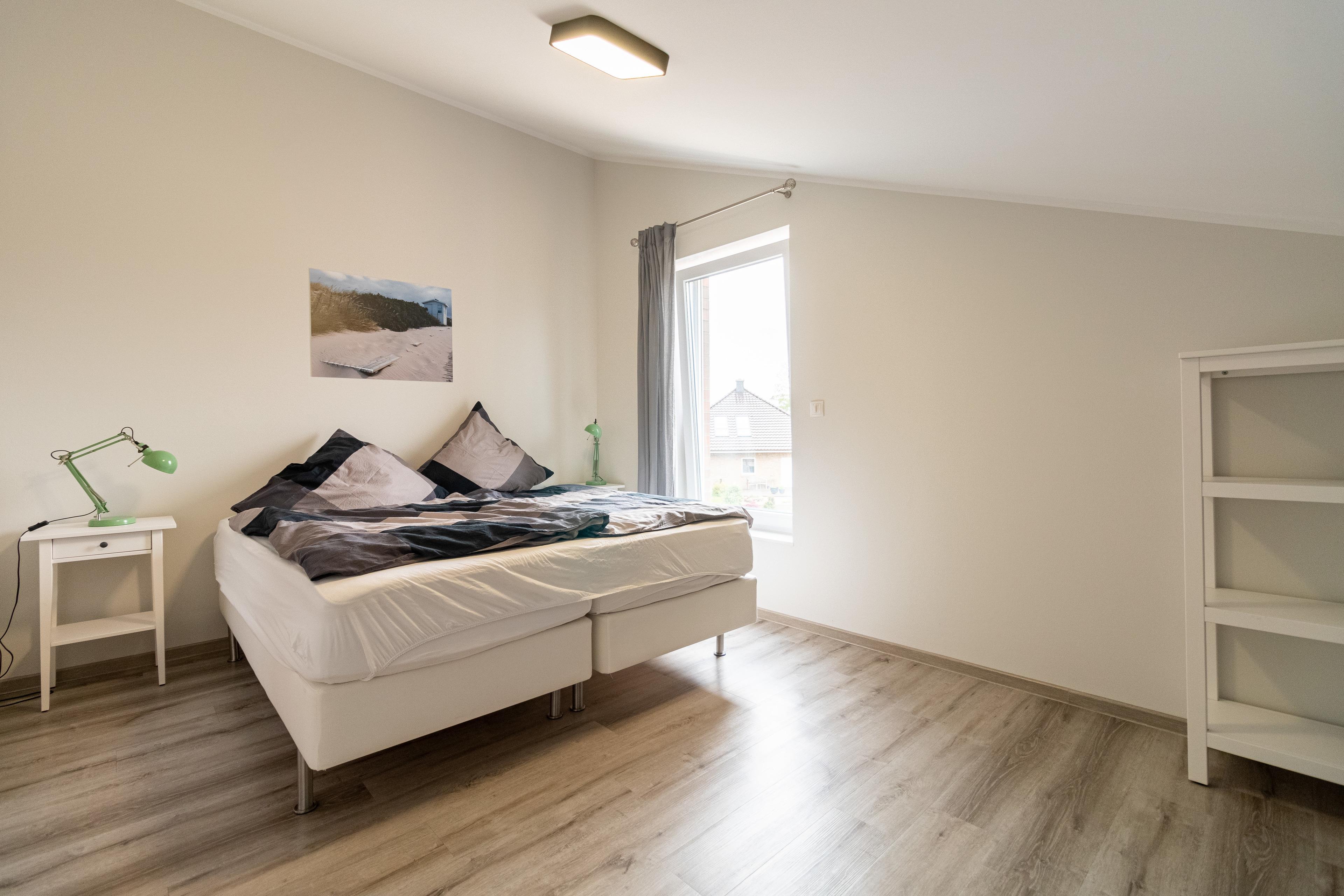 Auf der 2. Ebene befindet sich ein Schlafraum mit Komfortbetten, ein geräumiges Bad mit Fenster, Dusche u. Wanne, ein weiterer Schlafbereich mit Doppelbett, ein weiterer Wohnbereich, Hauswirtschaftsraum mit Waschmaschine und Trockner, Parkplatz am Haus und eine Strand-Fasssauna zur Nutzung nach Absprache auf dem Grundstück.