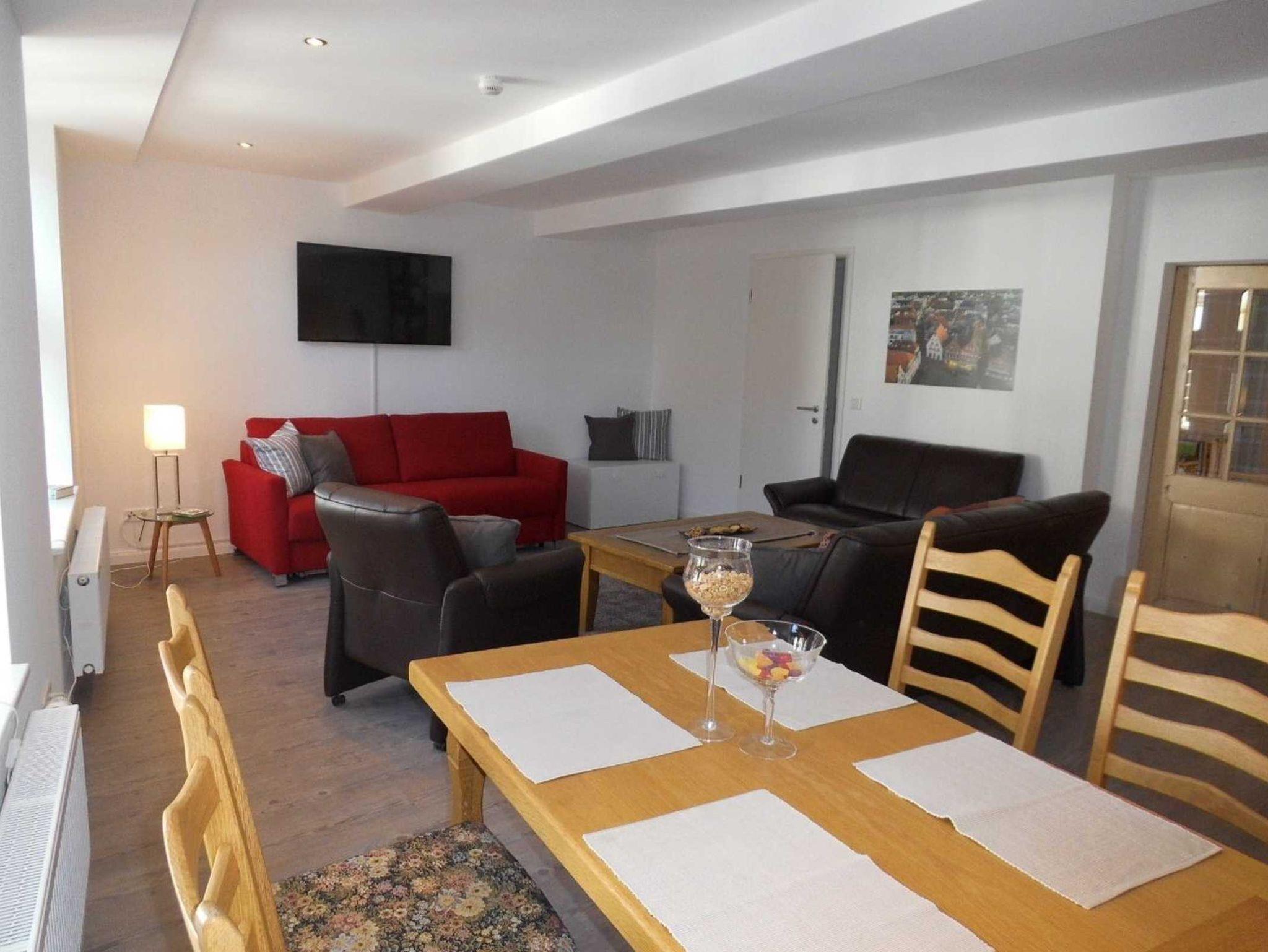 Wohnung Anna: Nichtraucher-Ferienwohnung für bis zu 6 Personen auf rund 85 qm. Die im Sommer 2018 komplett neu eingerichtete Ferienwohnung verfügt über einen Schlafraum mit Doppelbett (180 x 200 cm), einen weiteren Schlafraum mit Boxspringbett (140 x 200 cm) und ein knallrotes, zu einem vollwertigen Bett verwandelbares Sofa im Wohnzimmer (160 x 200 cm). Der hochwertig eingerichtete, geräumigen Wohn- und Schlafraum besticht durch seine großartige Aussicht über den Marktplatz und die gegenüberliegende Stadtkirche St. Dionys.Hier finden Sie neben dem bereits erwähnten Schlafsofa eine Echtleder-Polstergarnitur, einen Großbild-TV und einen Essbereich. Daran schließt sich die Einbauküche mit Herd, Backofen, Kühl-/Gefrierkombination und Spülmaschine an. Es gibt ein Bad mit Dusche und zwei separate WC-Räume. Kostenfreies WLAN ist überall vorhanden. Haustiere sind leider nicht erlaubt. Die Wohnungen befinden sich in einem der ältesten und zugleich schönsten Häuser der Stadt, einem unter Denkmalschutz stehenden, von uns kernsanierten Bürgerhaus aus der Renaissance. Namensgeber der Wohnungen sind der Rentmeister Johan Lethmate und seine Frau Anna von Beesten, die das im Jahr 1647 zerstörte Haus bereits 1649 neu errichtet hatten. Die Ems mit dem beliebten Emsradweg ist nur rund 100 Meter entfernt, zahlreiche weitere beliebte Radstrecken führen durch Rheine. Auch zum Anfang des in Rheine beginnenden Hermannshöhen-Wanderweges, der nach gut 150 km in Horn-Bad Meinberg bei den Externsteinen endet, sind es nur wenige hundert Schritte. Einkaufsmöglichkeiten, Gaststätten und Restaurants sind in nächster Nähe vorhanden. Rheine eignet sich auch hervorragend für Ausflüge in die nähere Umgebung, beispielsweise nach Münster, Osnabrück, in das Emsland oder die Niederlande.
