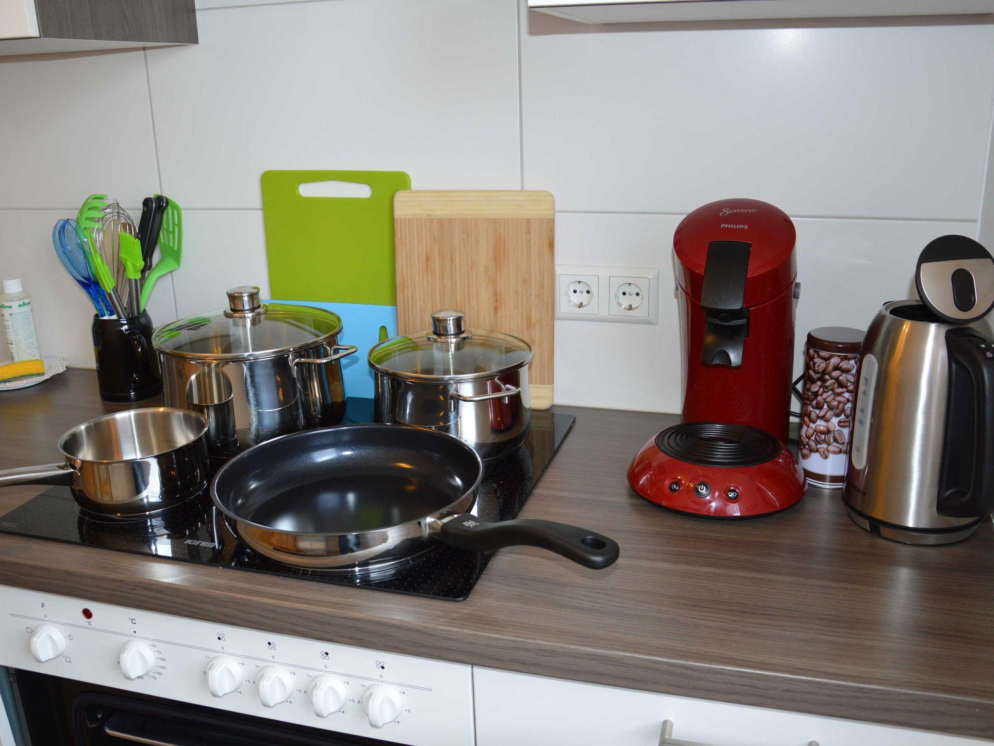 Die separate Küche ist mit Geschirrspüler, Cerankochfeld und Backofen, Kühlschrank mit Gefrierfach, Kaffeepadmaschine, Toaster, Eierkocher, Wasserkocher und dem notwendigen Geschirr ausgestattet.