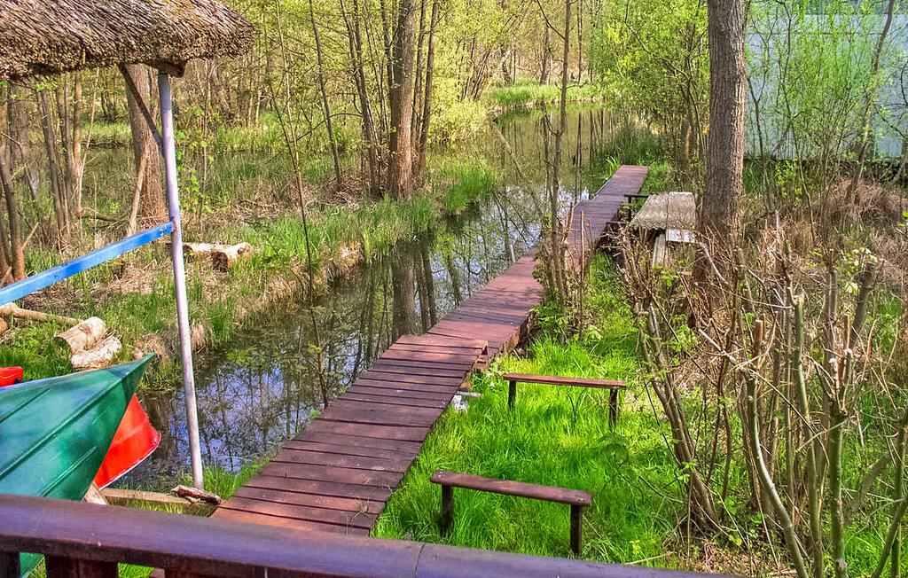 Feriehuset ligger helt adskilt på ejerens store beboelsesejendom direkte ved Bäke, en vandforbindelse, hvorigennem man kan nå Kagar-søen med båd på cirka 300 m. Bedste forhold for vandvandrere. Feriehuset har en stue (polstrede møbler, satellit-tv, radio), soveværelse ovenpå (dobbeltseng, 2 liggestole), køkken med spisekammer, bad/toilet, balkon, terrasse, natvarmer. En robåd, 2 padlebåde, cykler og en grill er til fri afbenyttelse. Den samlede pris inkluderer slutrengøring, sengetøj, vand og energi. Medbring venligst dine egne håndklæder. Betales på stedet: turistskat. En lille hund op til en højde på 40 cm er tilladt i denne ejendom. Ejeren tillader ikke katte. Kagar er en smukt beliggende landsby i Rheinsbergs lille sølandskab, cirka 11 km nordvest for Rheinsberg. Restaurant, indkøb og kanoudlejning i byen, badeplads ca 1,4 km.