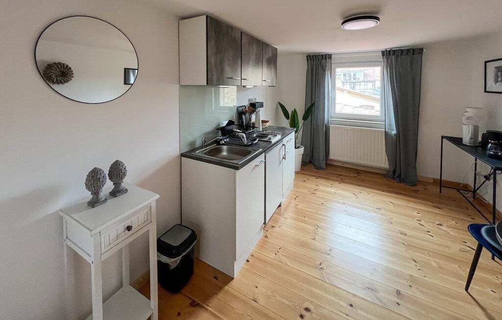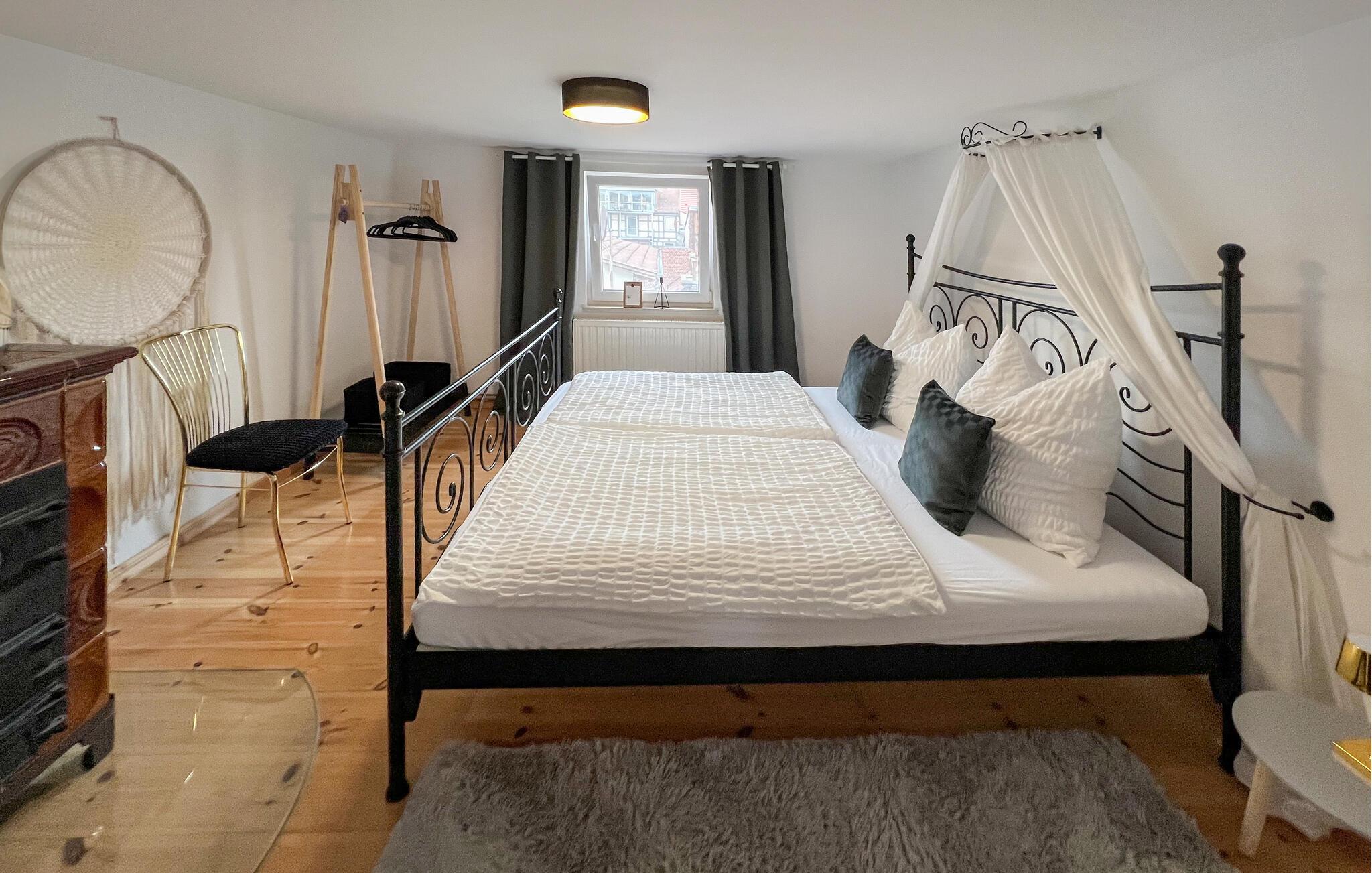 Den cirka 73 kvm store lejlighed på øverste etage (BEMÆRK: lav loftshøjde på ca. 2,10 m) til 2 voksne (tilgængelig via trapper) er udstyret med stue (sofa, fladskærms-tv) , et soveværelse, et separat køkken (spisebord, elektriske kogeplader, køleskab med fryser, brødrister, elkedel, kaffemaskine) og et badeværelse (bruser, toilet, hårtørrer). Denne lejlighed har et opholdsområde og et opholdsområde i gården. Da dette er et gammelt hus, skal du være opmærksom på de lave loftshøjder, især på øverste etage (2,10 m). Ved tilmelding kan morgenmad indtages på en café få skridt væk mod et gebyr. En gratis parkeringsplads kan benyttes direkte foran huset, og yderligere parkeringspladser (mod betaling i dagtimerne fra kl. 9.00 til 18.00) kan gratis findes direkte på gaden eller få skridt væk i området. Du kan stoppe foran huset for at læsse og losse.