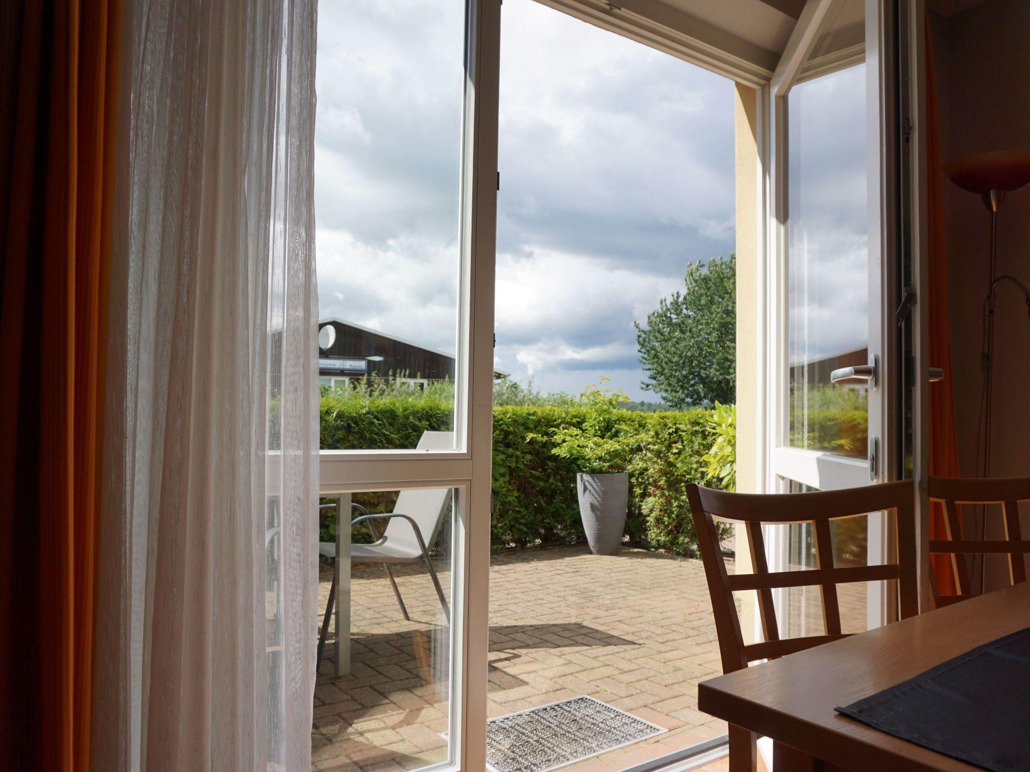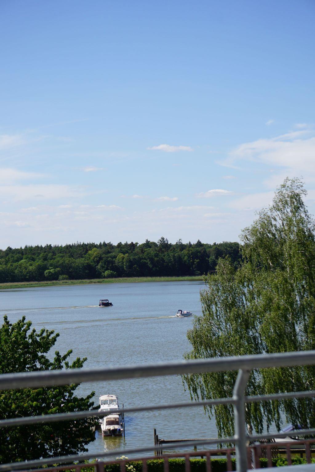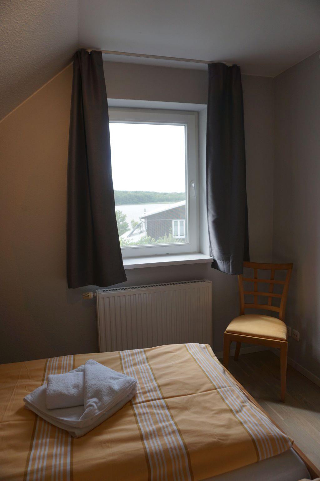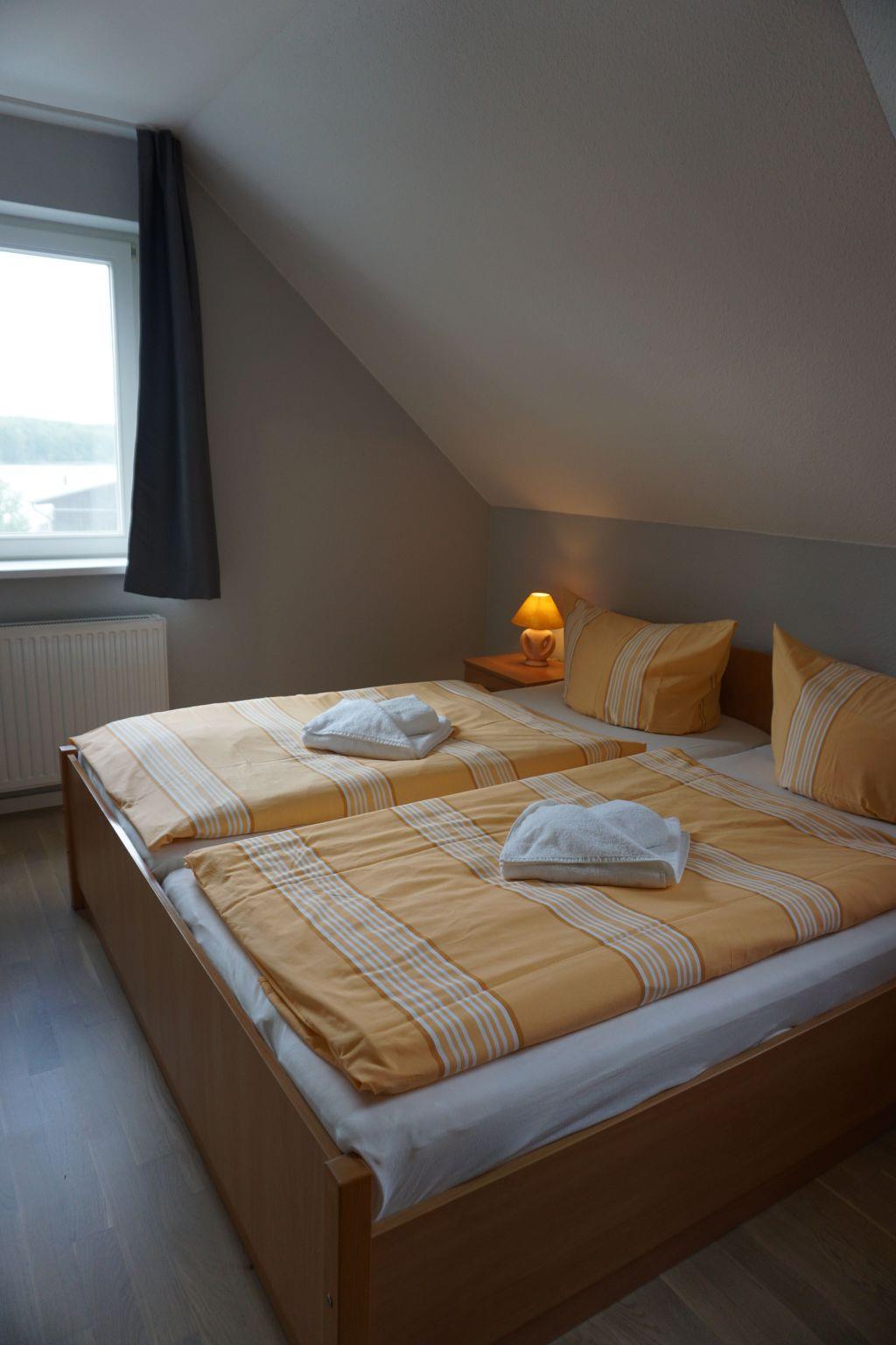 The maisonette flat is located in the neighbouring building. The size of this maisonette is 80 m² and has a living area with living room and open-plan kitchen, three bedrooms, which are reached by a spiral staircase, and a bathroom. Two bedrooms are furnished with two double beds (190 cm x 200 cm each) and the third has a bunk bed with two single beds (90 cm x 180 cm). You have a direct view of the lake from the bedrooms on the 1st floor. The kitchen is fully equipped with an oven, freezer, hob, fridge, dishwasher, toaster and kettle. In the living area you will find a seating area with chairs and a table and a sofa set. Here you can listen to music on the stereo system and use the flatscreen TV. The fireplace in the living area adds to the cosiness. The bathroom has a shower, washbasin and WC.