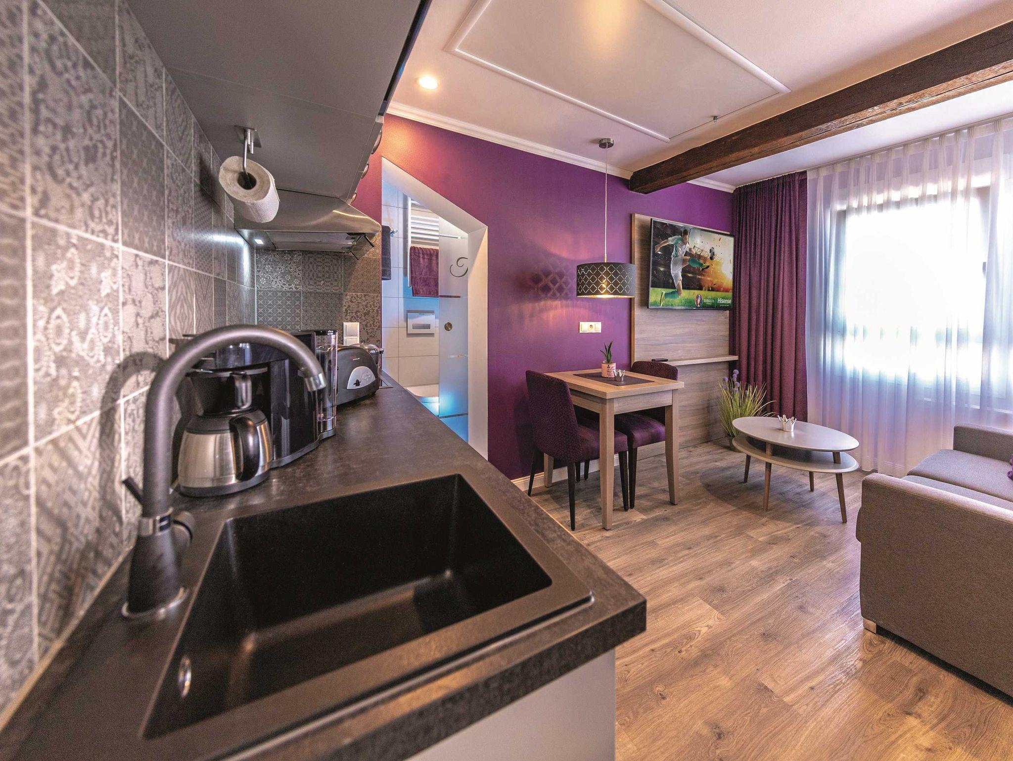 Im Haus Burgenheimat befinden sich 8 Apartments: 2 Princesize-Apartments (20 - 30 m²), 1 Queensize-Studioapartment (25 m²), 2 Queensize-Apartments (30 - 40 m²) und 3 Kingsize-Apartments (40 - 50 m²). Schlafen Sie wie ein König in den komfortablen überlangen Boxspringbetten (2,20 m) der Premium-Marke Royal Bedding®. Die Bettbreite beträgt in den Princesize-Apartments 1,00 m, in den Queensize-Apartments 1,60 m und in den Kingsize-Apartments 2,00 m. Alle Betten haben eine durchgängige extrahohe Matratze für besonderen Schlafkomfort. Im ?Thronsaal?, dem modernen Badezimmer, erwartet Sie ein WC mit integrierter Lüftung, ein stilvolles Waschbecken und eine bodengleiche Dusche mit Regenbrause und Handbrause. Die Küche ist mit allem, was man braucht, ausgestattet. Bereiten Sie sich z.B. ein leckeres Frühstück mit dem Tefal Toast'n'Egg und brühen sich Ihren Kaffee mit der Senseo Switch entweder mit Filter oder mit Kaffeepad. Auf dem 4-Platten-Cerankochfeld lassen sich auch komplette Menüs zubereiten. Eine Mikrowelle mit Grillfunktion sorgt für Essen in Minutenschnelle. Und damit der Abwasch nicht lästig wird, steht eine kompakte Geschirrspülmaschine bereit. Durchdachte Annehmlichkeiten erwarten Sie in jedem Raum der Apartments: ein digitaler Türspion, USB-Anschlüsse an den Leuchten am Bett sowie am Schreibtisch, eine integrierte Toilettenlüftung, eine bodengleiche Dusche mit Regenbrause, ein Laptop-Safe, überlange Betten, extrahohe Matratzen, große UHD-Smart-TVs, vollausgestattete Küche inkl. kompaktem Geschirrspüler. Neben der Selbstverpflegung besteht die Möglichkeit am Frühstücksbuffet des Hotels teilzunehmen. Als Gast erhalten Sie außerdem für die Dauer Ihres Aufenthalts ein kostenfreies Gästeticket für die Nutzung des ÖPNV im Gebiet des VRM.
