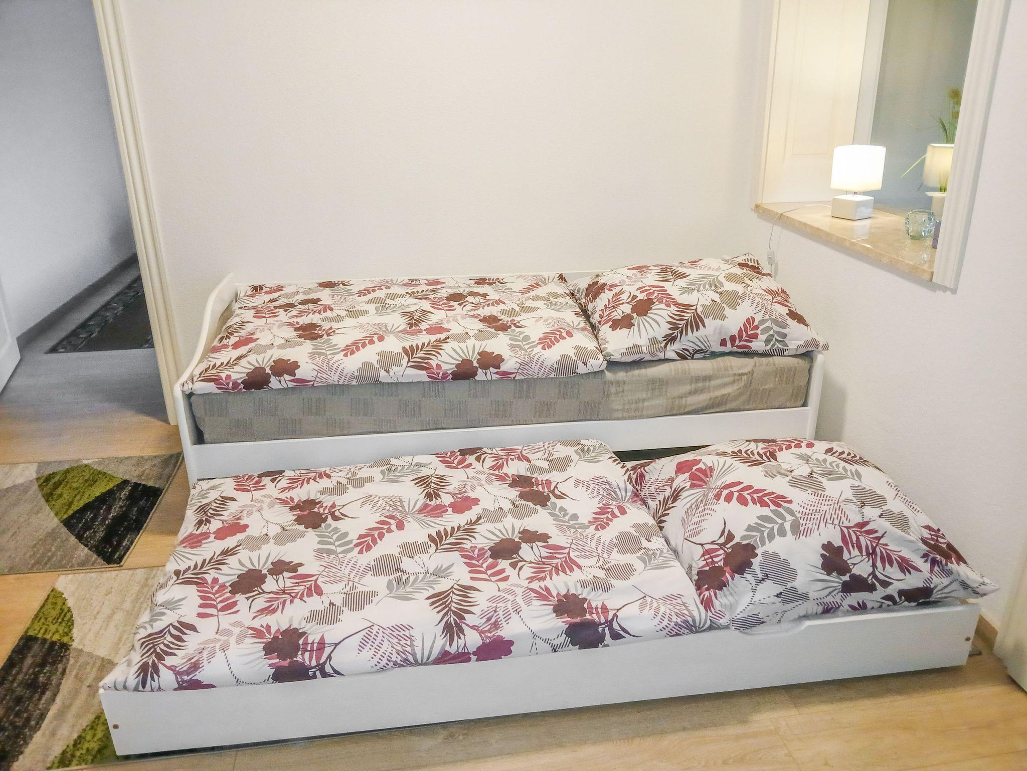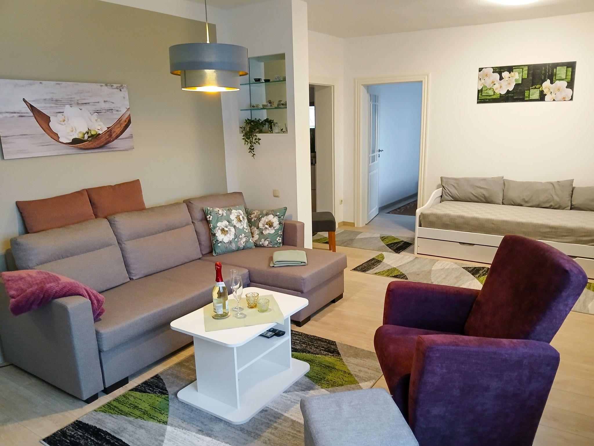 Die Ferienwohnung Kleine Auszeit bietet auf großzügigen 80 m² Platz für bis zu 3 Personen und 1 Kind bis 12 Jahren. Im Wohnzimmer könnt ihr es euch auf einem gemütlichen Sofa bequem machen, den TV einschalten oder einfach die Zeit miteinander genießen. Für zusätzliche Schlafmöglichkeiten sorgt das Tandembett (2x90x195), das ideal für eine erholsame Nachtruhe ist. Das Schlafzimmer ist mit einem komfortablen Doppelbett (180x200) ausgestattet und ein Kleiderschrank bietet ausreichend Stauraum für eure Kleidung.