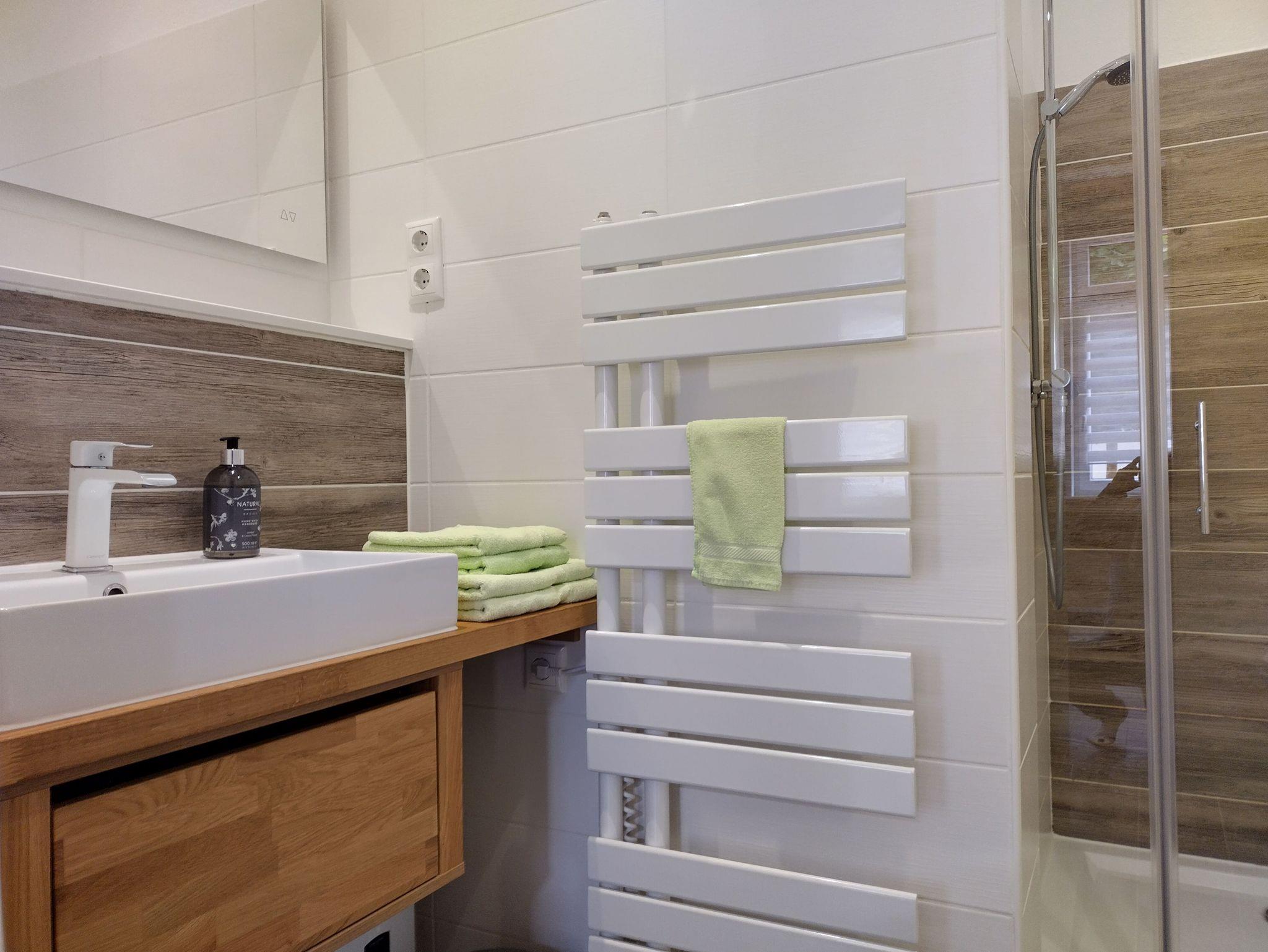 Die Ferienwohnung besteht aus einem großen Wohn-/Schlafbereich mit einer offenen Küche, einem Badezimmer mit WC und Dusche, einem Essbereich mit Tisch und 2 Stühlen und einer Garderobe.