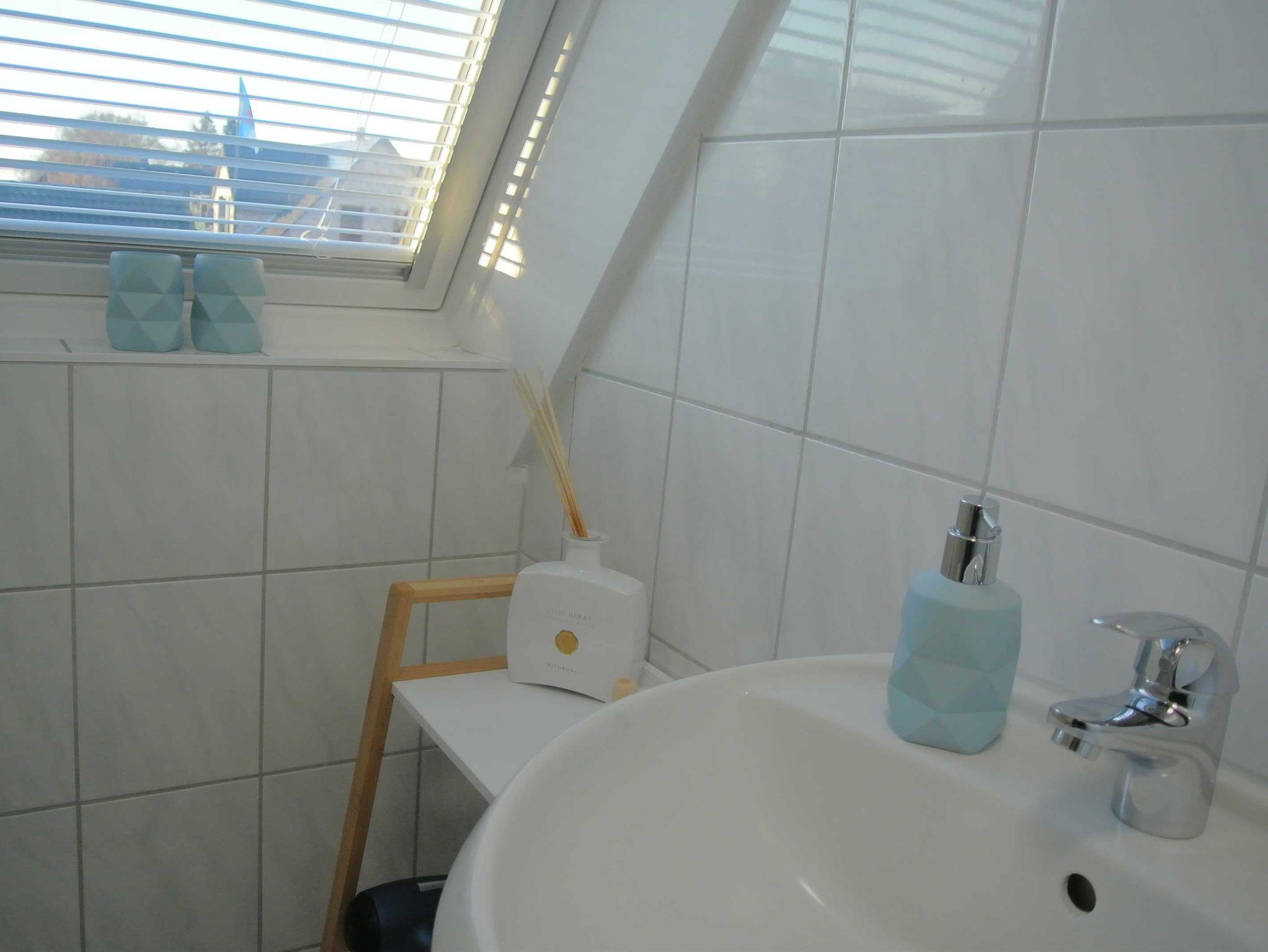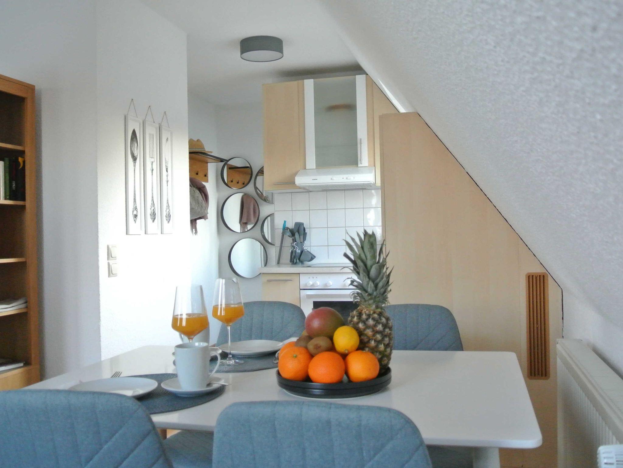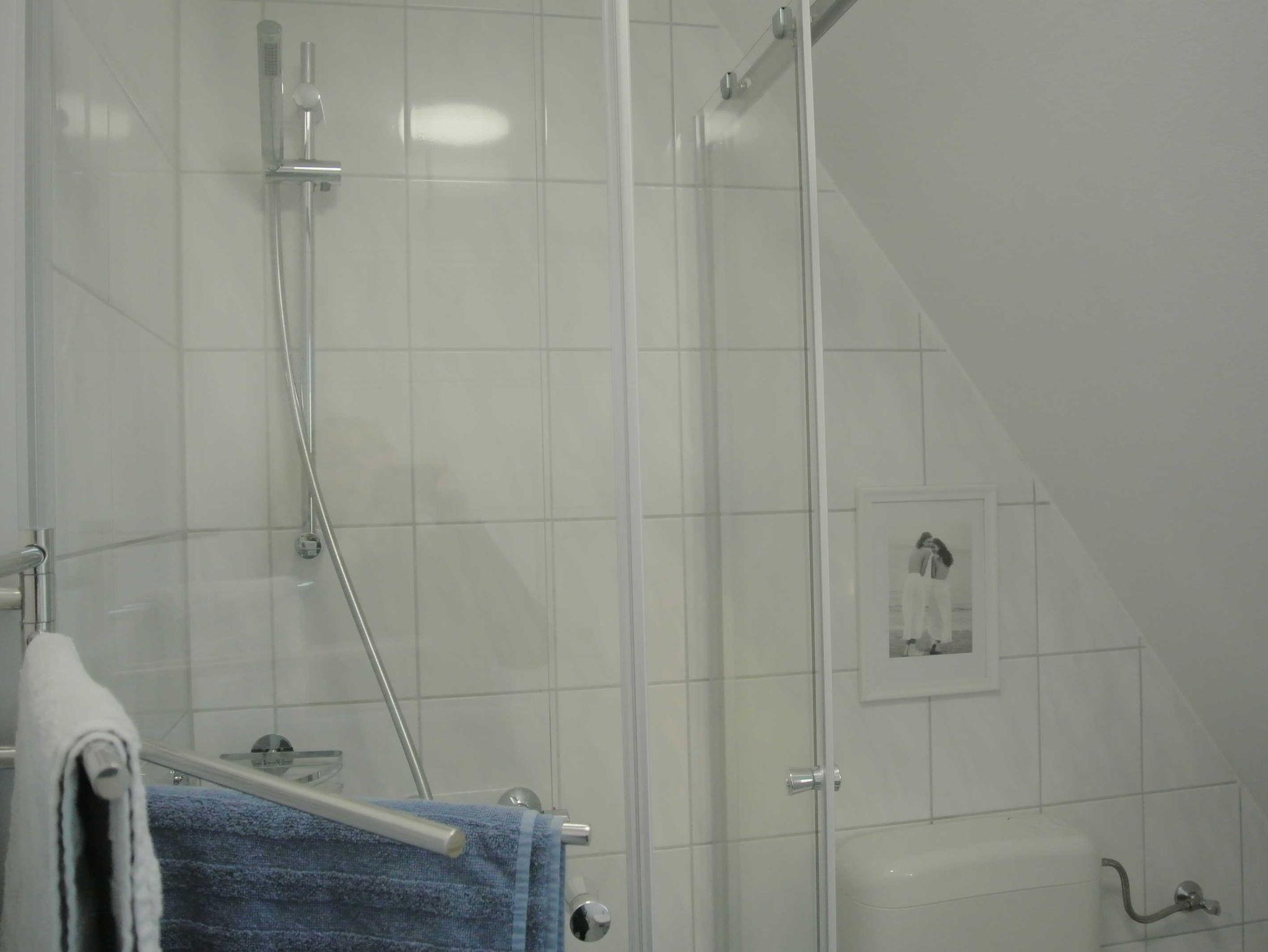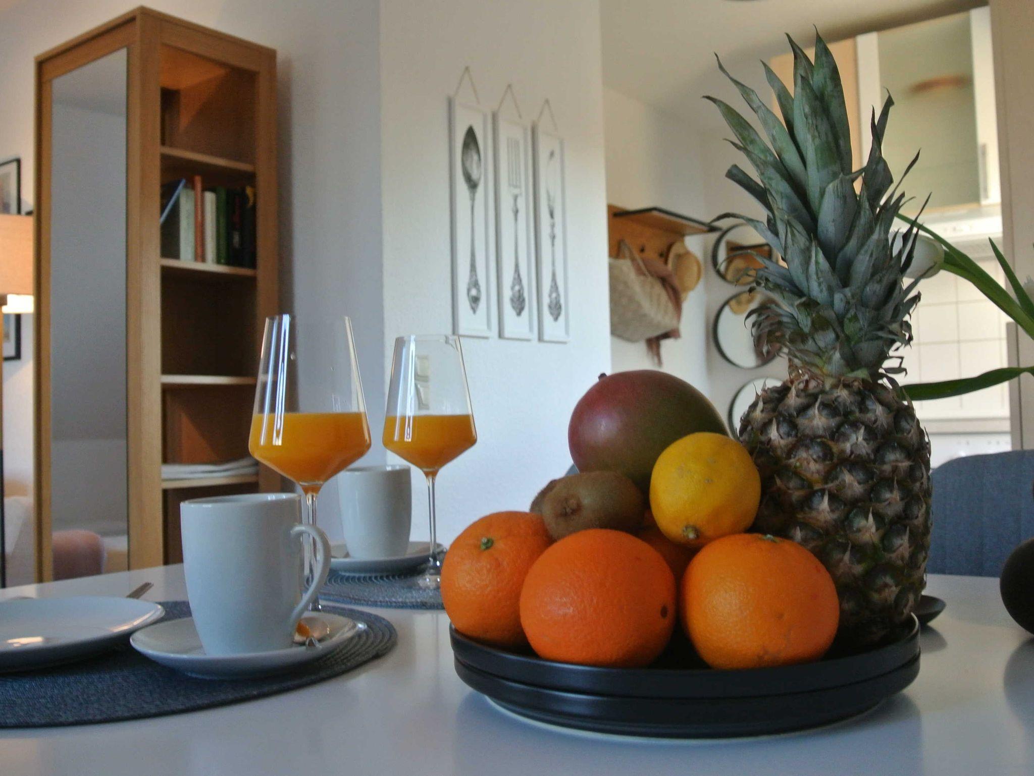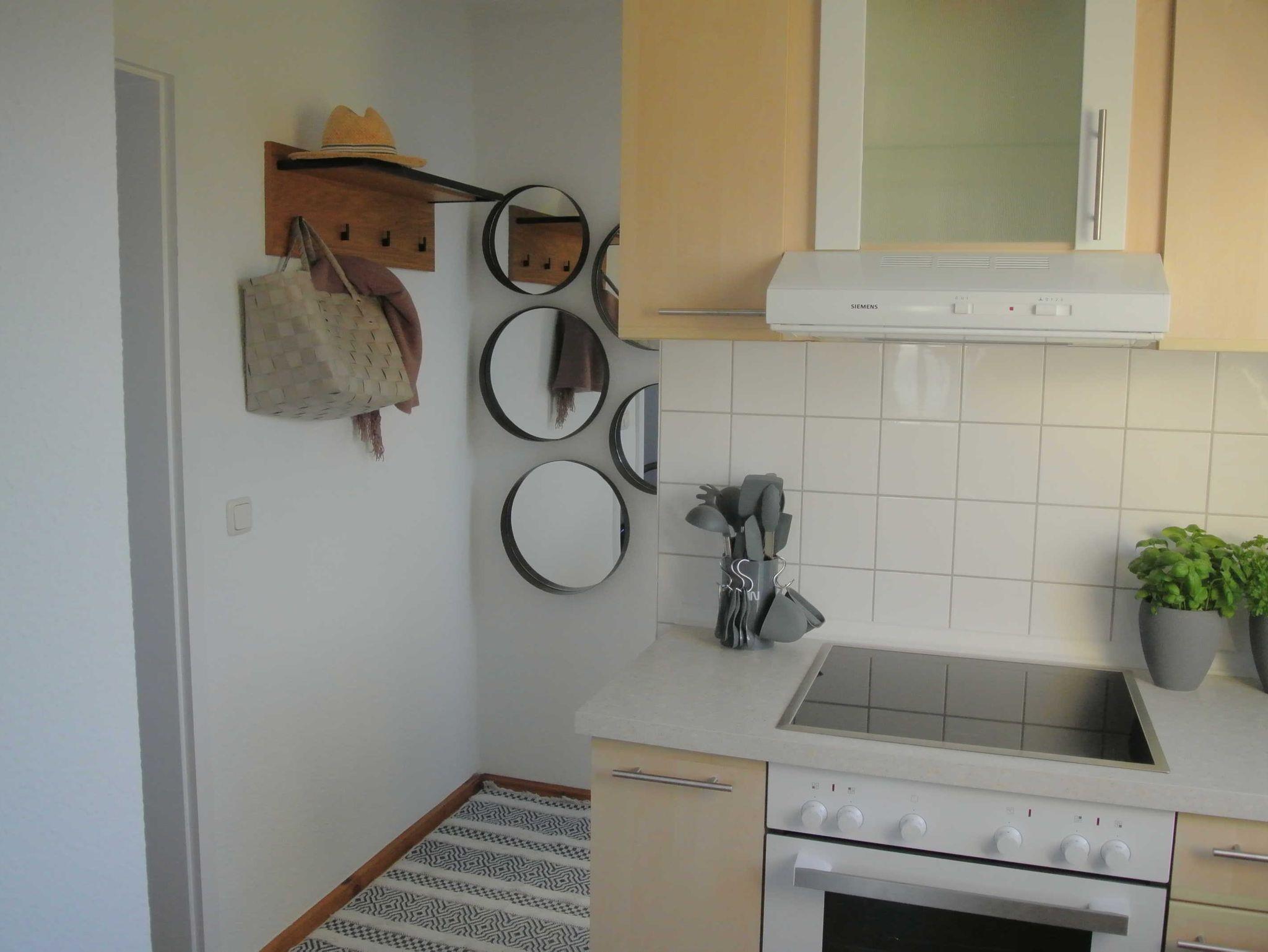 Das Badezimmer ist mit Dusche/WC und Haartrockner ausgestattet. Die offene Küche bietet unter anderem Kaffeemaschine, Wasserkocher, Toaster, Geschirrspüler, Kühlschrank mit Gefrierfach, Cerankochfeld und Backofen.