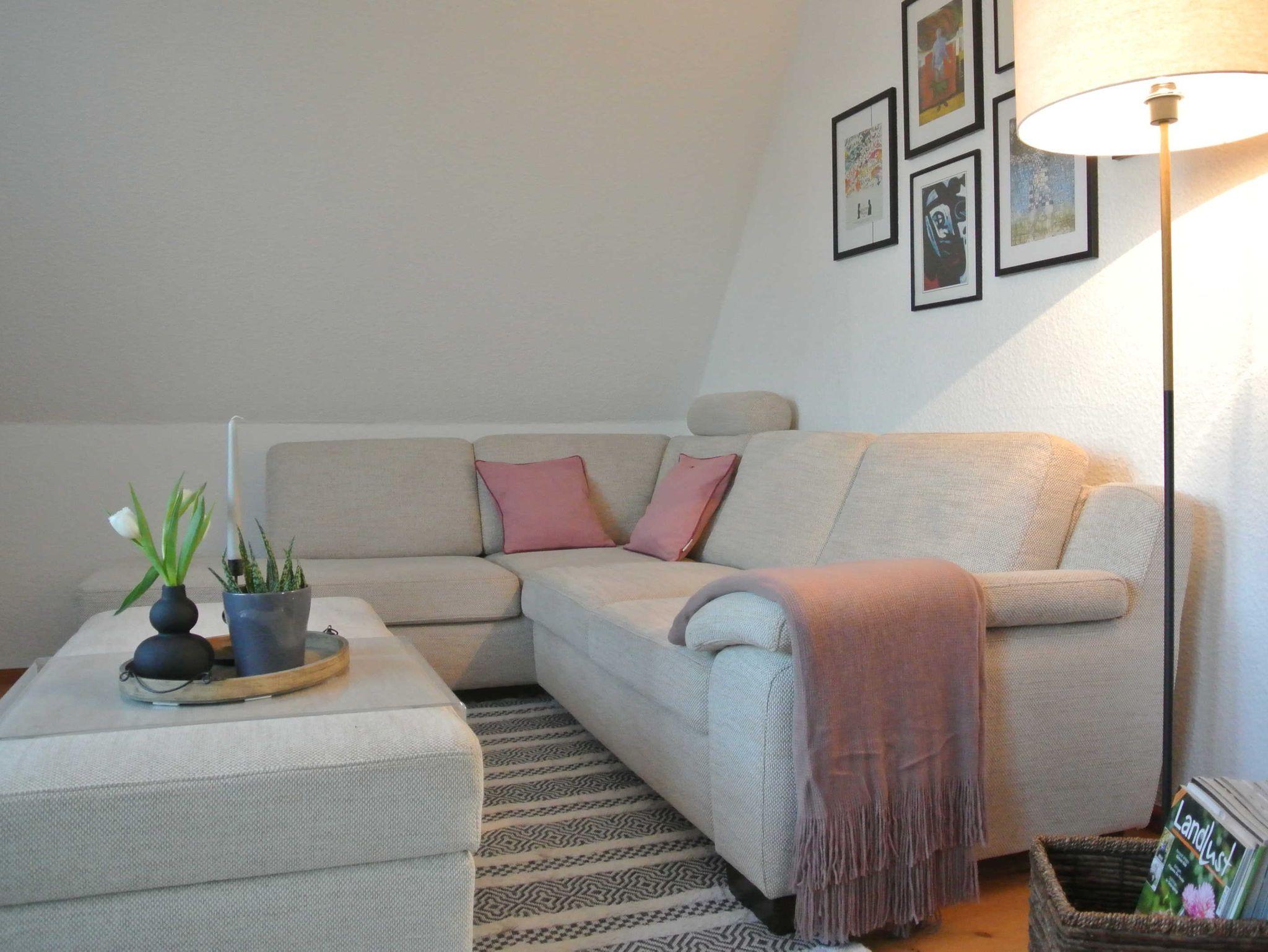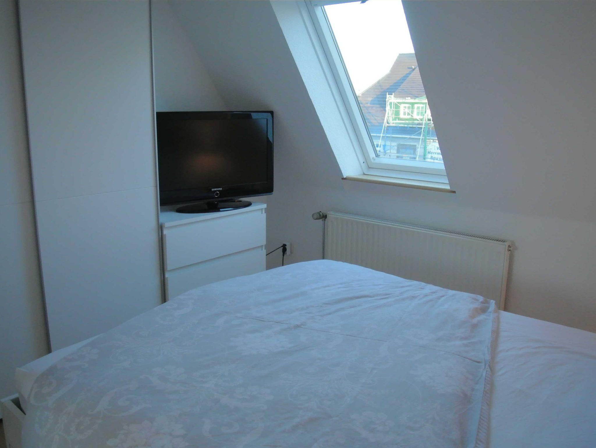 Die Ferienwohnung für max.zwei Personen ist aufgeteilt in ein Schlafzimmer mit Doppelbett und Fernseher, einen kombinierten Wohn- und Küchenbereich mit Sofa und Smart-TV, ein Badezimmer und einen Balkon.