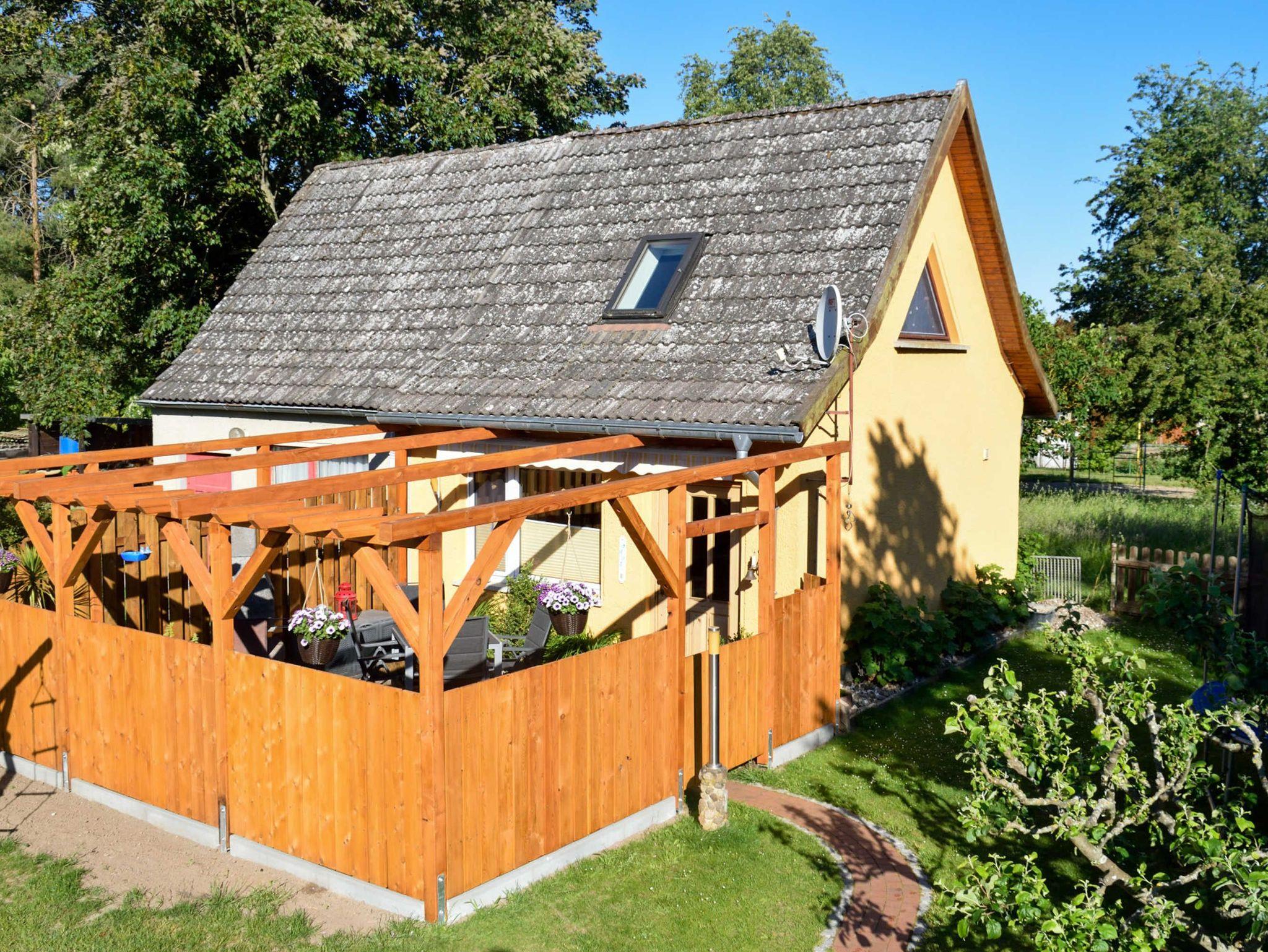 Zum Ferienhaus gehören eine Terrasse mit Sitzgruppe und Grill sowie ein PKW-Stellplatz.