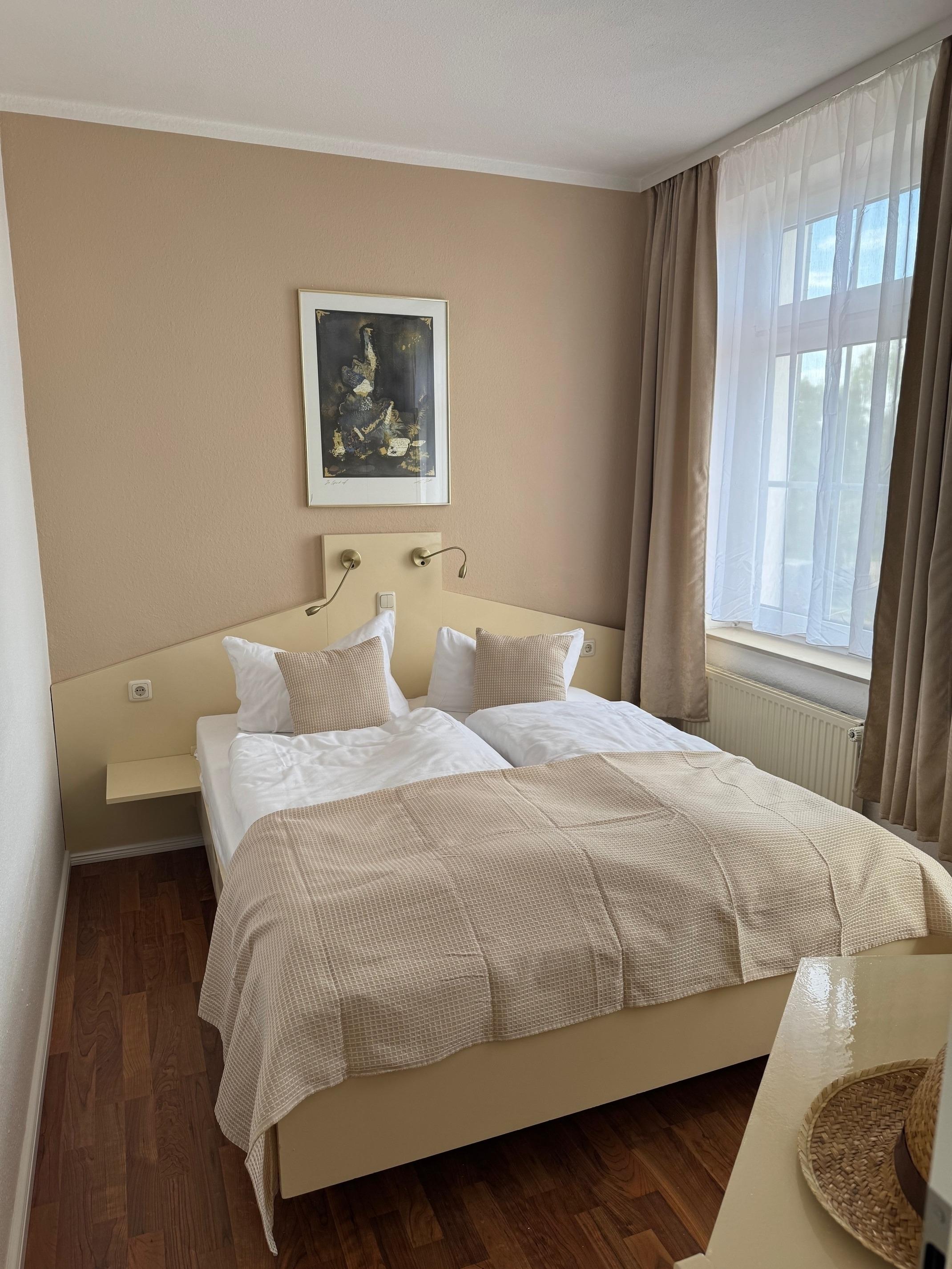 Im nebenan gelegenen Raum befindet sich das separate Schlafzimmer mitsamt einem Doppelbett.