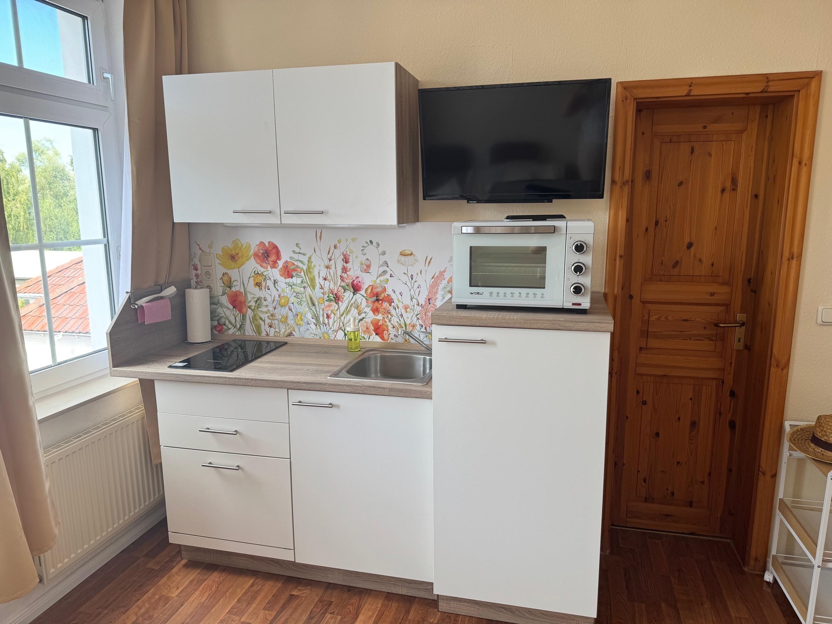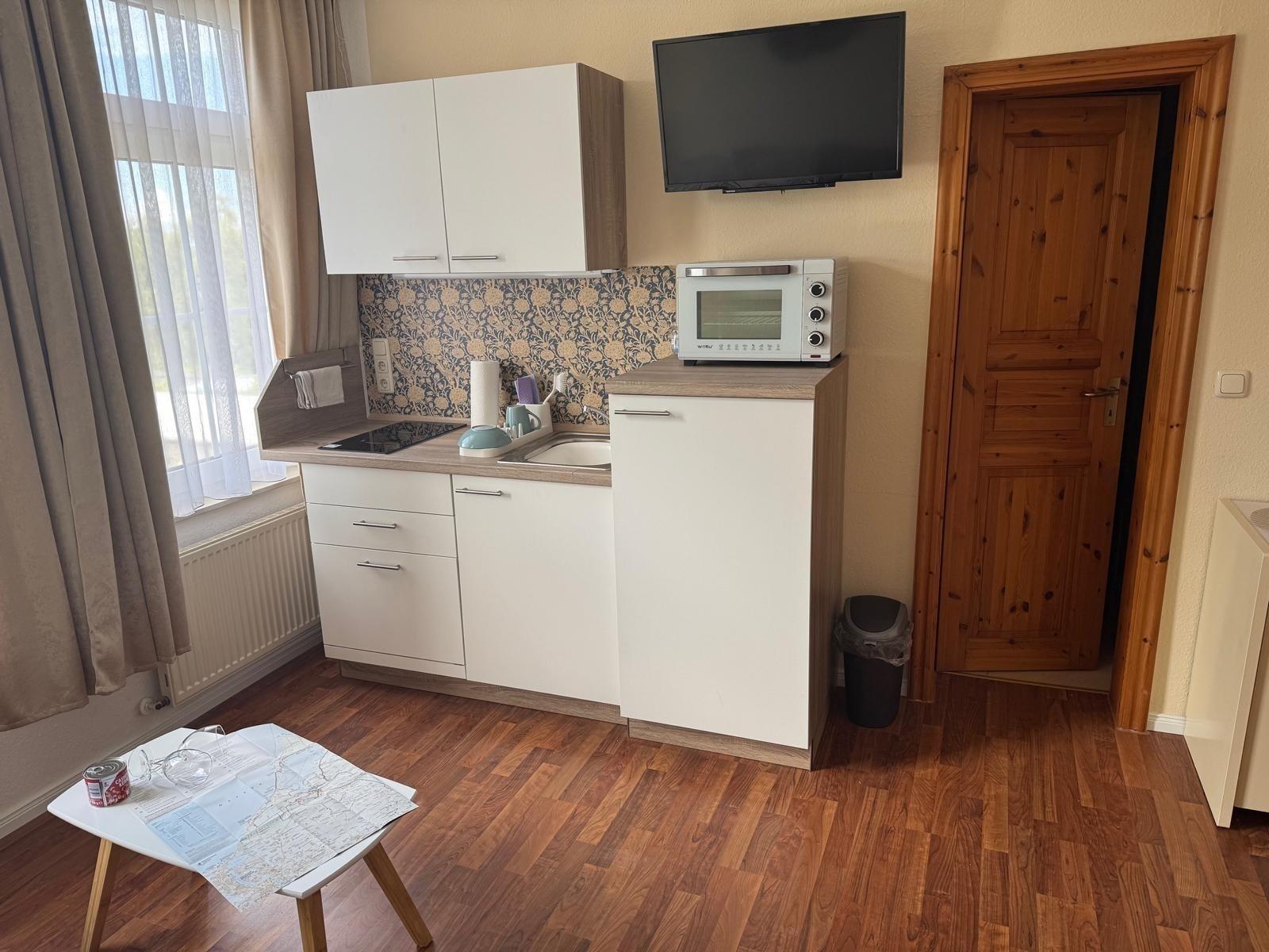 Die offene Küchenzeile umfasst folgendes: Spülbecken, Zwei- Platten-Induktionsfeld, Kühlschrank mit Gefrierfach, Wasserkocher, Mini-Backofen, Kaffeemaschine sowie das Grundzubehör an Küchenutensilien.
