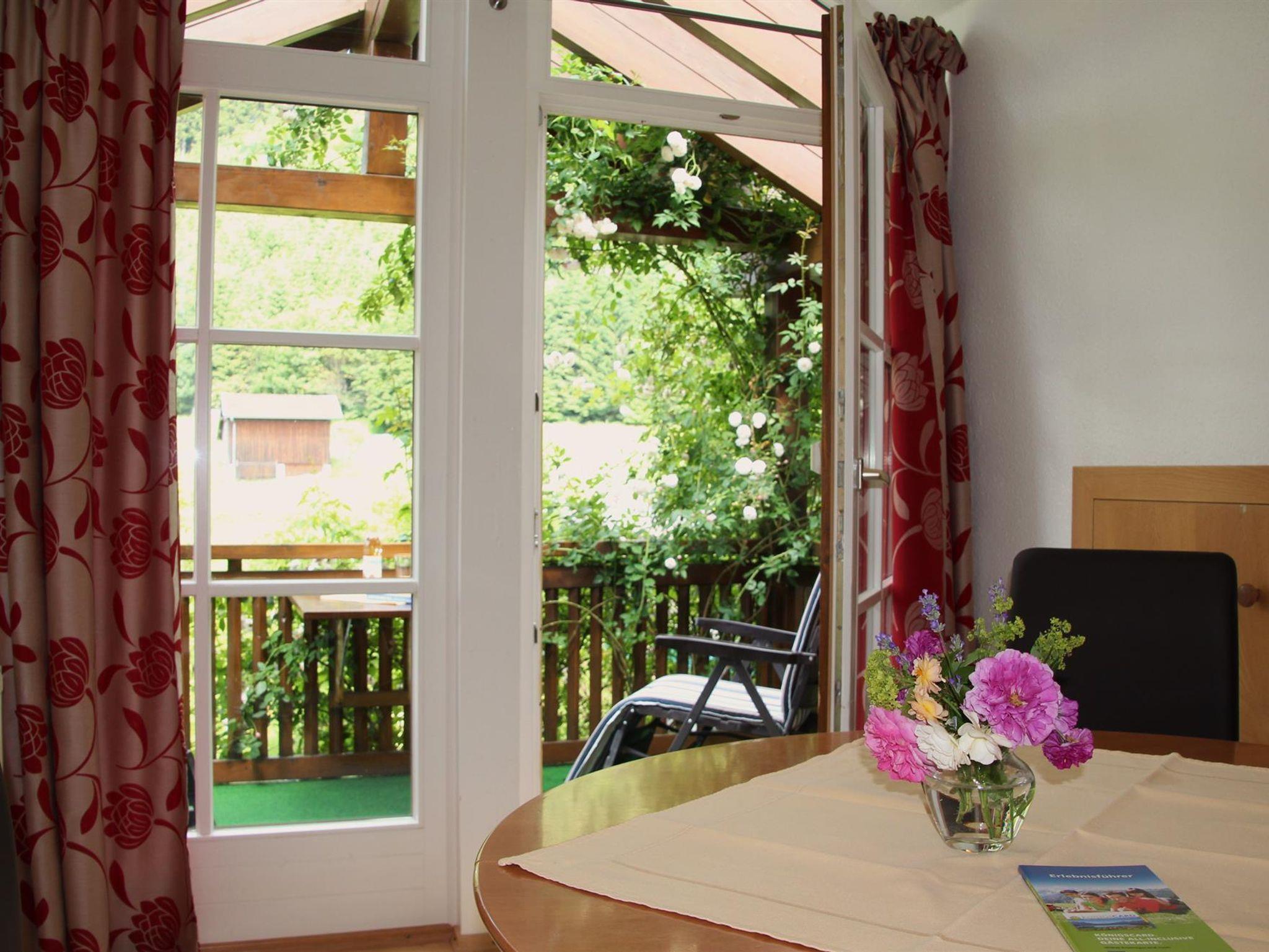 Genießen Sie die entspannende Ruhe in der Nachmittagssonne mit Blick auf herrliche Wiesen und Wald und ab und zu besuchen uns auch die Rehe.