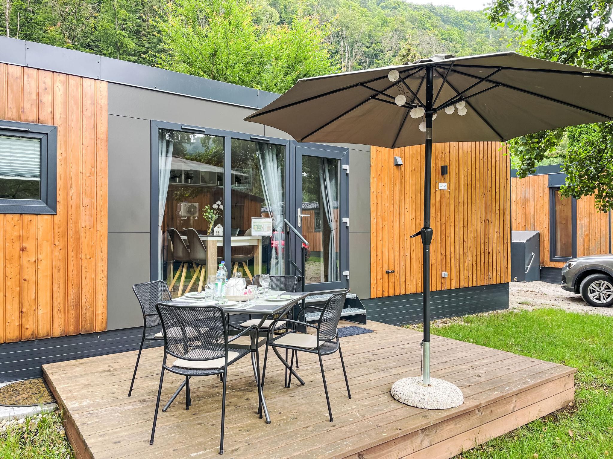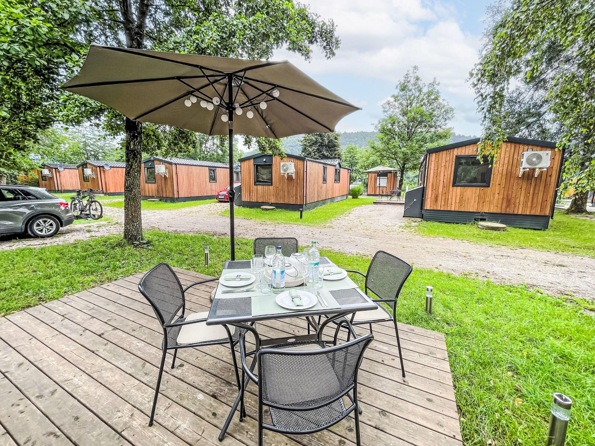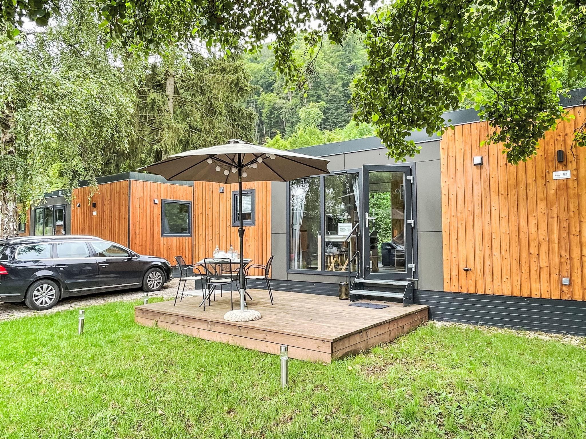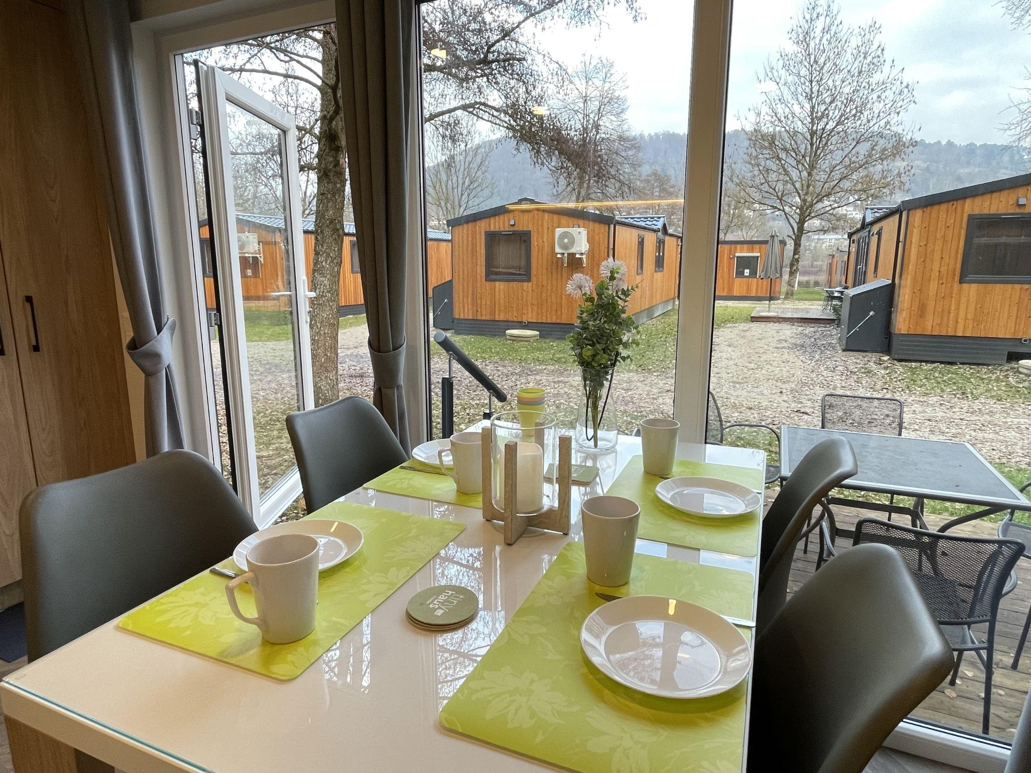 "Tiny Haus SMALI", 3-room mobile home 32 m2. Cosy furnishings: living/sleeping room with (120 cm, length 170 cm), satellite TV. Exit to the terrace. 1 room with 1 french bed (140 cm, length 190 cm). 1 room with 2 beds (70 cm, length 190 cm). Open kitchen (4 ceramic glass hob hotplates, toaster, kettle, freezer, electric coffee machine). Shower, sep. WC. Electric heating. Small terrace. Terrace furniture. Facilities: mosquito net. Internet (WiFi, free). Parking at the house. Please note: non-smoking house. Mobile air cooling unit available.