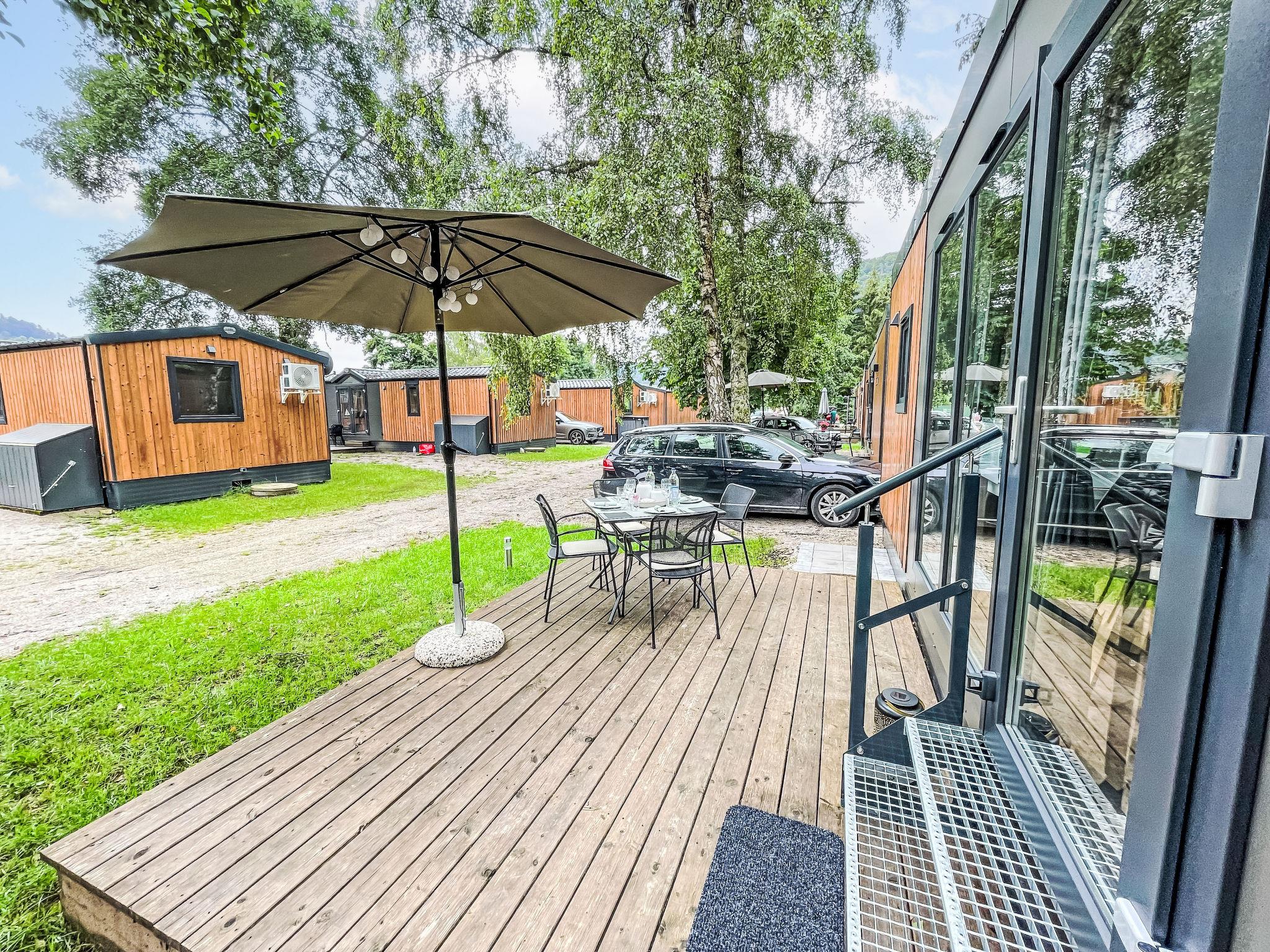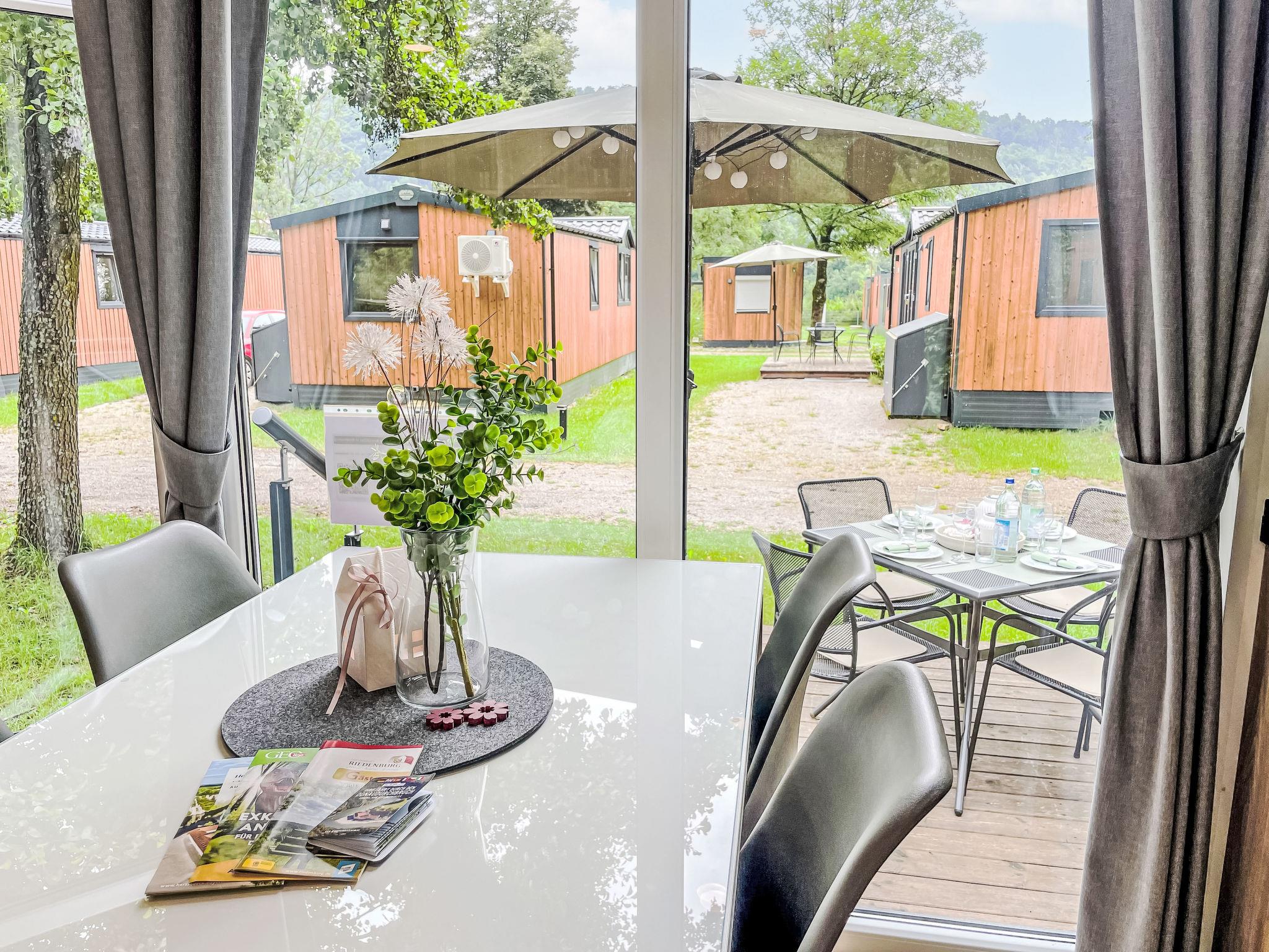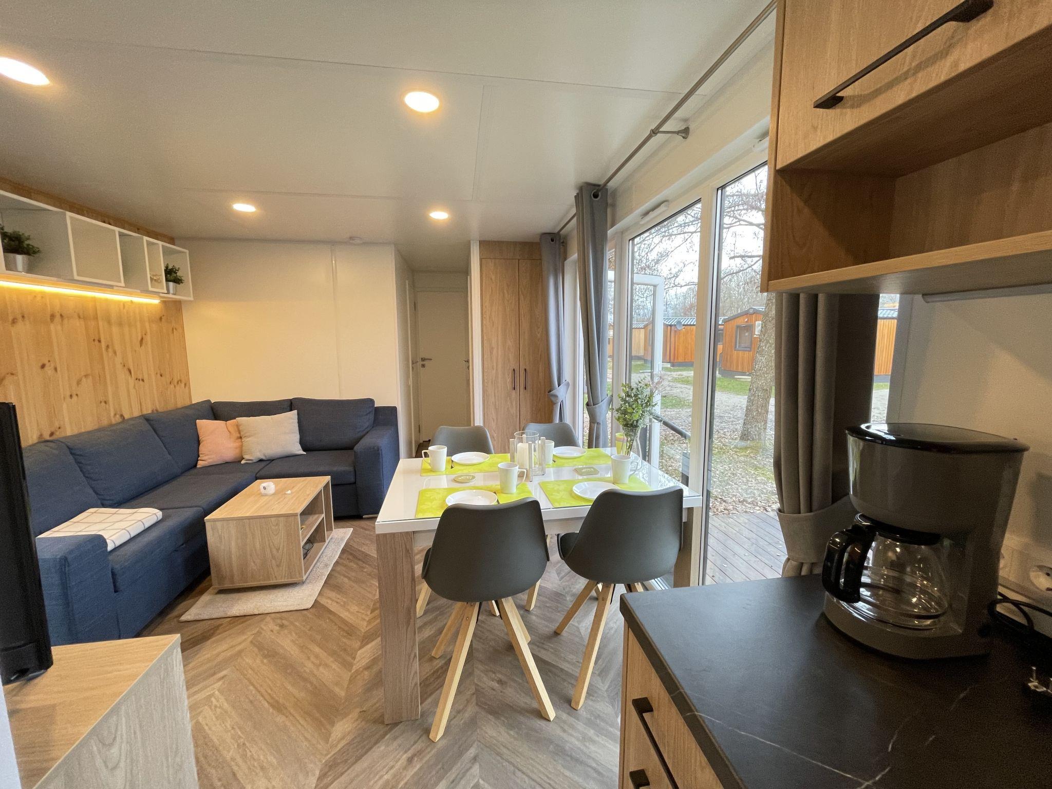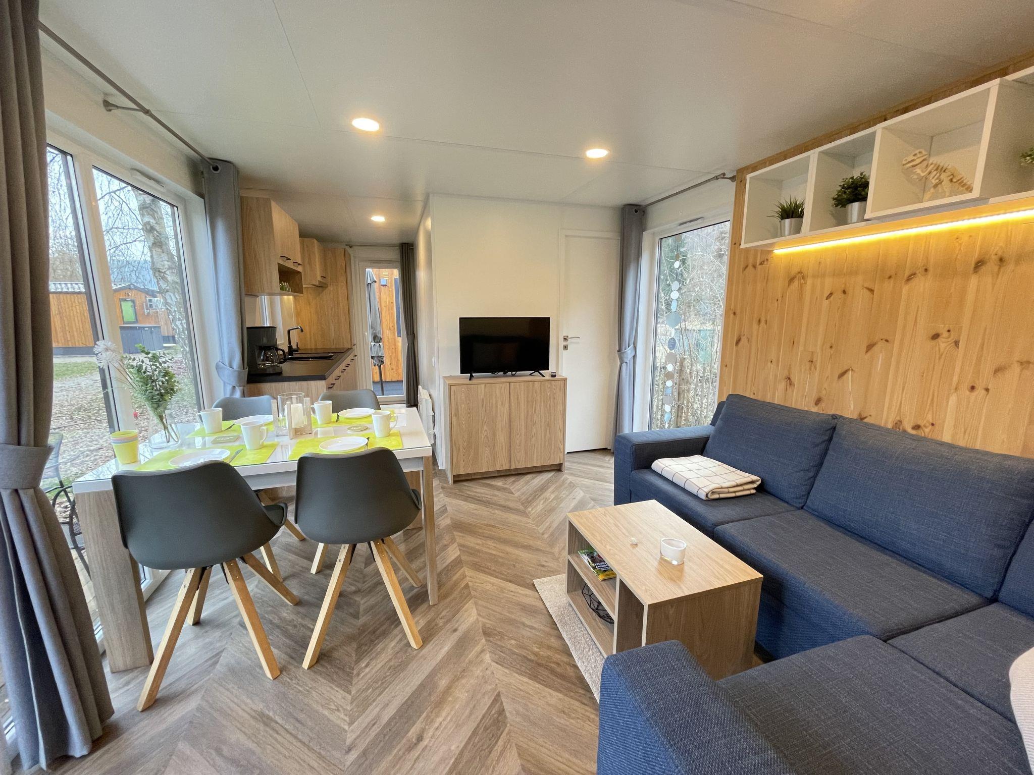 "Tiny Haus SMALI", 3-room mobile home 32 m2. Cosy furnishings: living/sleeping room with (120 cm, length 170 cm), satellite TV. Exit to the terrace. 1 room with 1 french bed (140 cm, length 190 cm). 1 room with 2 beds (70 cm, length 190 cm). Open kitchen (4 ceramic glass hob hotplates, toaster, kettle, freezer, electric coffee machine). Shower, sep. WC. Electric heating. Small terrace. Terrace furniture. Facilities: mosquito net. Internet (WiFi, free). Parking at the house. Please note: non-smoking house. Mobile air cooling unit available.
