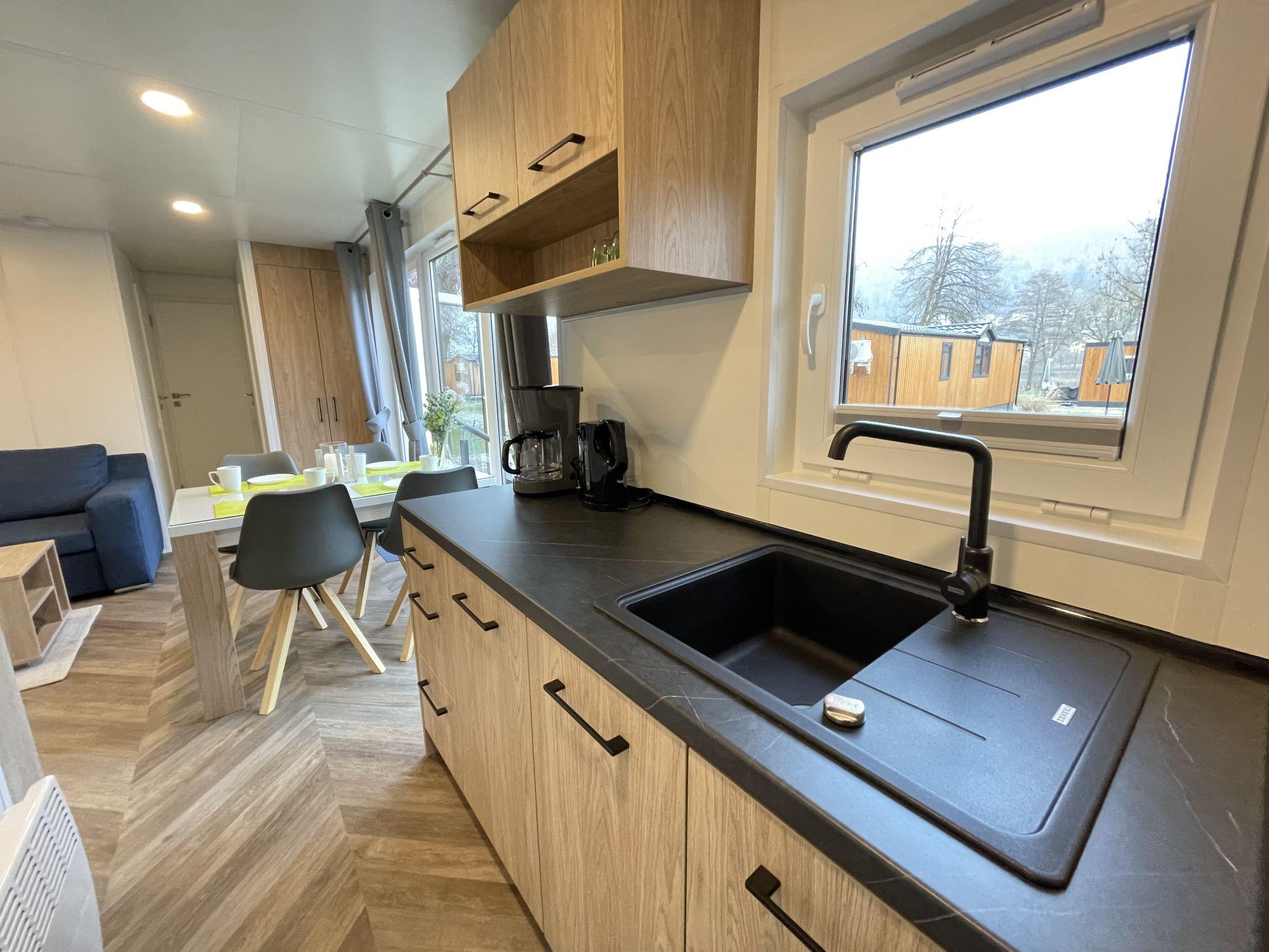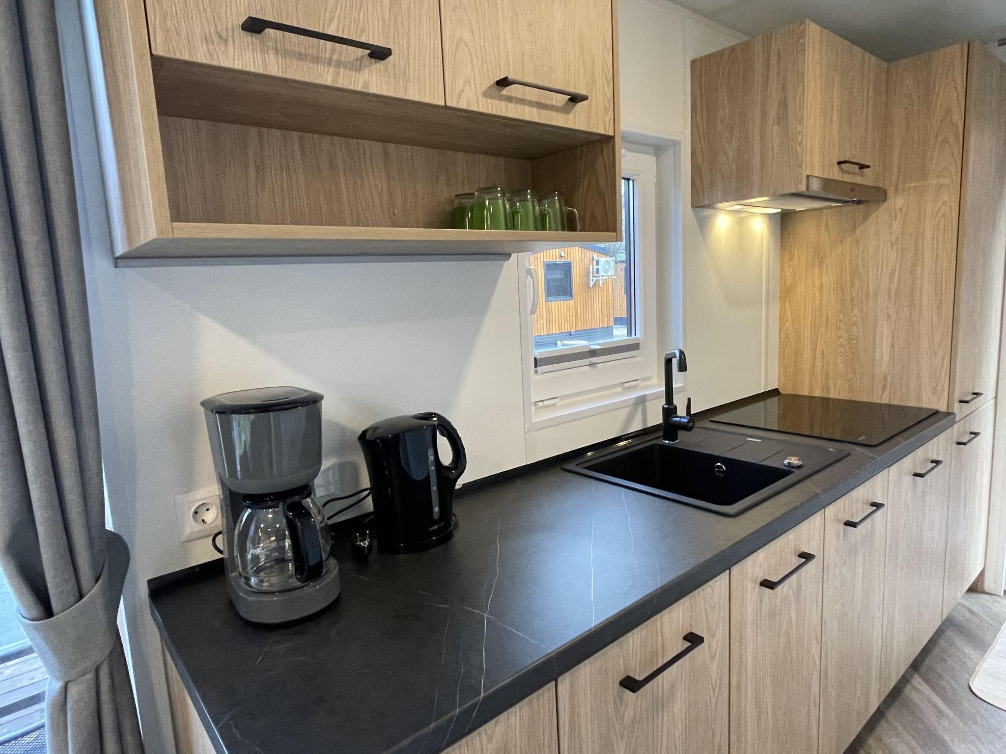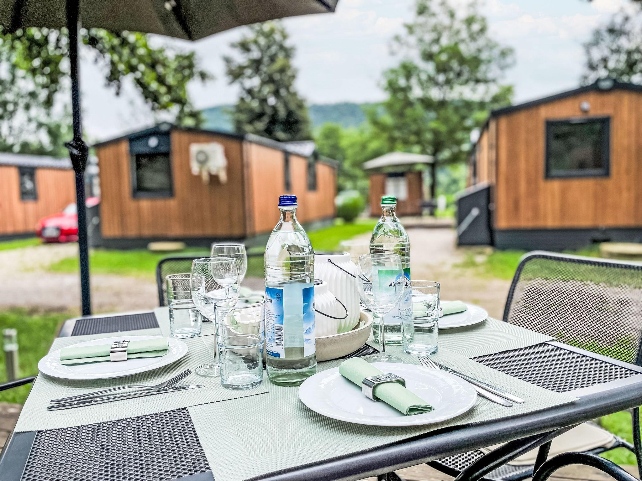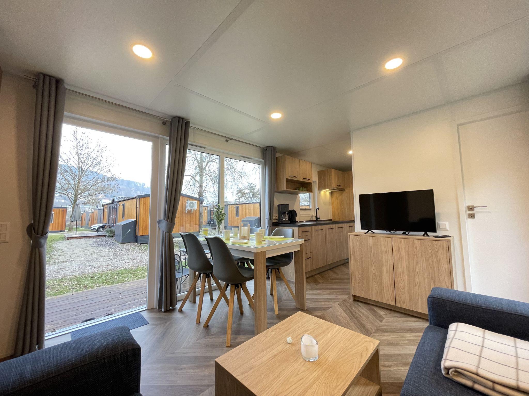 "Tiny Haus SMALI", 3-room mobile home 32 m2. Cosy furnishings: living/sleeping room with (120 cm, length 170 cm), satellite TV. Exit to the terrace. 1 room with 1 french bed (140 cm, length 190 cm). 1 room with 2 beds (70 cm, length 190 cm). Open kitchen (4 ceramic glass hob hotplates, toaster, kettle, freezer, electric coffee machine). Shower, sep. WC. Electric heating. Small terrace. Terrace furniture. Facilities: mosquito net. Internet (WiFi, free). Parking at the house. Please note: non-smoking house. Mobile air cooling unit available.