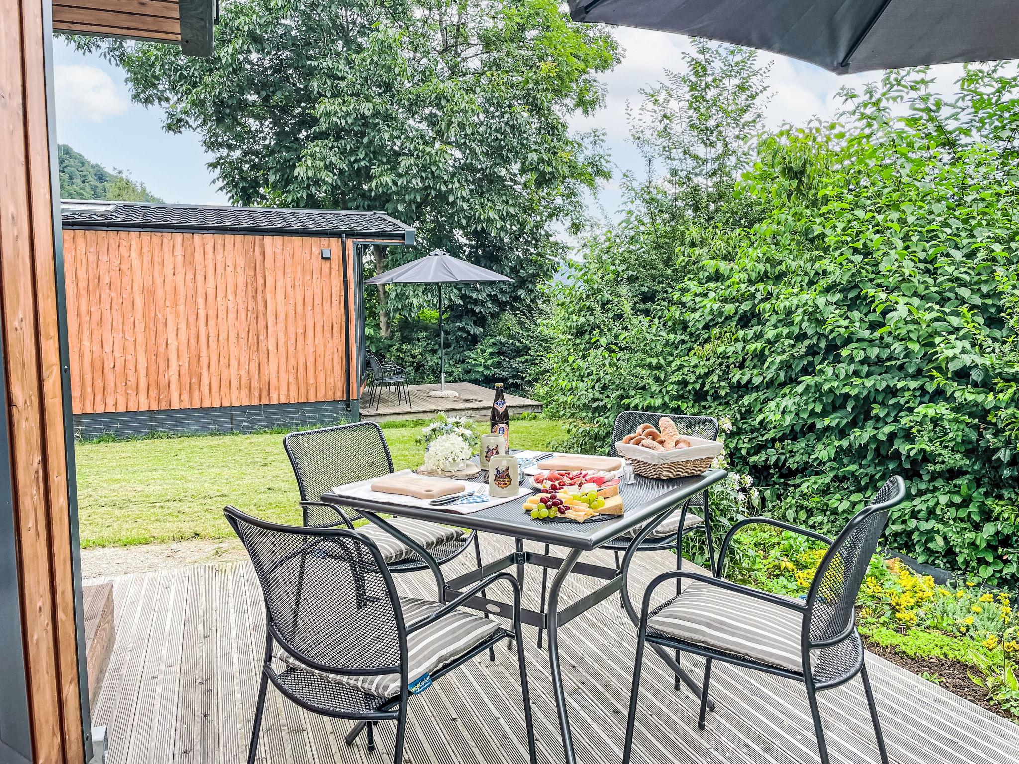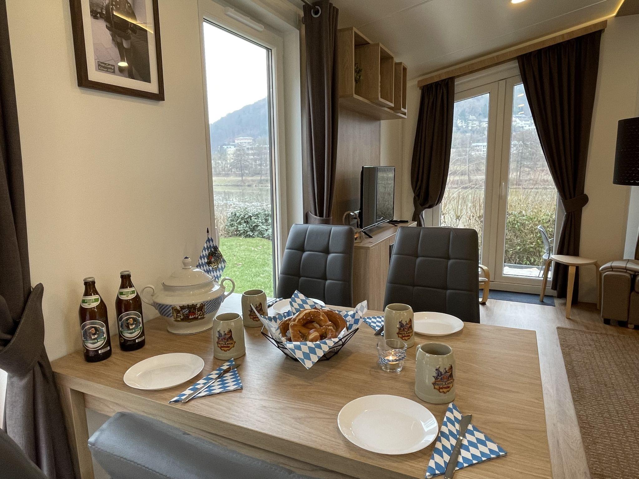 "Tiny Haus Prinz Ludwig", 3-room mobile home 48 m2. Object suitable for 2 adults + 4 children. Comfortable furnishings: living/sleeping room with 1 double sofabed (160 cm, length 200 cm), Scandinavian wood stove (only for decoration), satellite TV and air conditioning. Exit to the terrace. 1 room with 1 french bed (160 cm, length 200 cm). 1 room with 2 beds (80 cm, length 200 cm). Open kitchen (oven, dishwasher, 4 ceramic glass hob hotplates, toaster, kettle, freezer, electric coffee machine). Shower, sep. WC. Small terrace. Terrace furniture. View of the river. Facilities: washing machine, hair dryer. Parking at the house. Please note: non-smokers only.