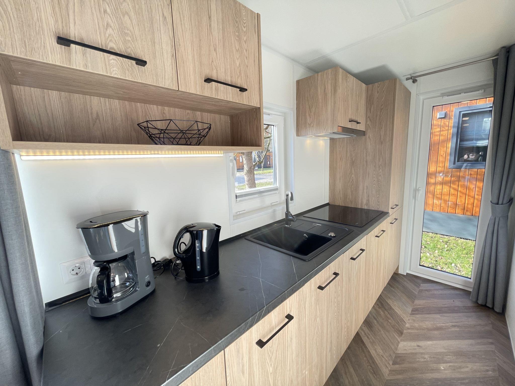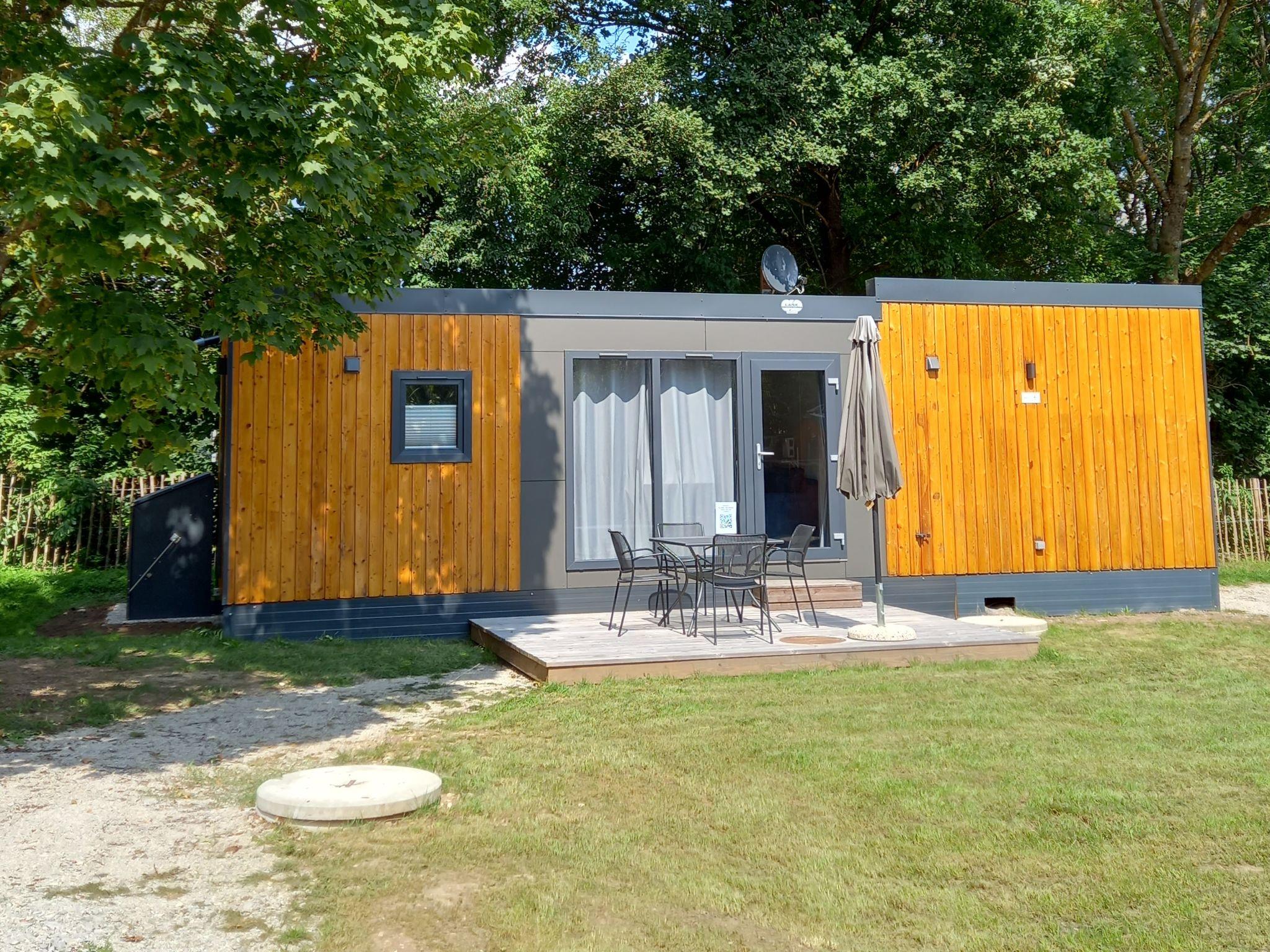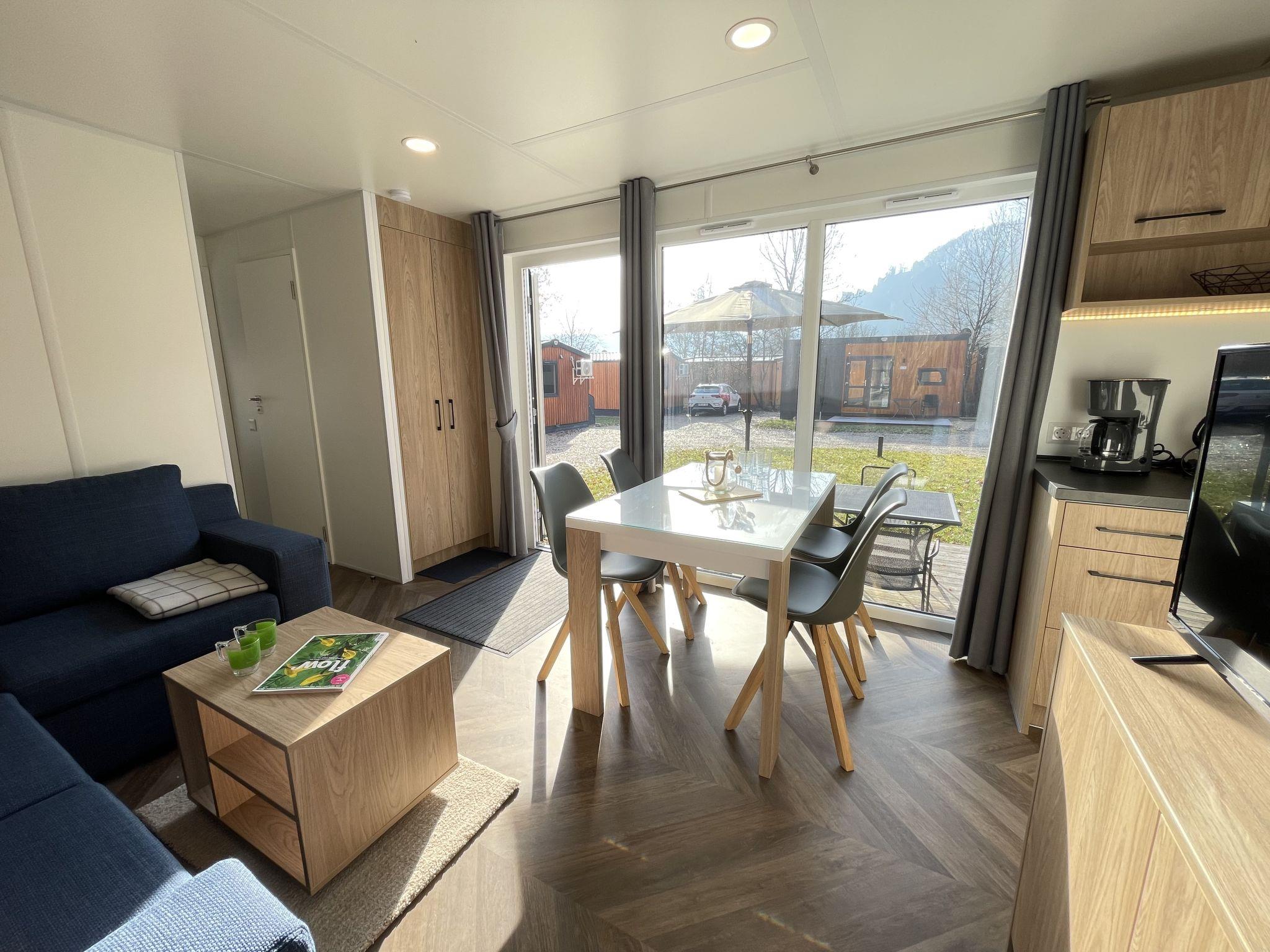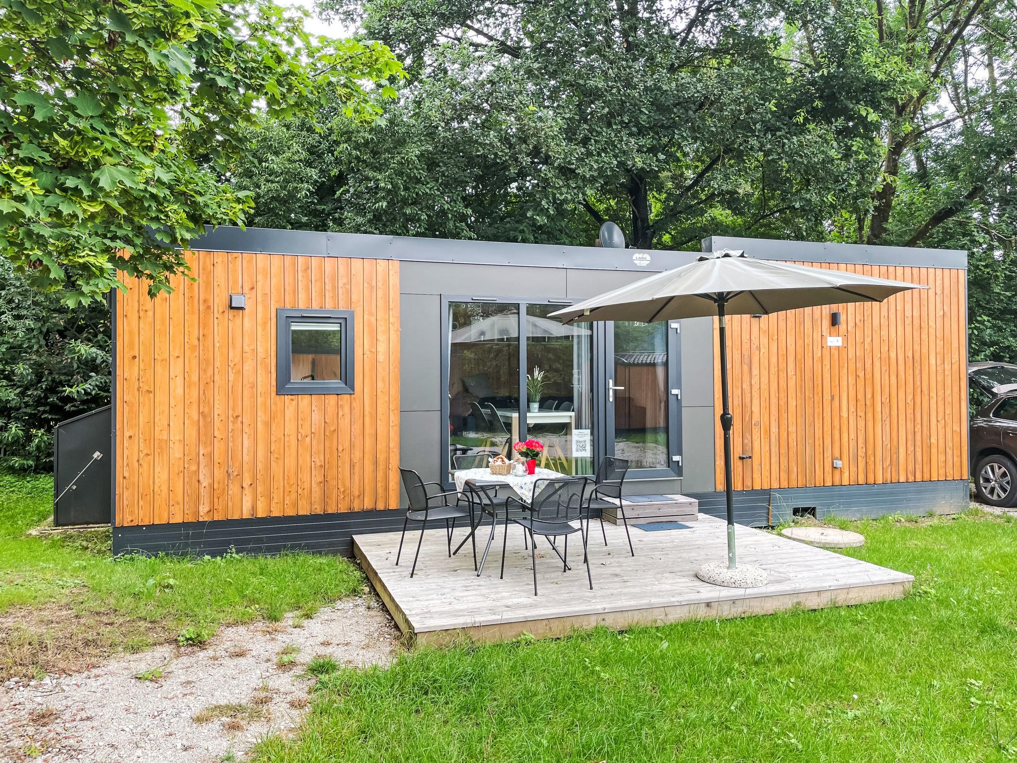 "Tiny Haus Sunside Gardenlounge", 3-room mobile home 32 m2. Cosy furnishings: living/sleeping room with (120 cm, length 170 cm), satellite TV. Exit to the terrace. 1 room with 1 french bed (140 cm, length 200 cm). 1 room with 2 beds (80 cm, length 200 cm). Open kitchen (4 ceramic glass hob hotplates, kettle, freezer, electric coffee machine). Shower/WC. Electric heating. Small terrace. Terrace furniture. Parking at 50 m. Please note: non-smoking house.