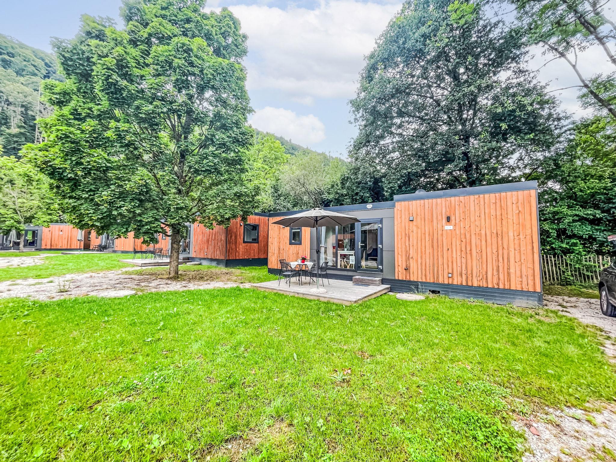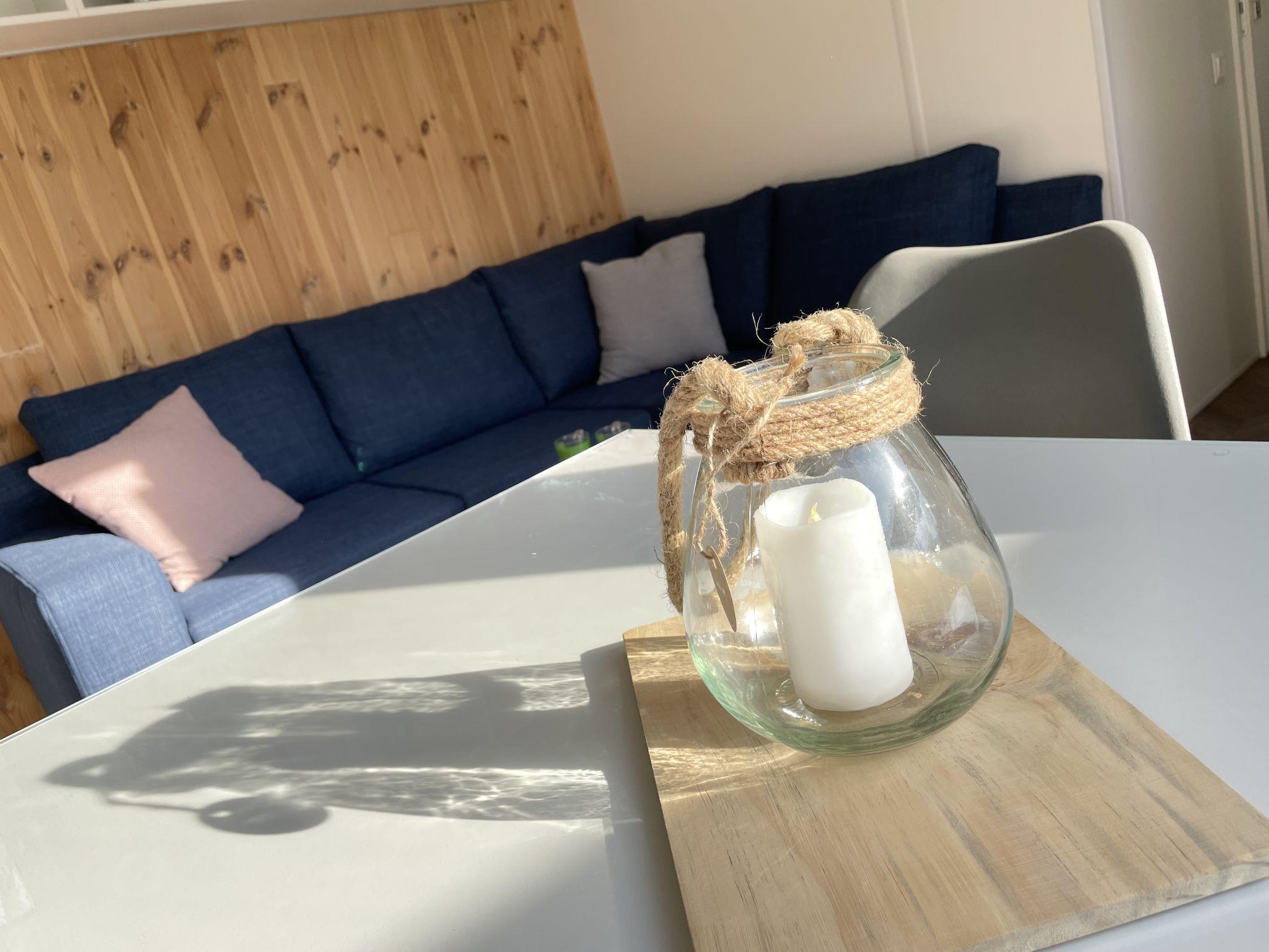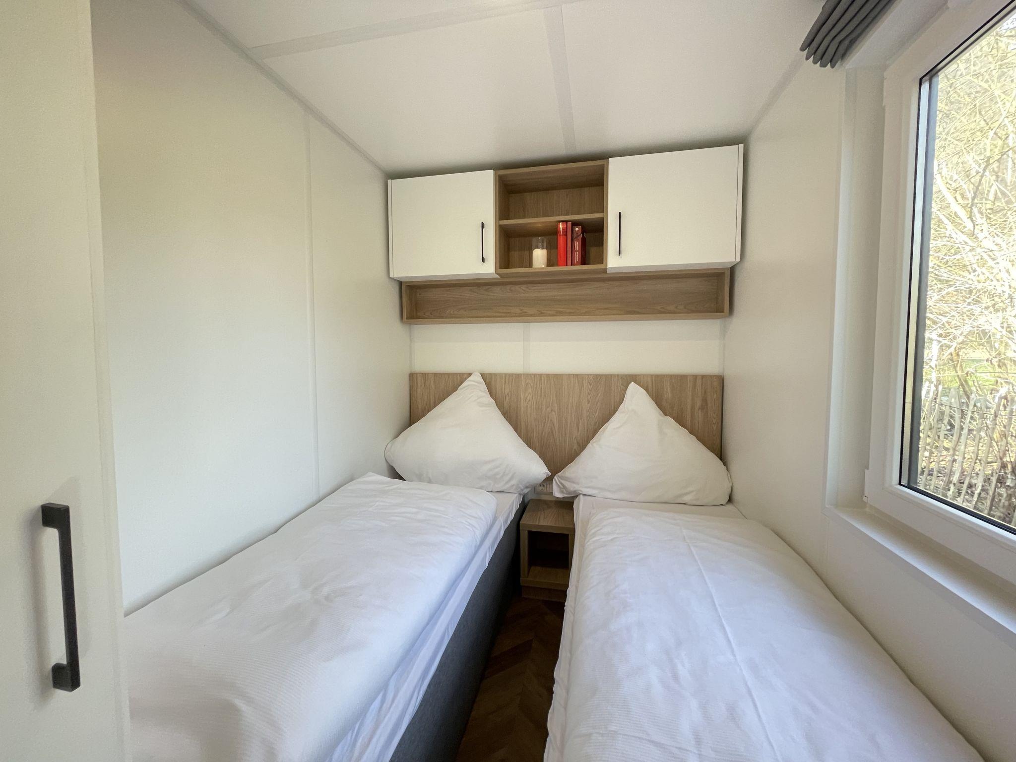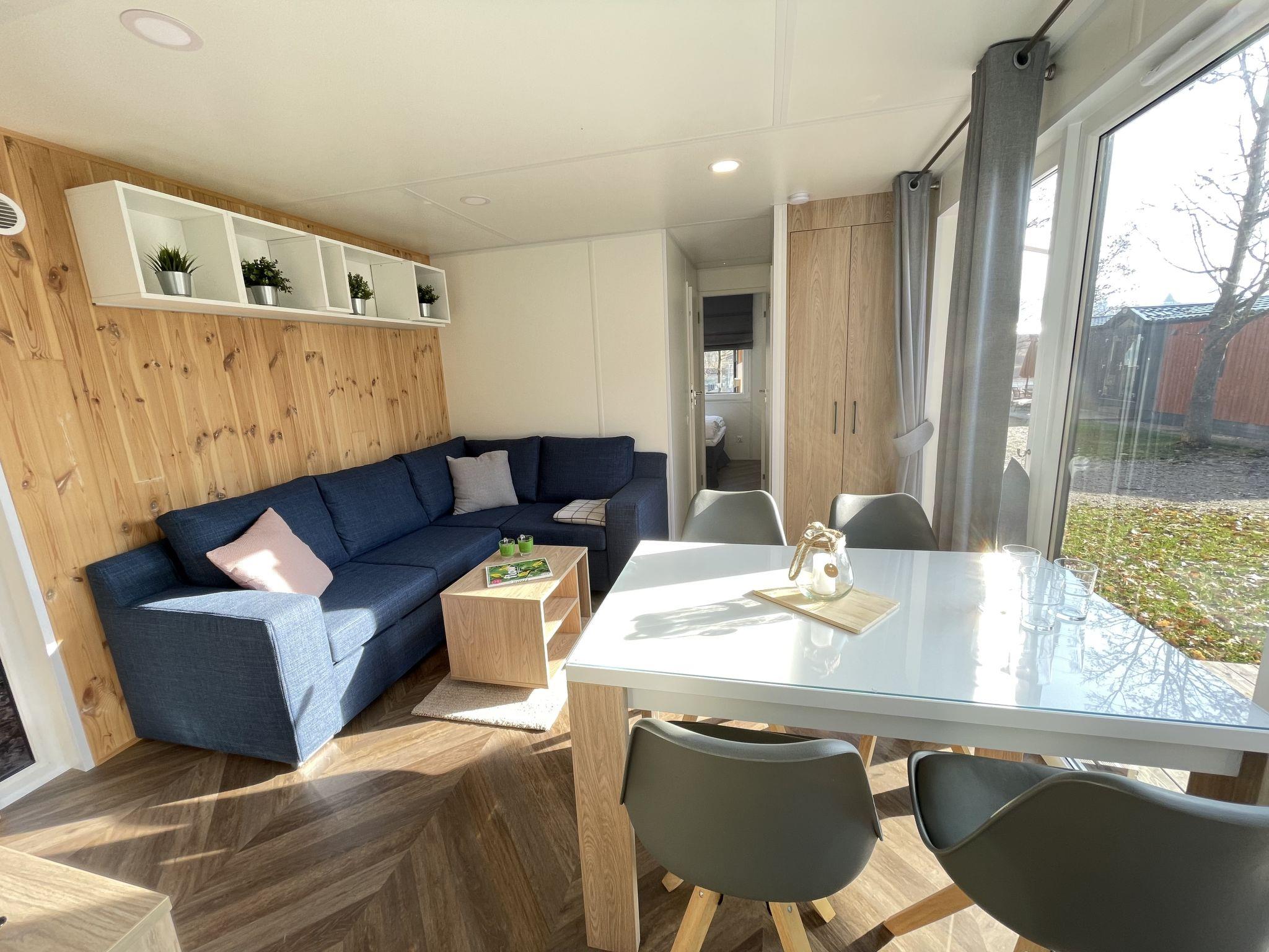 "Tiny Haus Sunside Gardenlounge", 3-room mobile home 32 m2. Cosy furnishings: living/sleeping room with (120 cm, length 170 cm), satellite TV. Exit to the terrace. 1 room with 1 french bed (140 cm, length 200 cm). 1 room with 2 beds (80 cm, length 200 cm). Open kitchen (4 ceramic glass hob hotplates, kettle, freezer, electric coffee machine). Shower/WC. Electric heating. Small terrace. Terrace furniture. Parking at 50 m. Please note: non-smoking house.