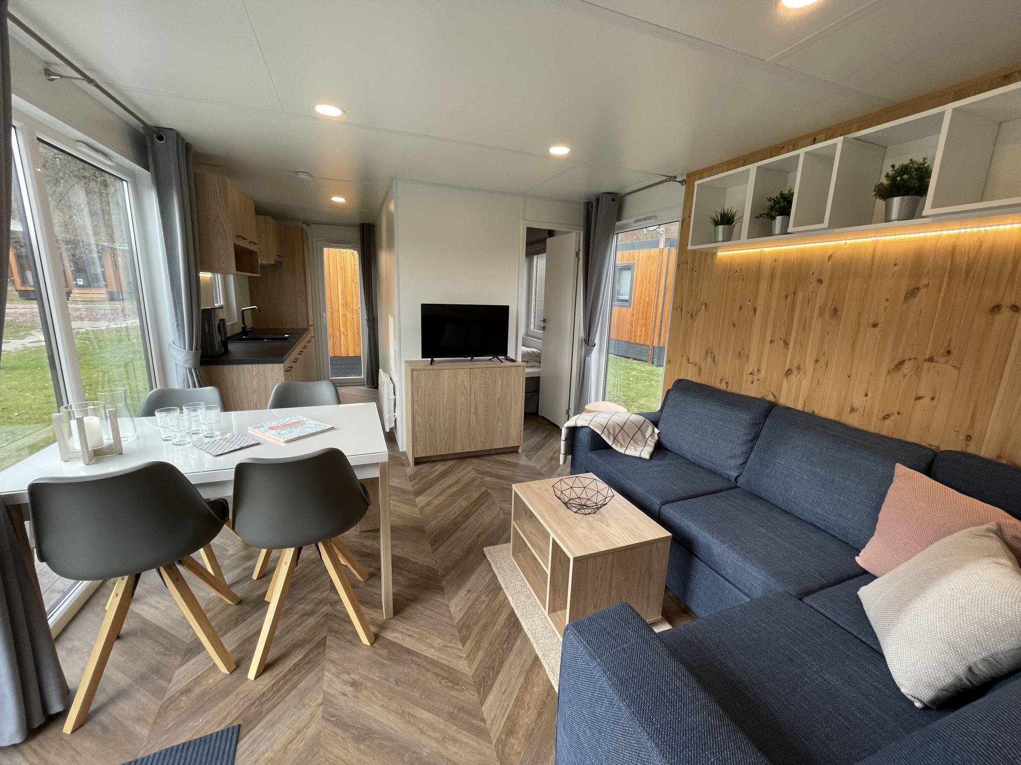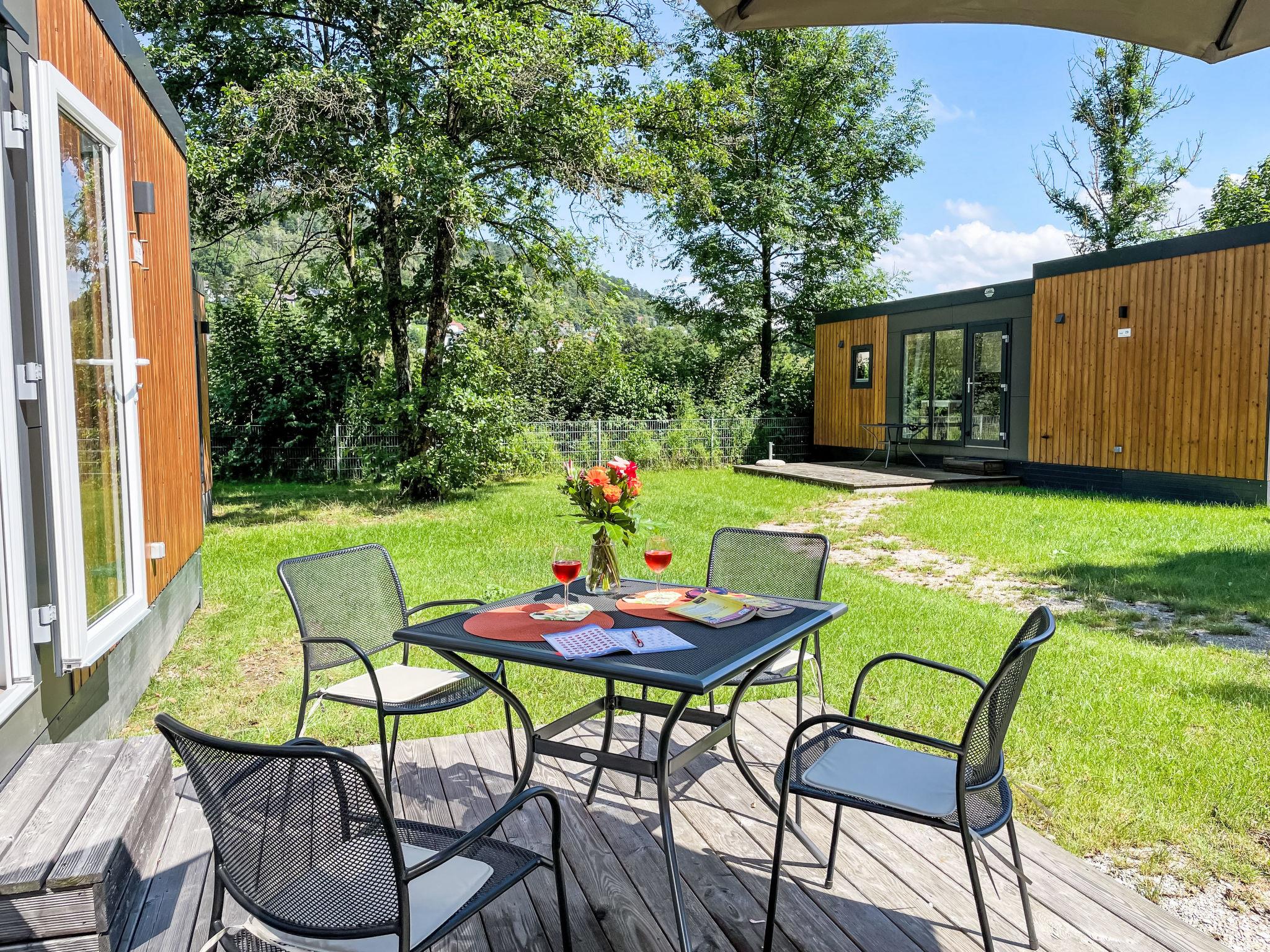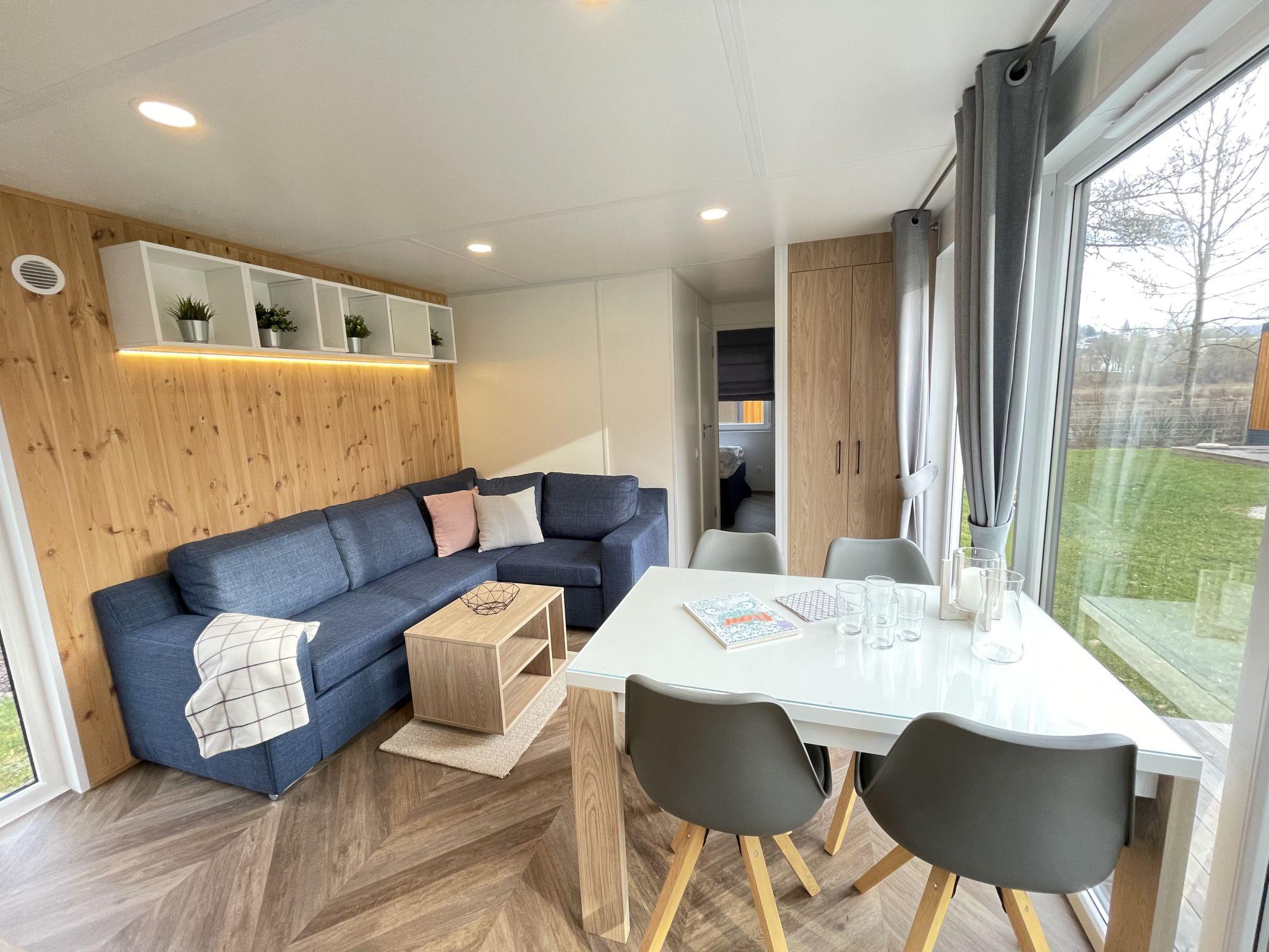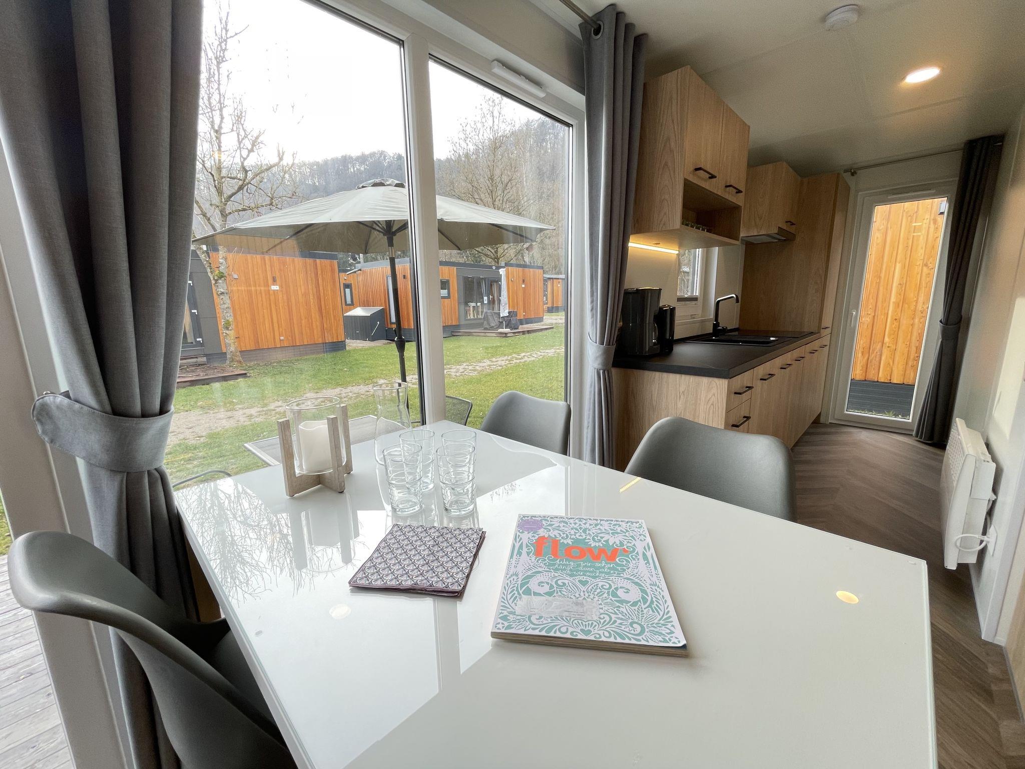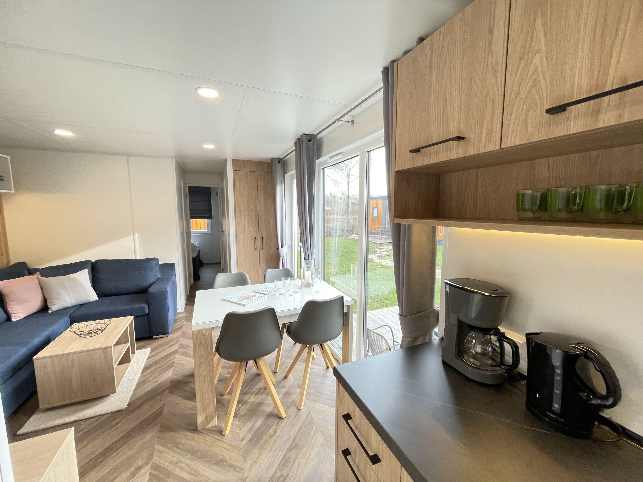 "Tiny Haus Xandra", 3-room mobile home 32 m2. Cosy furnishings: living/sleeping room with (120 cm, length 170 cm), satellite TV. Exit to the terrace. 1 room with 1 french bed (140 cm, length 200 cm). 1 room with 2 beds (80 cm, length 200 cm). Open kitchen (4 ceramic glass hob hotplates, kettle, freezer, electric coffee machine). Shower/WC. Electric heating. Small terrace. Terrace furniture. Parking at the house. Please note: non-smoking house. Maximum 1 pet/ dog allowed. bicycle box. DE8422.200.24