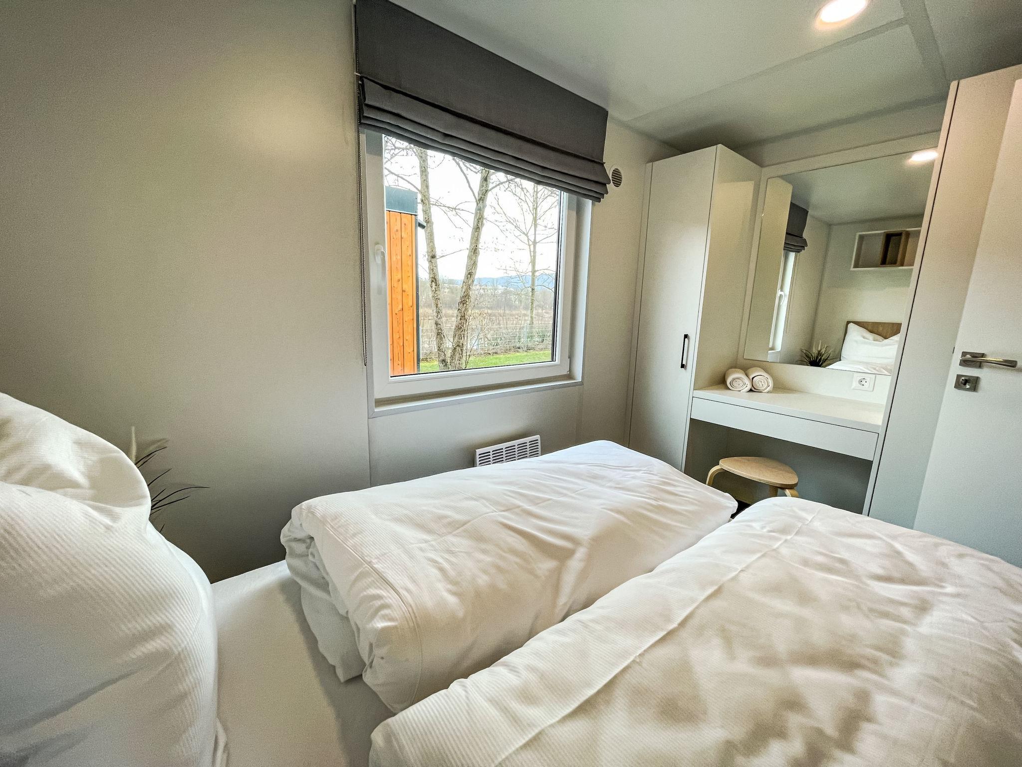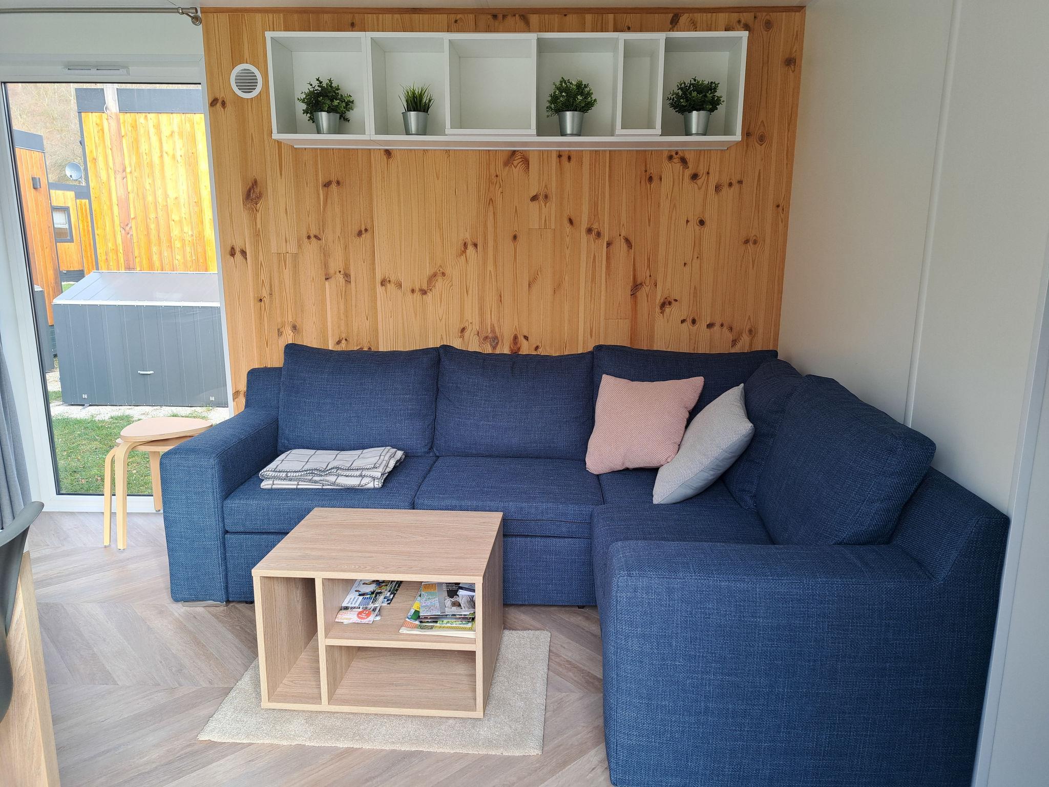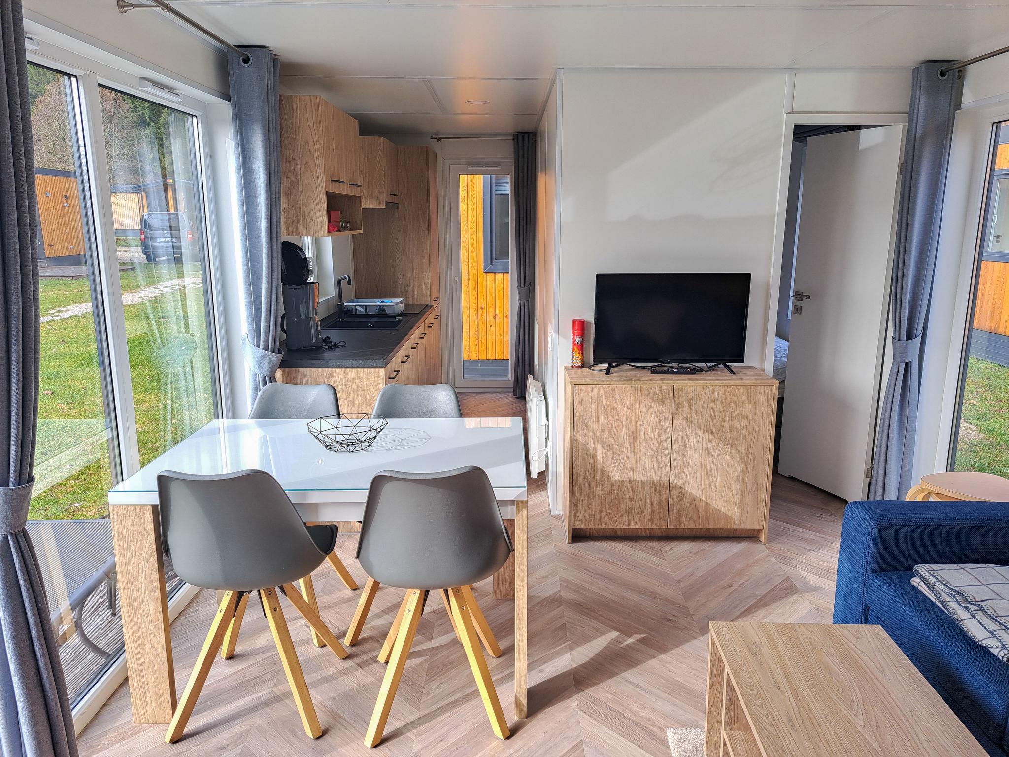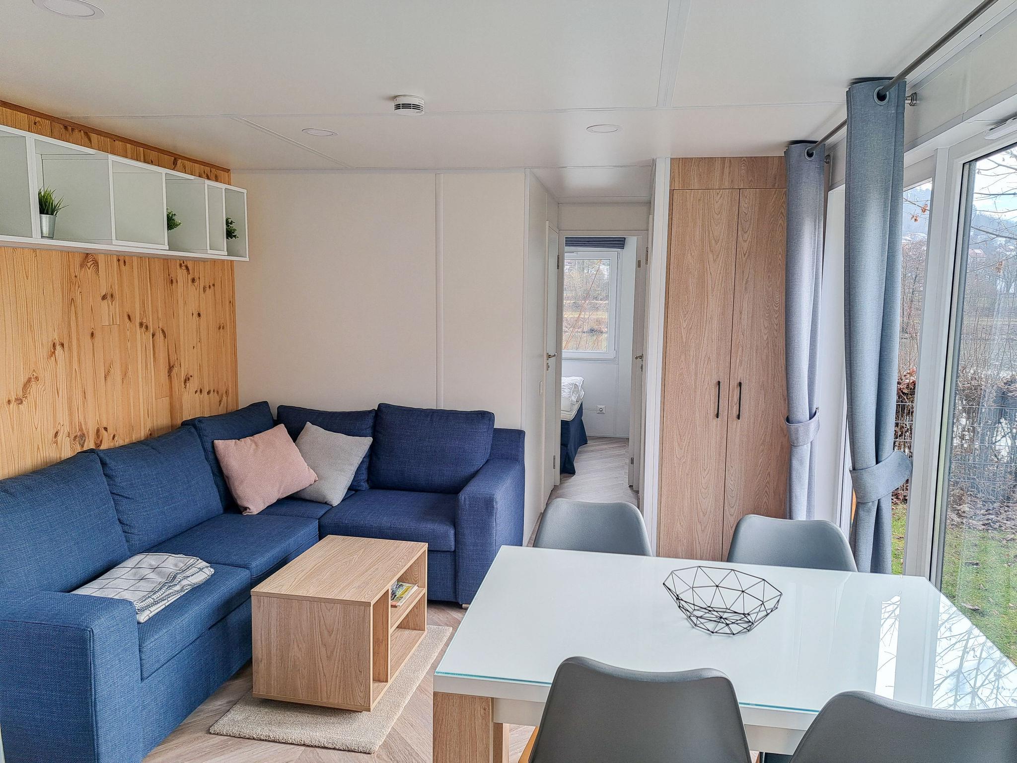 "Tiny Haus Altmühlblick III", 3-room mobile home 32 m2. Cosy furnishings: living/sleeping room with (120 cm, length 170 cm), satellite TV. Exit to the terrace. 1 room with 1 french bed (140 cm, length 190 cm). 1 room with 2 beds (70 cm, length 190 cm). Open kitchen (4 ceramic glass hob hotplates, kettle, freezer, electric coffee machine). Shower, sep. WC. Electric heating. Small terrace. Terrace furniture. Parking at the house. Please note: non-smoking house.