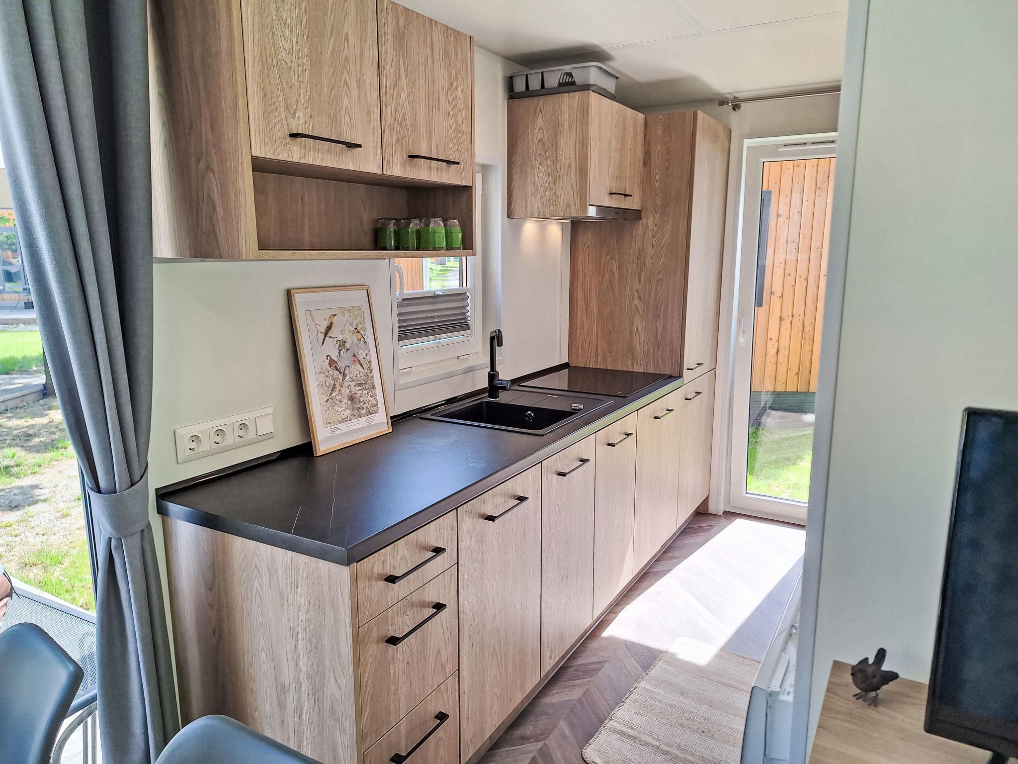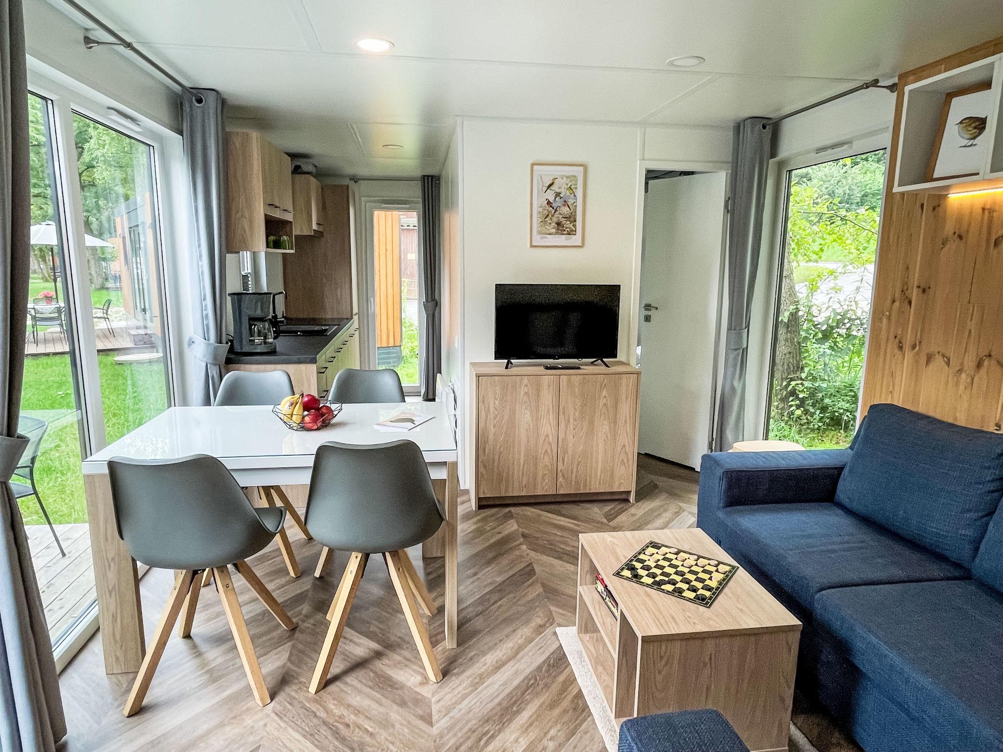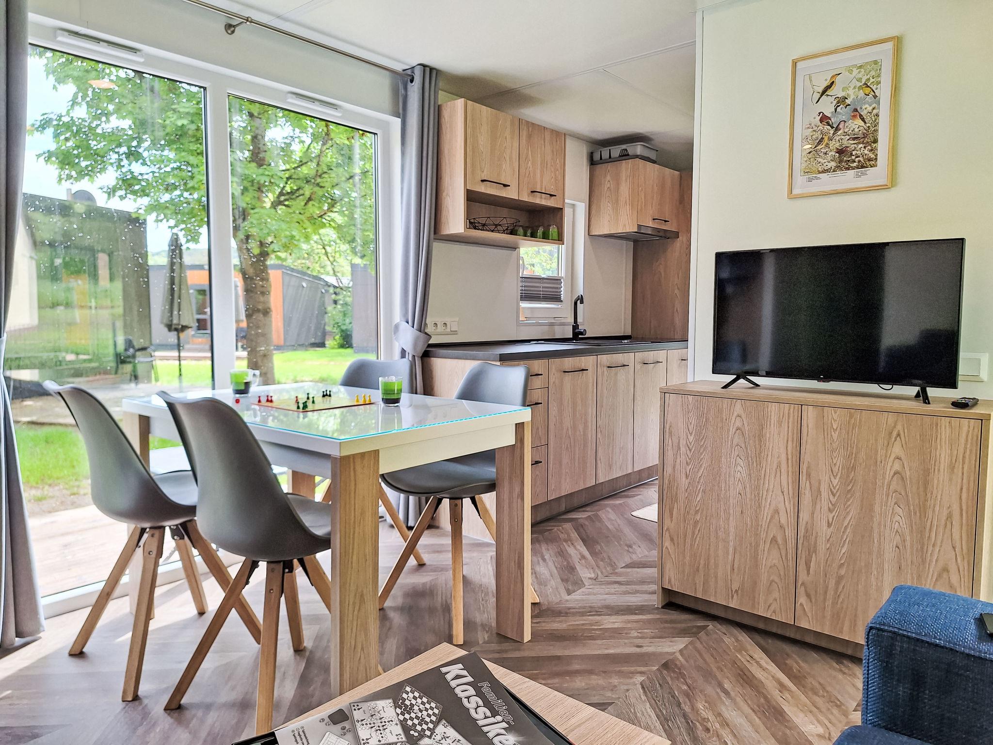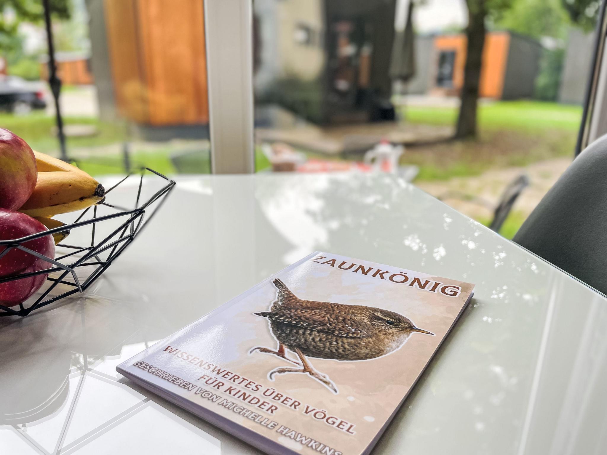 "Tiny Haus Zaunkönig", 3-room mobile home 32 m2. Cosy furnishings: living/sleeping room with (120 cm, length 170 cm), satellite TV. Exit to the terrace. 1 room with 1 french bed (140 cm, length 190 cm). 1 room with 2 beds (70 cm, length 190 cm). Open kitchen (4 ceramic glass hob hotplates, kettle, freezer, electric coffee machine). Shower, sep. WC. Electric heating. Small terrace. Terrace furniture. Parking at the house. Please note: non-smoking house.
