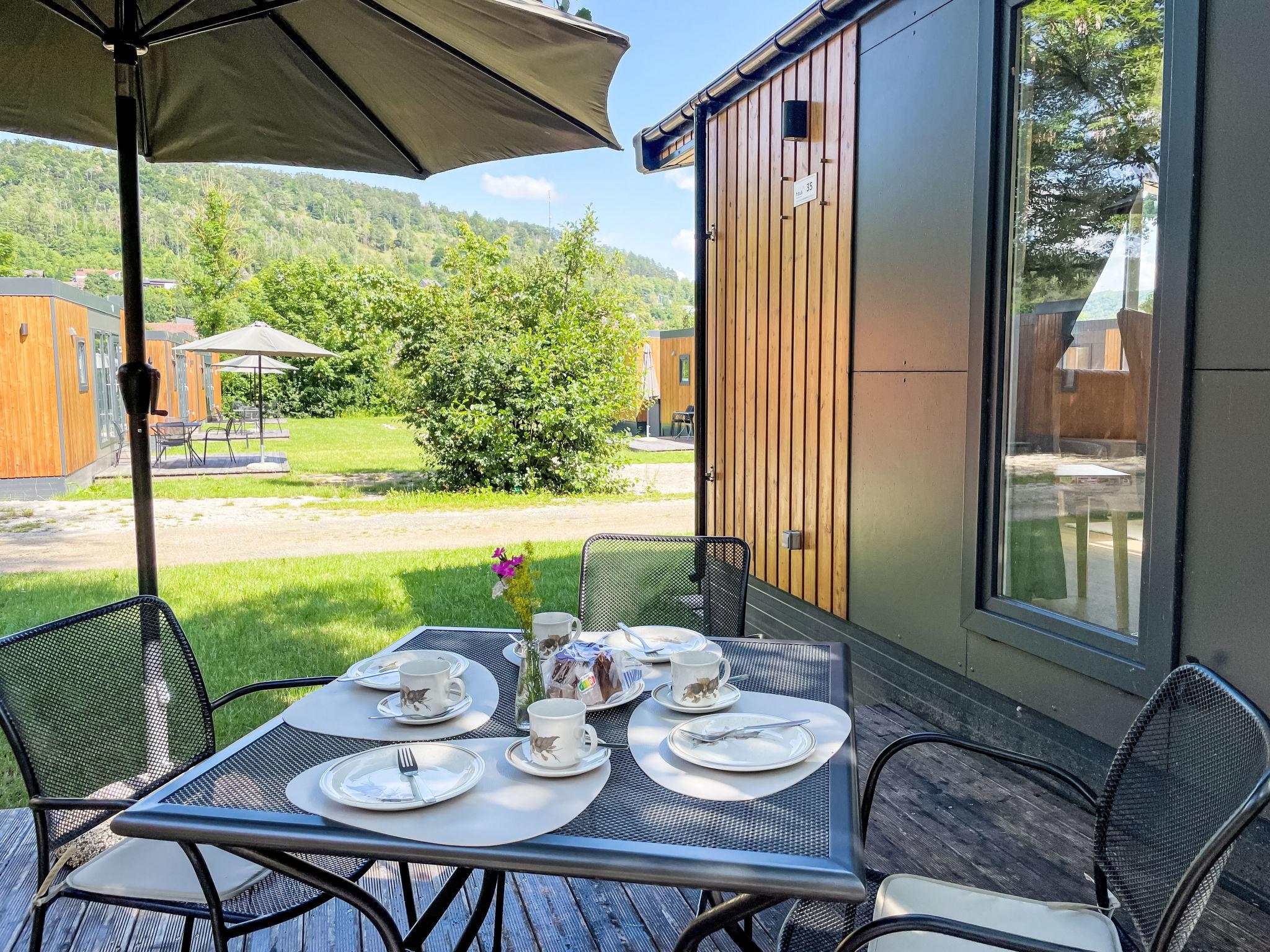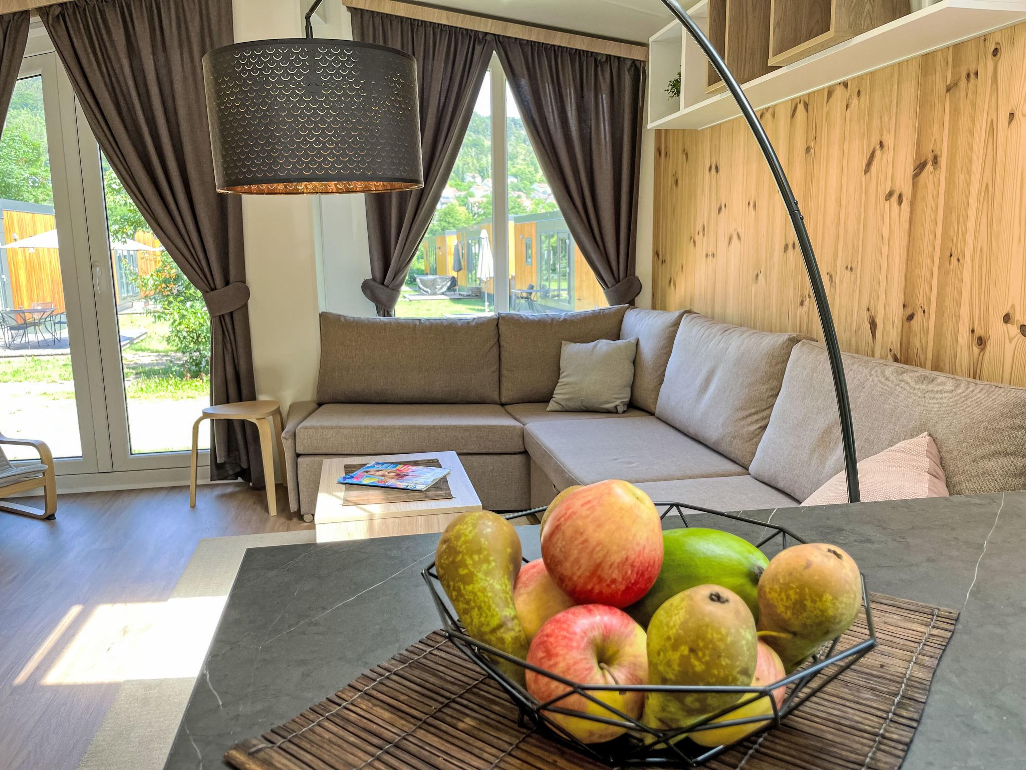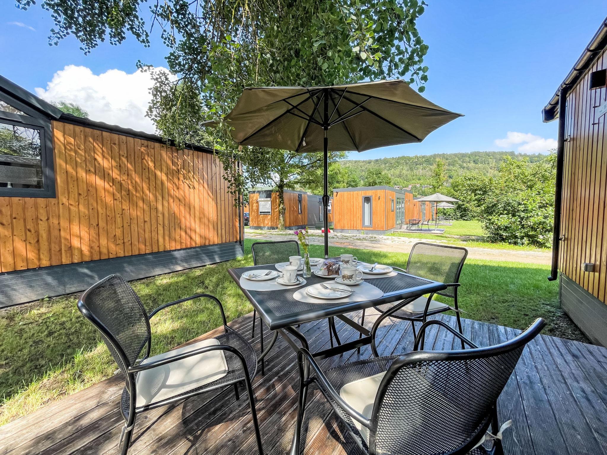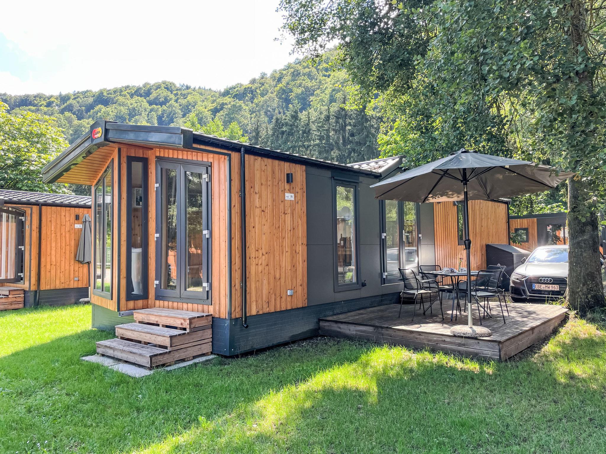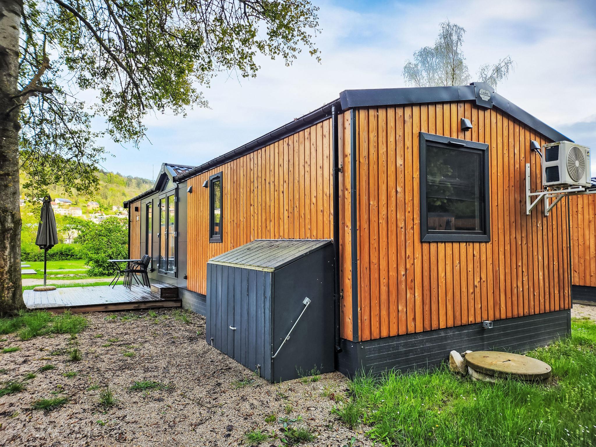 "Tiny Haus Drei Burgen", 3-room mobile home 48 m2. Comfortable furnishings: living/sleeping room with 1 double sofabed (160 cm, length 200 cm), Scandinavian wood stove (only for decoration), satellite TV and air conditioning. Exit to the terrace. 1 room with 1 french bed (160 cm, length 200 cm). 1 room with 2 beds (80 cm, length 200 cm). Open kitchen (oven, dishwasher, 4 ceramic glass hob hotplates, toaster, kettle, freezer, electric coffee machine). Shower, sep. WC. Small terrace. Terrace furniture. Facilities: washing machine, dryer. Parking at the house. Please note: non-smokers only.