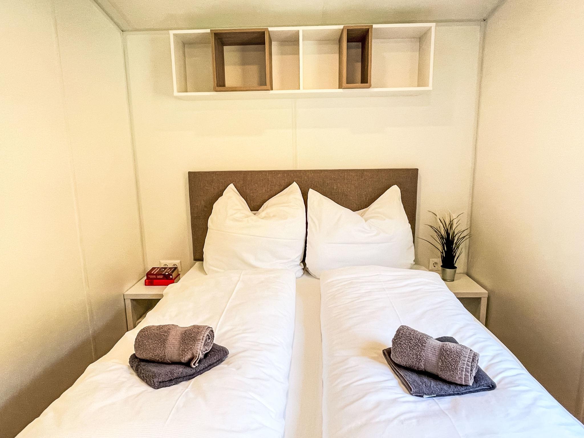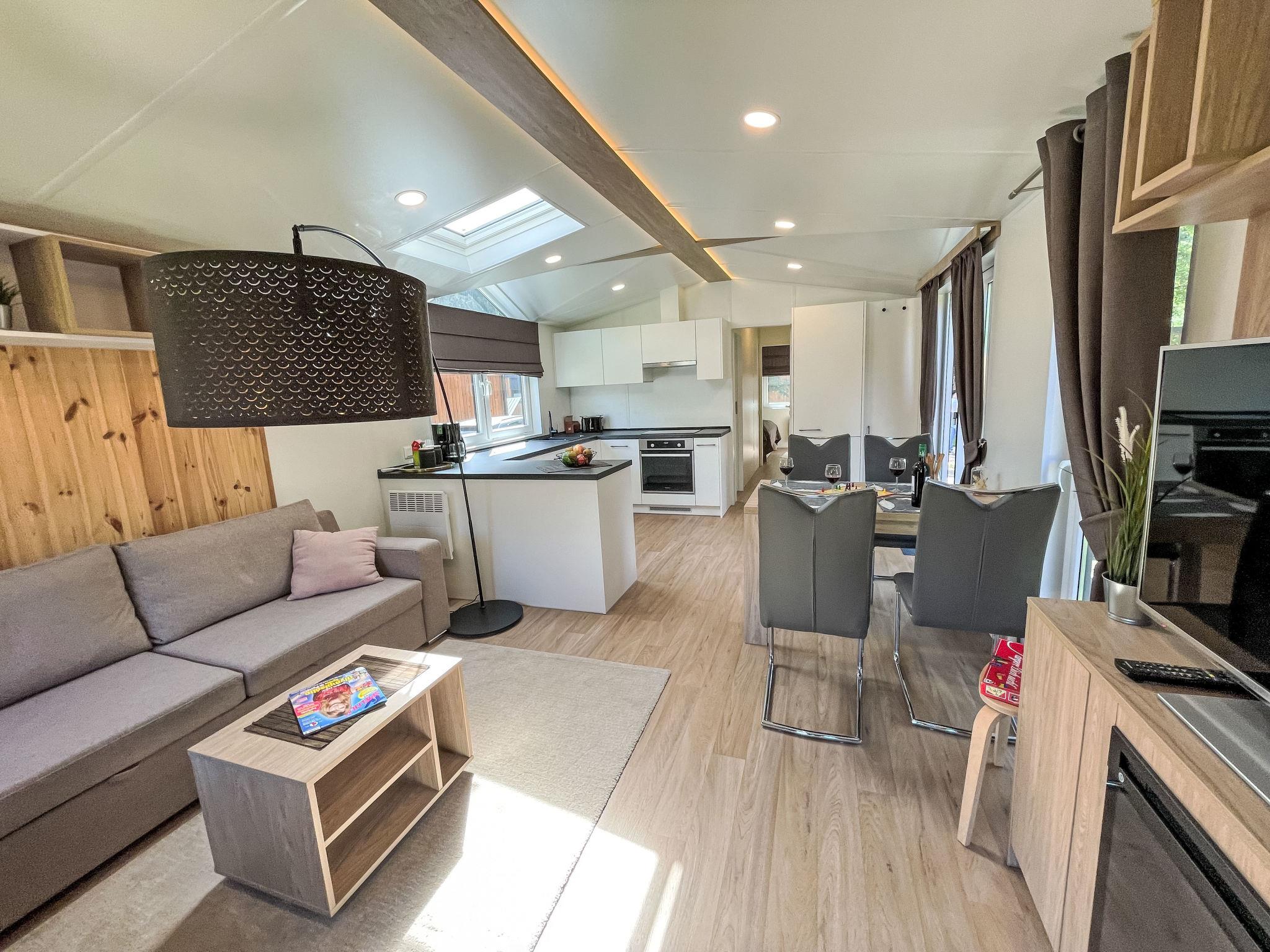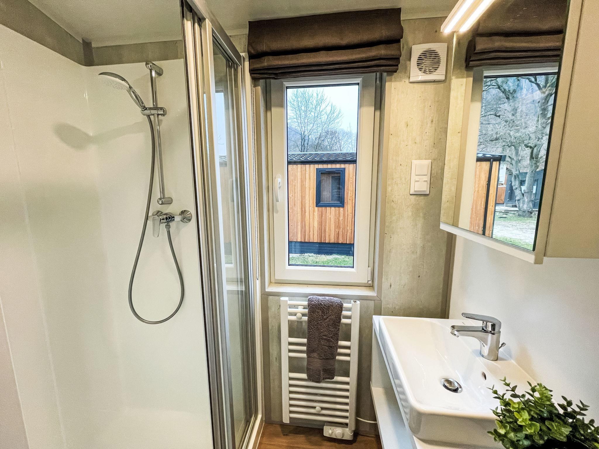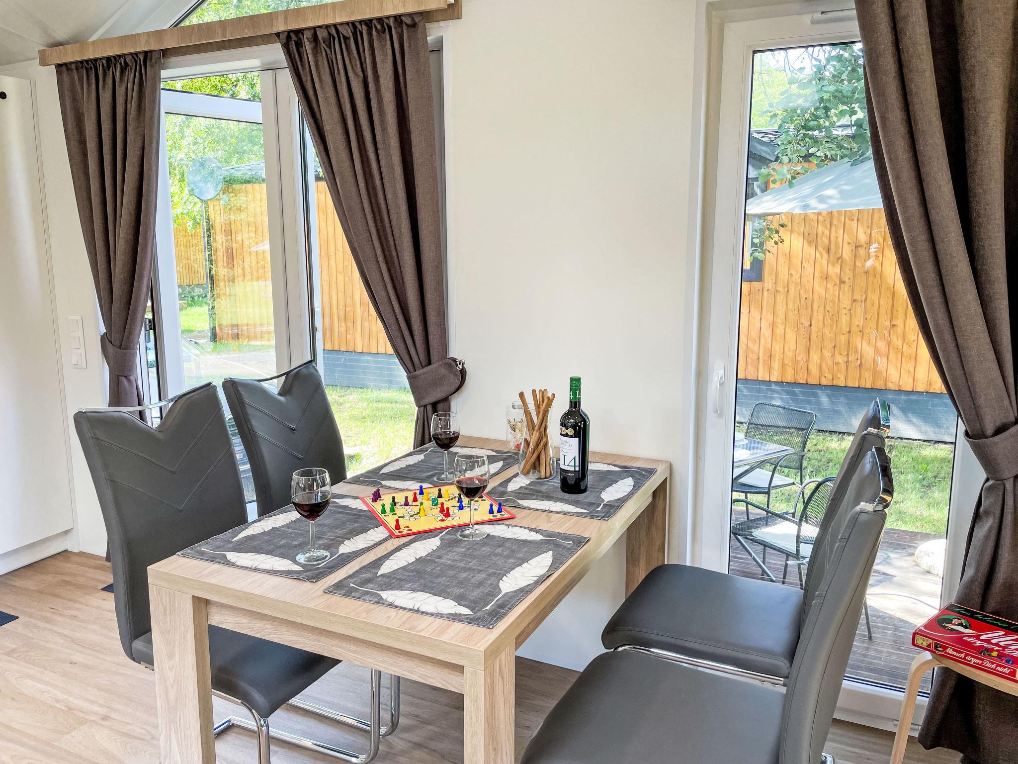 "Tiny Haus Drei Burgen", 3-room mobile home 48 m2. Comfortable furnishings: living/sleeping room with 1 double sofabed (160 cm, length 200 cm), Scandinavian wood stove (only for decoration), satellite TV and air conditioning. Exit to the terrace. 1 room with 1 french bed (160 cm, length 200 cm). 1 room with 2 beds (80 cm, length 200 cm). Open kitchen (oven, dishwasher, 4 ceramic glass hob hotplates, toaster, kettle, freezer, electric coffee machine). Shower, sep. WC. Small terrace. Terrace furniture. Facilities: washing machine, dryer. Parking at the house. Please note: non-smokers only.