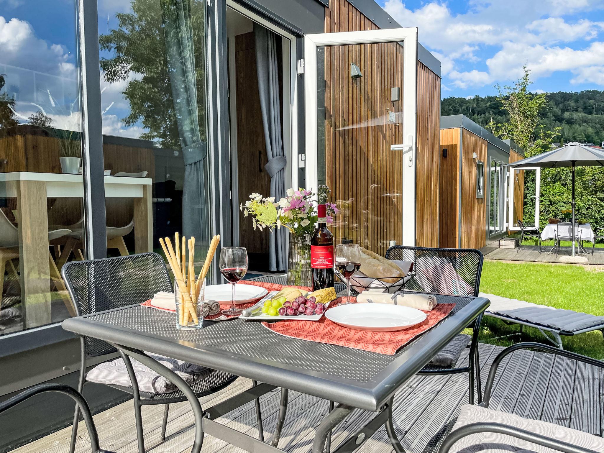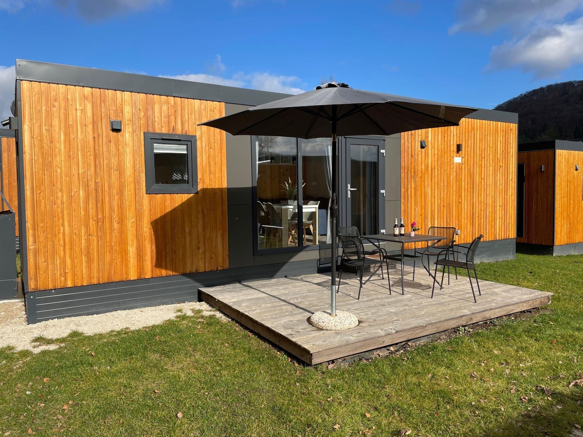 "Tiny Haus Sonnenplatz", 3-room mobile home 32 m2, on the ground floor. Cosy furnishings: living/sleeping room with 1 sofabed (120 cm, length 170 cm), dining table and satellite TV (flat screen). Exit to the terrace. 1 room with 1 french bed (140 cm, length 200 cm). 1 room with 2 beds (80 cm, length 200 cm). Kitchenette (4 ceramic glass hob hotplates, kettle, freezer, electric coffee machine). Shower/WC. Electric heating. Small terrace. Terrace furniture. Facilities: hair dryer. Parking (1 car) at 50 m. Please note: non-smoking house. Maximum 1 pet/ dog allowed. Smoke alarm.