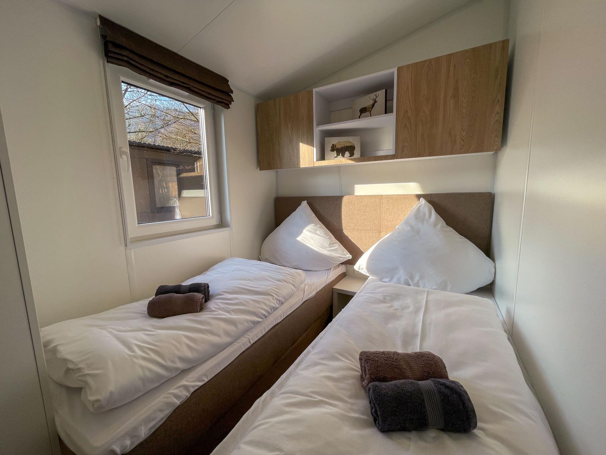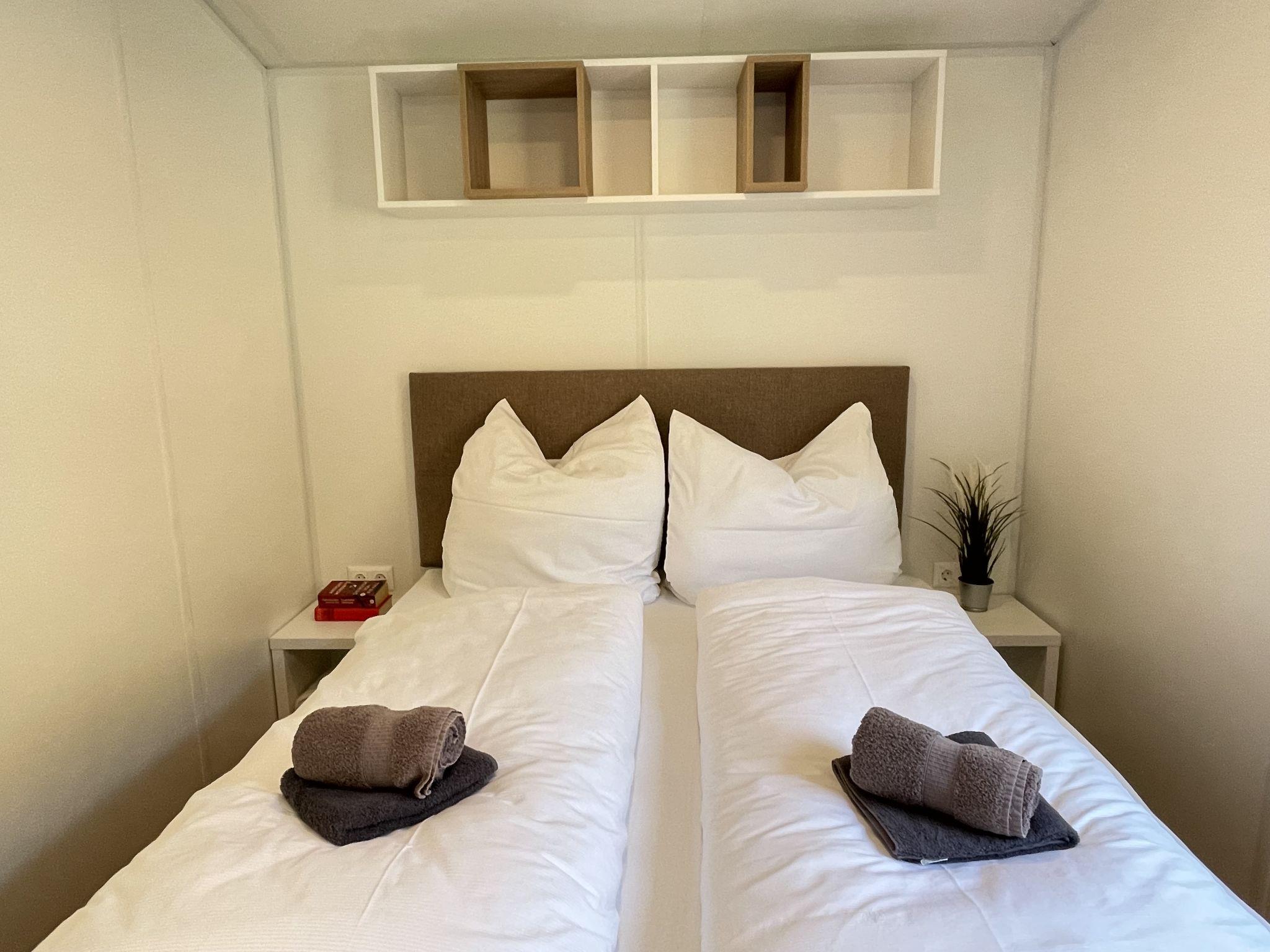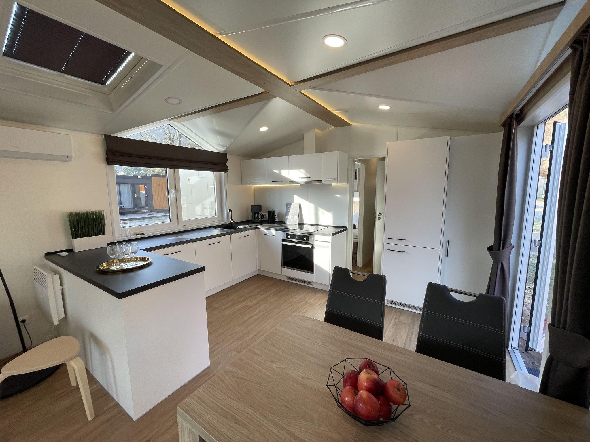 "Tiny Haus Donaublick", 3-room mobile home 48 m2. Comfortable furnishings: living/sleeping room with 1 double sofabed (160 cm, length 200 cm), Scandinavian wood stove (only for decoration), satellite TV and air conditioning. Exit to the terrace. 1 room with 1 french bed (160 cm, length 200 cm). 1 room with 2 beds (80 cm, length 200 cm). Open kitchen (oven, dishwasher, 4 ceramic glass hob hotplates, kettle, freezer, electric coffee machine). Shower, sep. WC. Small terrace. Terrace furniture. Facilities: washing machine, dryer. Parking at the house. Please note: non-smokers only.