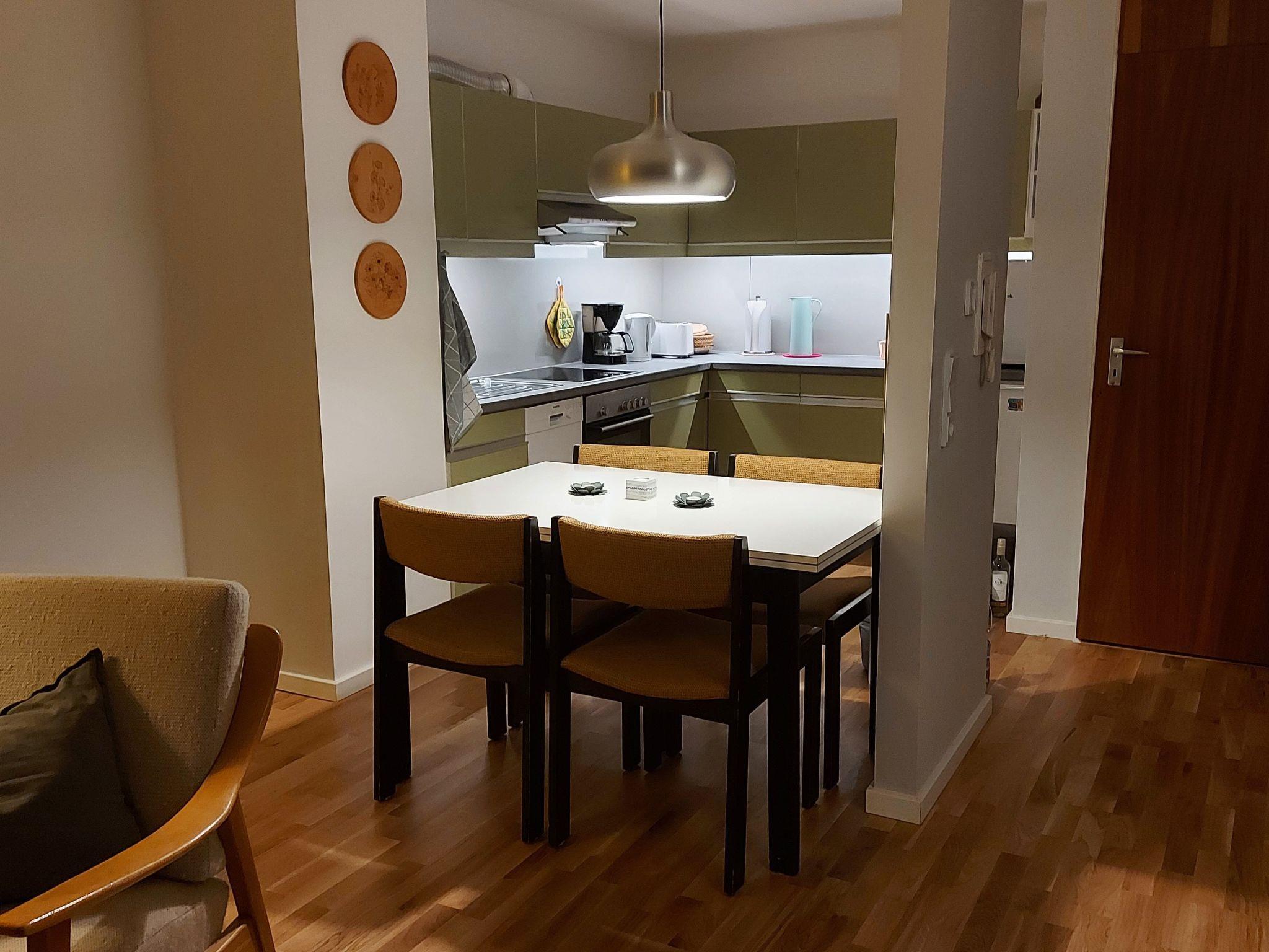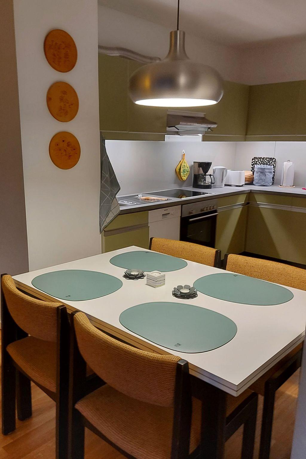 The 65 m² flat is suitable for up to 4 people and, thanks to its location on the 4th floor of a residential complex and the large floor-to-ceiling window fronts, has a wonderful unobstructed view of the natural surroundings. We have renovated and redesigned the flat with great attention to detail, combining new elements with original features while respecting the architecture from the 1970s. The centrepiece of the flat is the open-plan living and dining area (for 4 people) with kitchen. From here and the covered, furnished balcony, you have a wonderful unobstructed view across the meadow to the neighbouring forest. There is a sofa bed, a TV with DVD player and two armchairs with a coffee table in the living area. There is a double bed in a cosy room alcove. The living area flows into the dining area and kitchen. There is a separate bedroom with a double bed, which is bright and has its own covered balcony. The comfortable bathroom has a modern design and is equipped with a rain shower, washbasin, WC, heated towel rail and Internet radio.