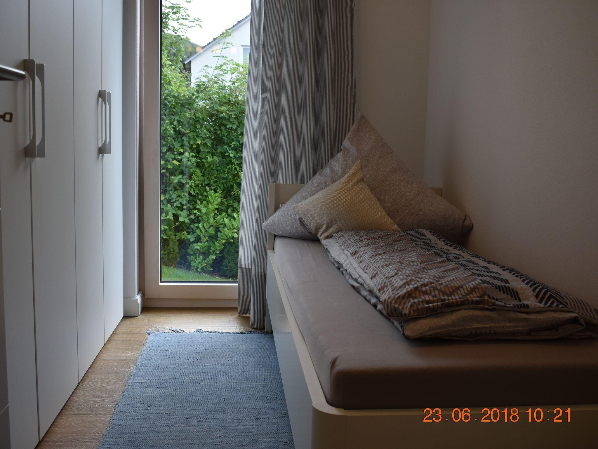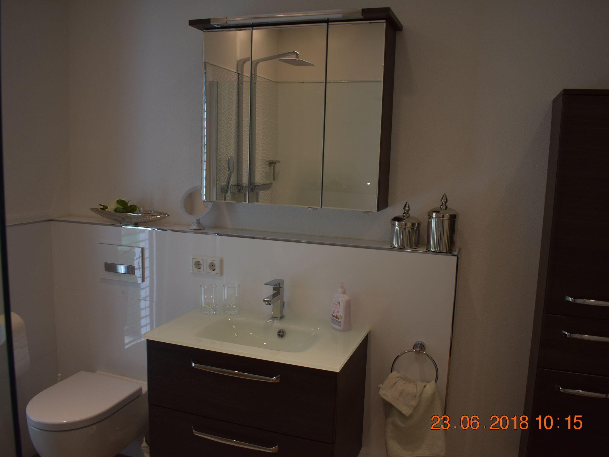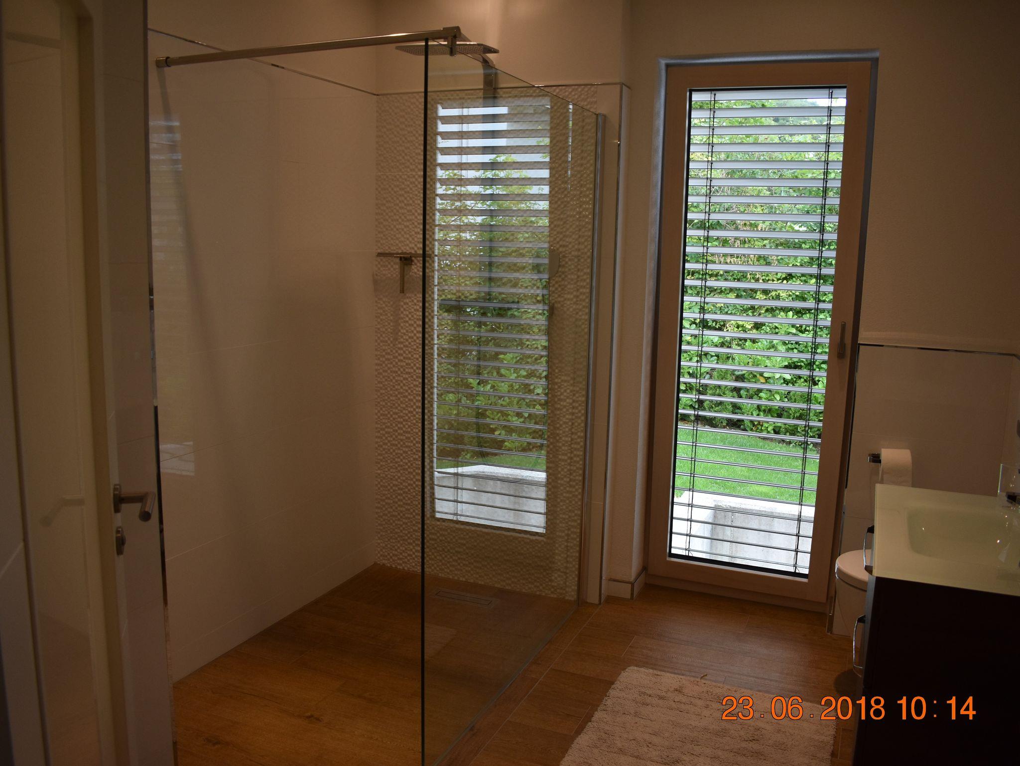 Das Bad mit großem Fenster verfügt über eine sehr weitläufige, bodenebene Regenwalddusche, Waschtisch und Spiegelschrank sowie Föhn, Handtuchtrockner und WC. Handtücher und Bettwäsche ist inklusive. Des Weiteren gibt es im Bad Waschmaschine und Trockner.