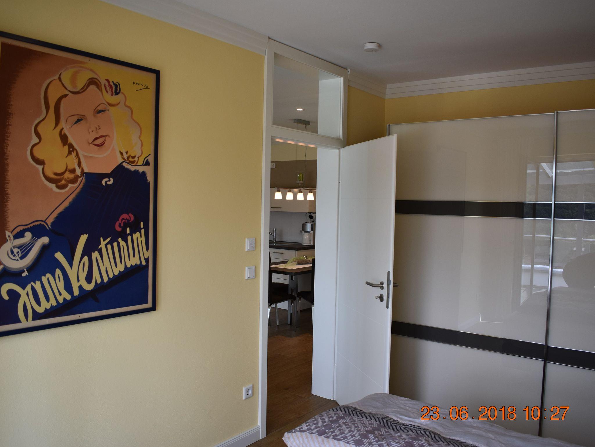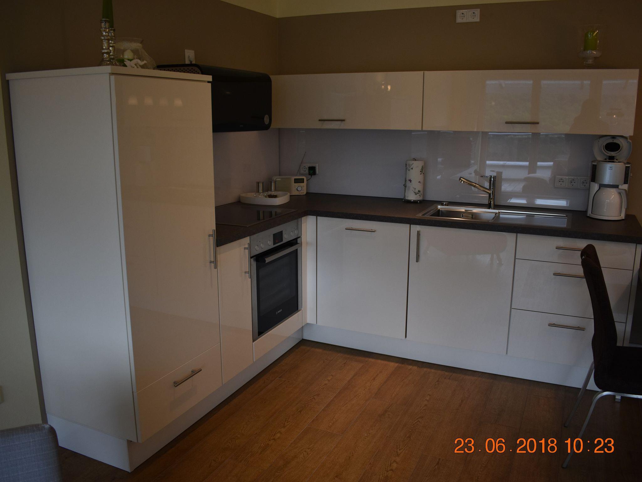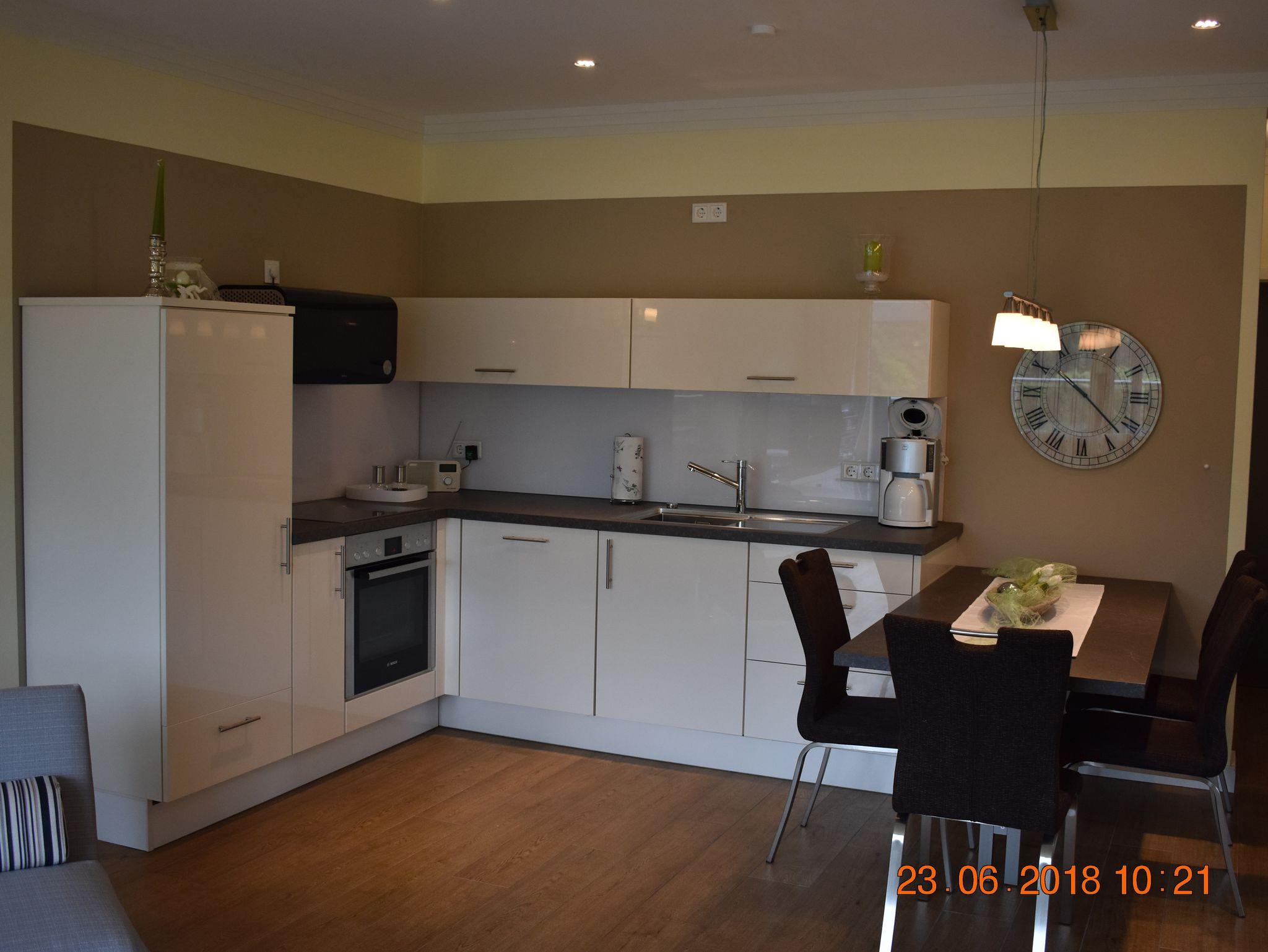 Die großzügige und komfortable Ferienwohnung mit 65qm und 24qm überdachter Terrasse verfügt über zwei Schlafzimmer, einmal mit einem Boxspring-Doppelbett, das zweite über ein Einzelbett. Der Wohnbereich ist offen gestaltet mit Küche, Essplatz für 4 Personen und dem Wohnbereich mit großzügiger Couch und Sessel. Hier haben sie auch DAB-Radio, Flat-Screen TV 127cm, Sat-Anlage und W-LAN für Ihre Unterhaltung. Die hochwertige Küche verfügt über Induktionskochfeld, Geschirrspüler, Backofen, Kühl-und Gefrierschrank, Microwelle, Kaffeemaschine, Toaster und Eierkocher.