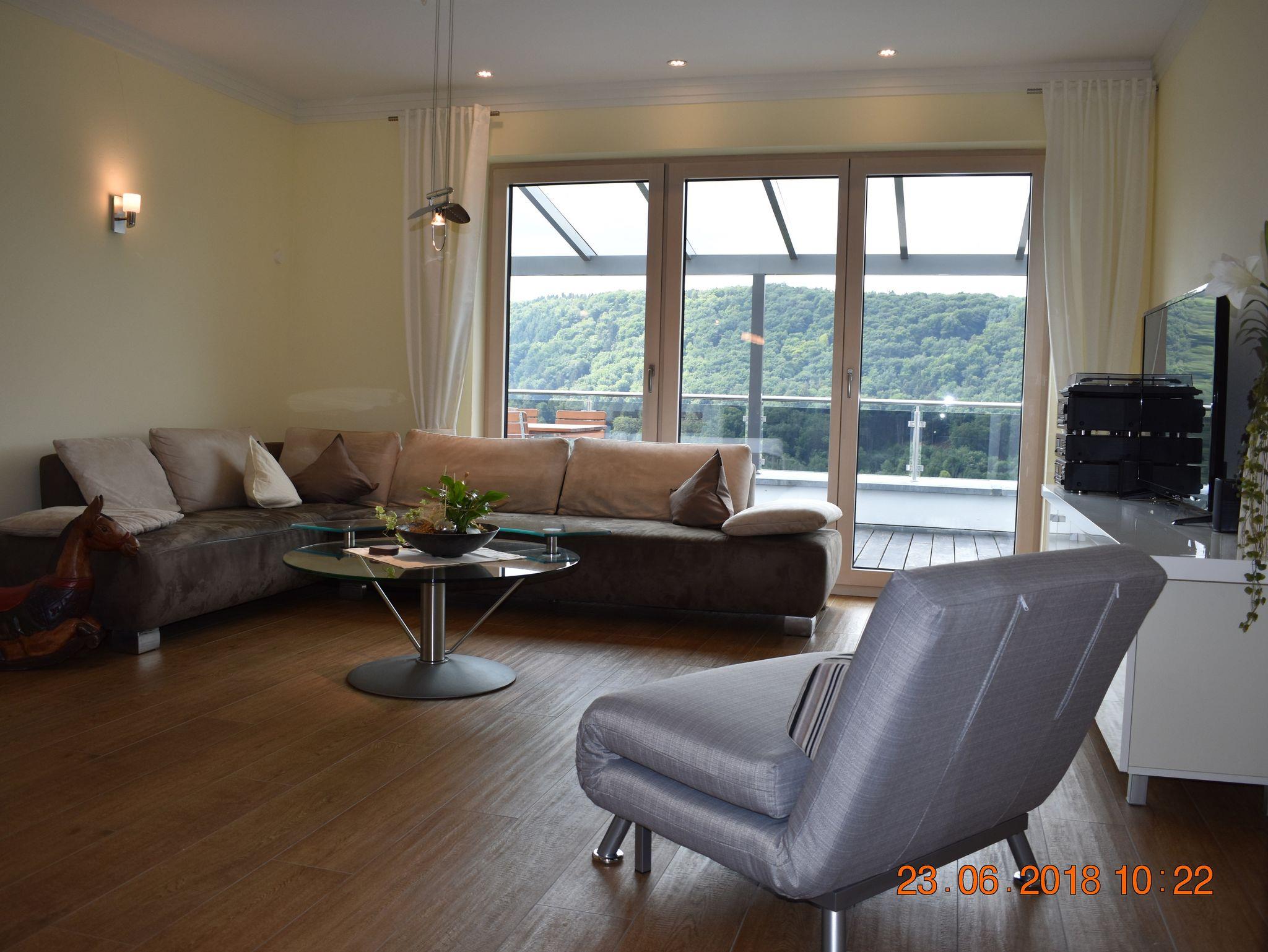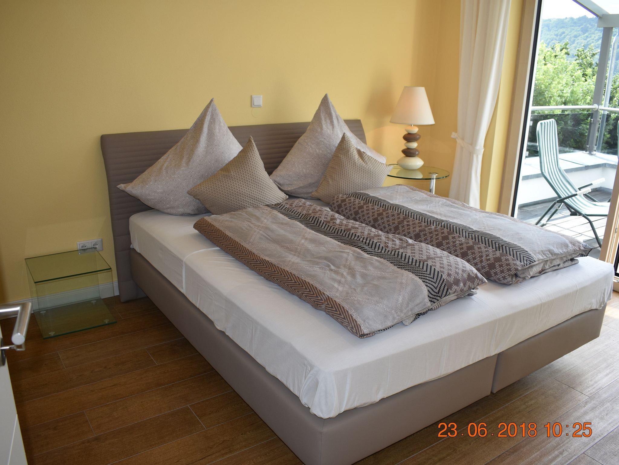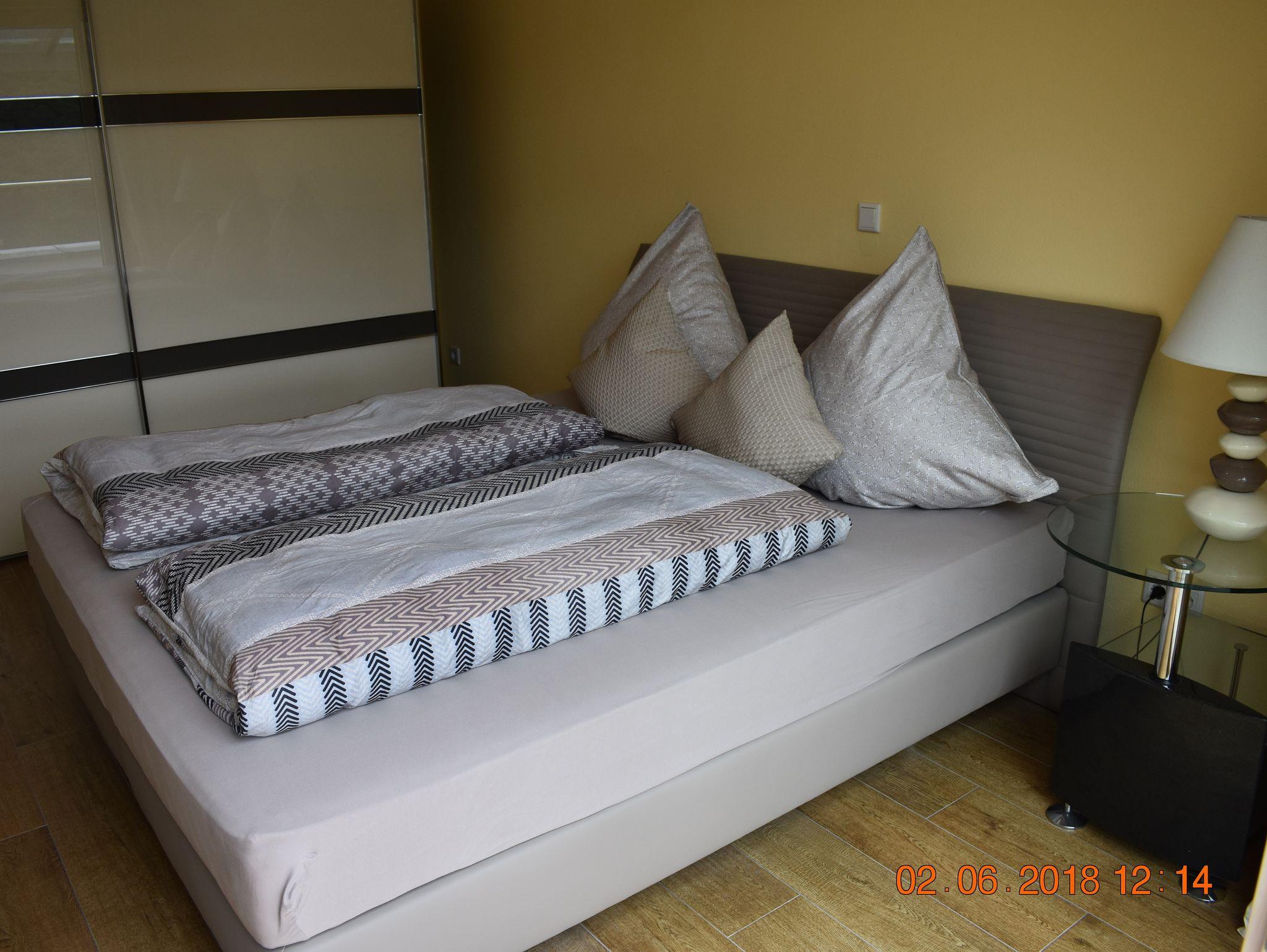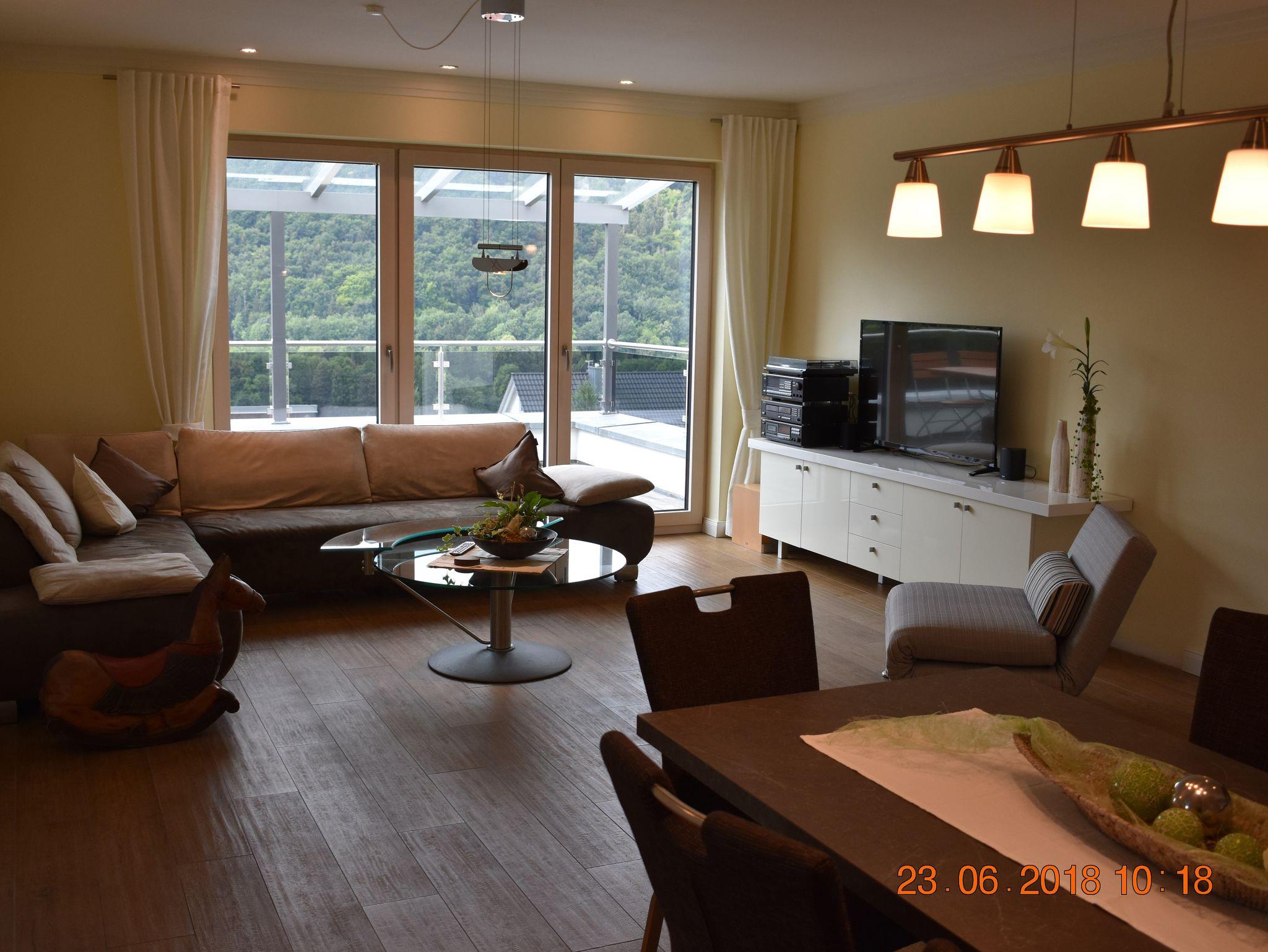 Die großzügige und komfortable Ferienwohnung mit 65qm und 24qm überdachter Terrasse verfügt über zwei Schlafzimmer, einmal mit einem Boxspring-Doppelbett, das zweite über ein Einzelbett. Der Wohnbereich ist offen gestaltet mit Küche, Essplatz für 4 Personen und dem Wohnbereich mit großzügiger Couch und Sessel. Hier haben sie auch DAB-Radio, Flat-Screen TV 127cm, Sat-Anlage und W-LAN für Ihre Unterhaltung. Die hochwertige Küche verfügt über Induktionskochfeld, Geschirrspüler, Backofen, Kühl-und Gefrierschrank, Microwelle, Kaffeemaschine, Toaster und Eierkocher.