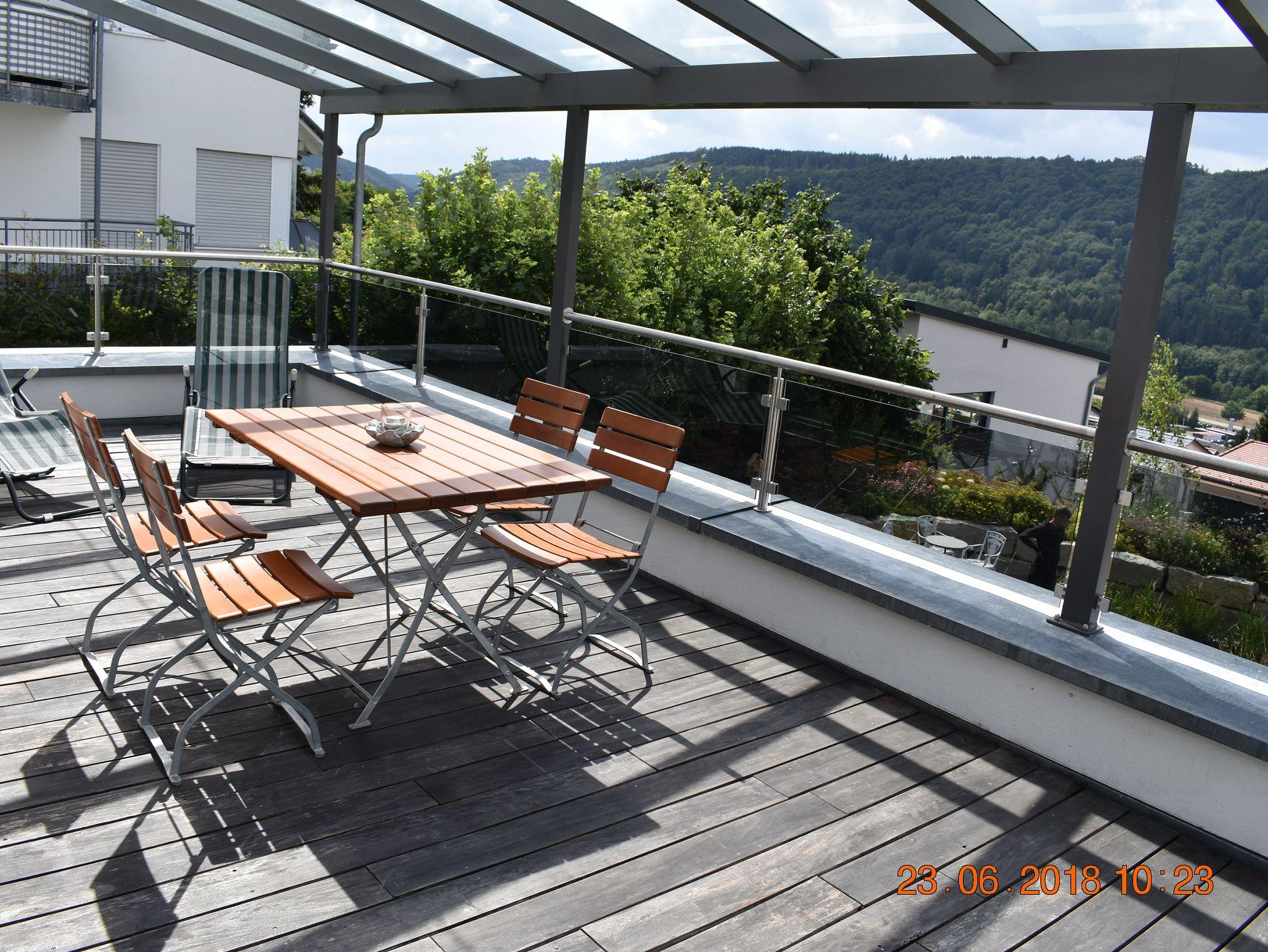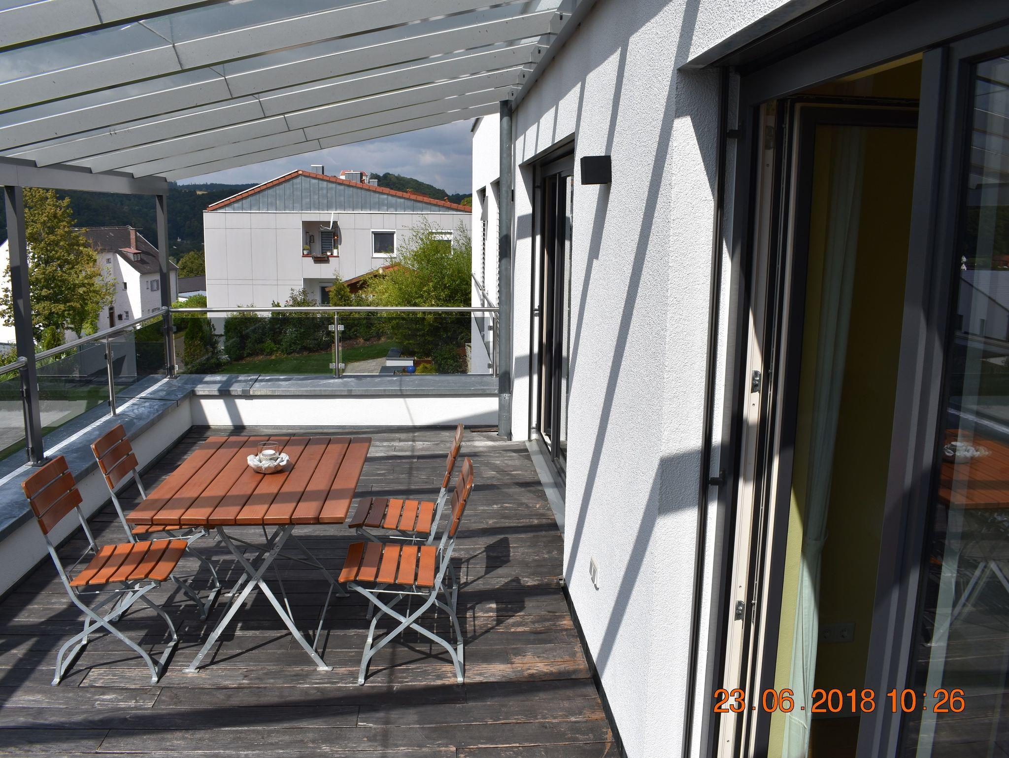 Die Terrasse mit Blick auf Garten und den Tal des Rain-Main-Donau-Kanals ist mit Glas überdacht. Zum relaxen und Sonne genießen finden sie dort zwei Liegen vor und für einen gemütlichen Abend ein Tisch und vier Stühle. Eine zweite Terrasse auf der Ostseite bietet Schatten an heißen Tagen.