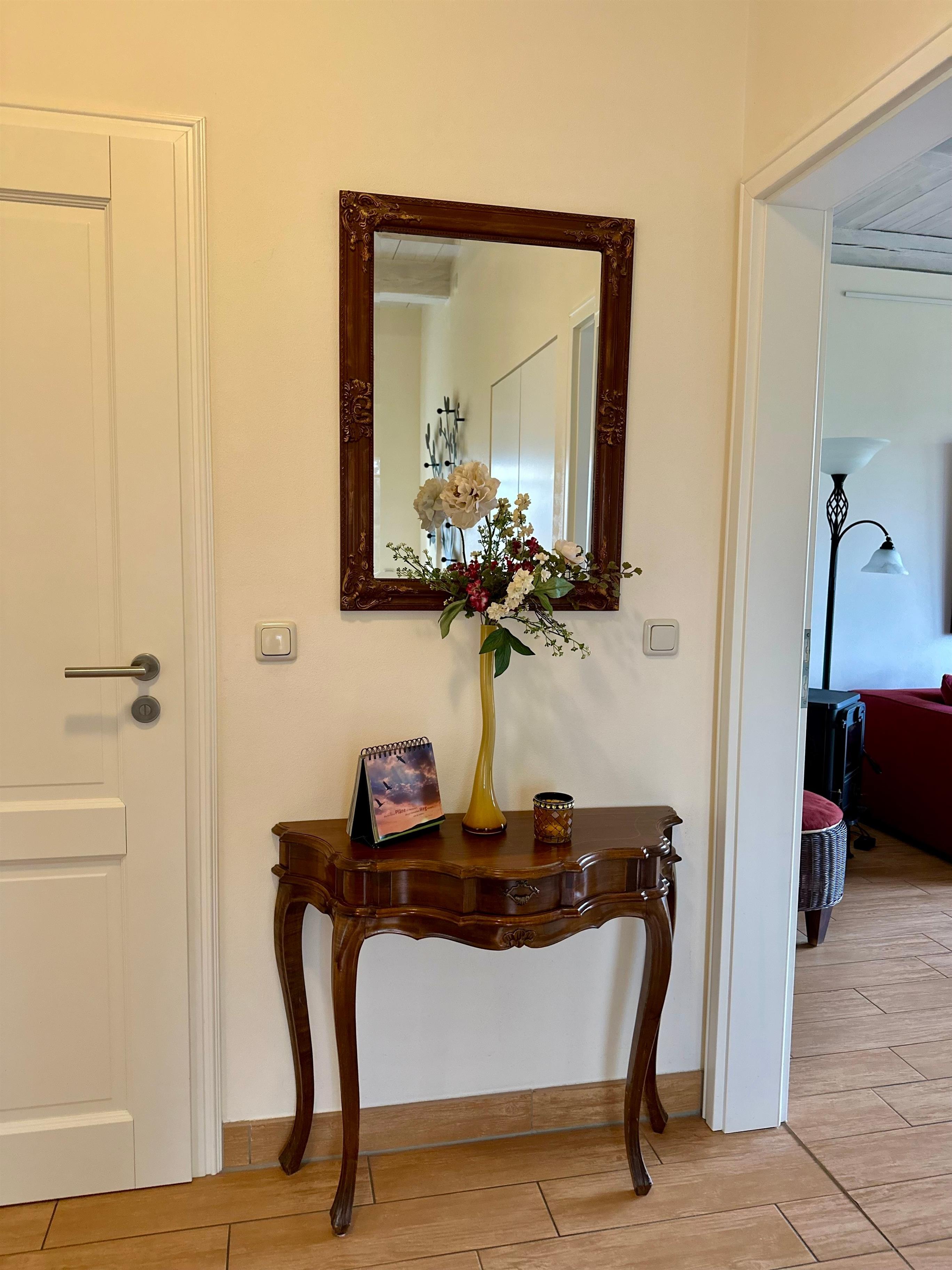 Die 68 m2 große Ferienwohnung 'Indian Summer' ist für bis zu 4 Personen eingerichtet. Die Wohnung besteht aus einem großzügigen Wohnraum mit Kamin. Eine nostalgische Essecke und eine Landhausküche im mediterranen Stil bieten die Möglichkeit zum gemeinsamen Kochen und gemütlichen Beisammensein. Die Sonne verzaubert die zwei Schlafräume, die gen Osten liegen, mit Ihrem morgendlichen warmen Licht. Sie sind mit einem Doppelbett und einem hochwertigen, ausziehbaren Schlafsofa (1,60 x 2,00 m) eingerichtet. Ein elegantes Badezimmer mit ebenerdiger Dusche lädt zum Verweilen ein. Zwei großzügig angelegte Terrassen mit Strandkorb und weiteren Sitzgelegenheiten locken Sie hinaus in die Natur. Warme Farbtöne und edle Stoffe geben der Wohnung Ihren Charme.