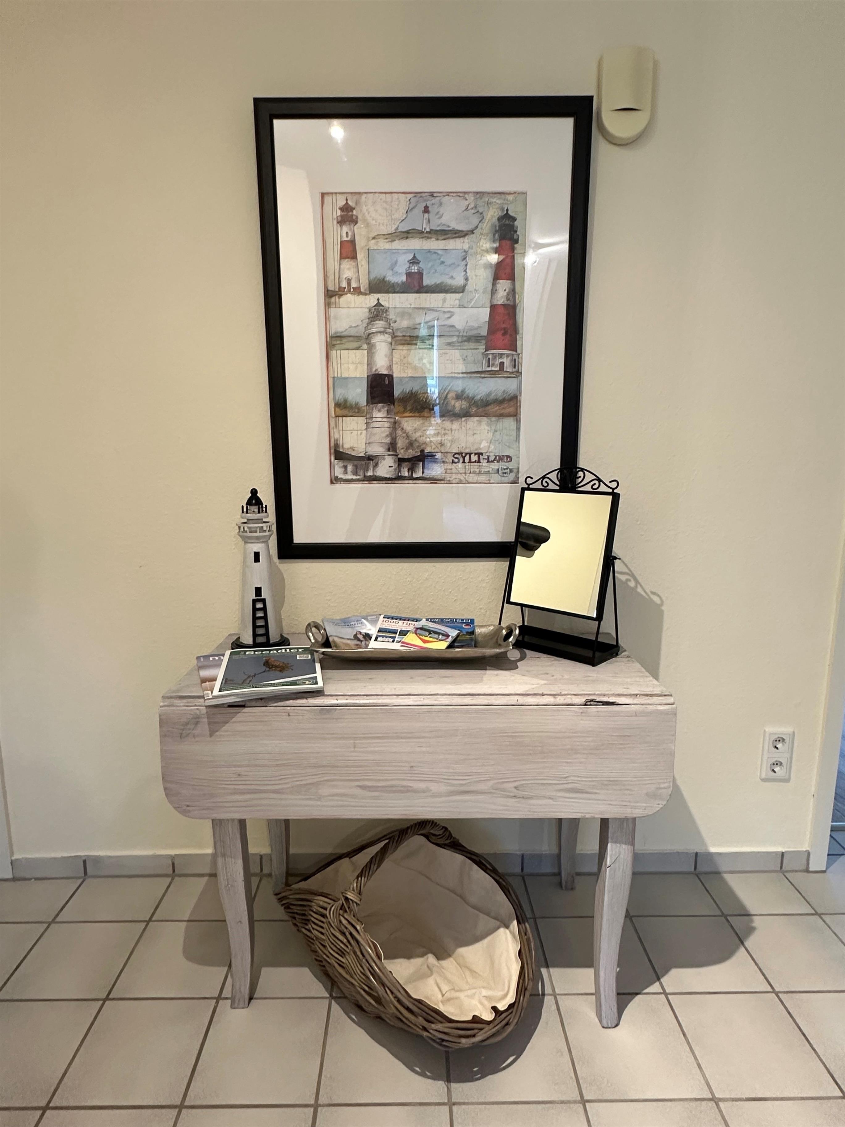 Dem Eingangsbereich der Wohnung mit Garderobe und Schuhablage schließt sich eine gemütliche, schwedische Essecke mit Küchenbank an. Küche, Essecke und Eingangsbereich harmonieren in blau-weiß-Tönen.