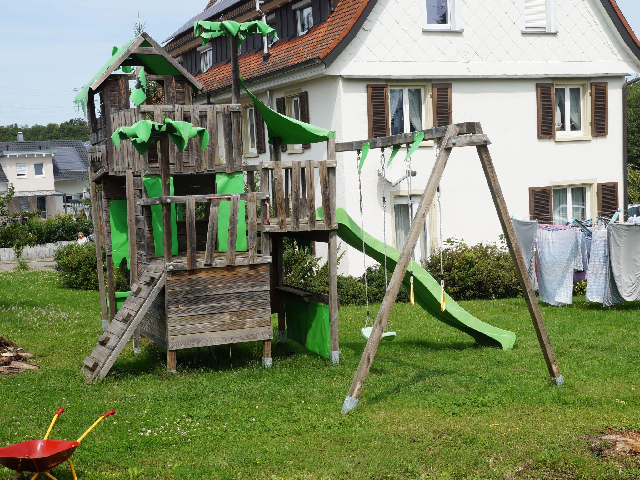 Welcome to the beautiful Black Forest. We rent out a ground floor flat with terrace and garden and two attic flats in a quiet location on the outskirts of Rietheim, surrounded by beautiful countryside. The holiday flat promises a pleasant stay in Villingen-Schwenningen in the southern Black Forest. As a suburb of the Zähringer town, we are not far from the famous source of the Danube, between Lake Constance and Feldberg. Thanks to our central location, it is always possible to reach shopping facilities and many beautiful excursion destinations on foot, by bike or by car. For example, the beautiful flower island of Mainau, the Schaffhausen Rhine Falls in Switzerland, the Hohenzollern castles of Hechingen and Sigmaringen, various caves in the Swabian Alb and not forgetting the beautiful spas and saltwater baths in the surrounding area. With space for a maximum of 5 people, a play and sunbathing area, garden barbecue and terrace, it is ideal for families with children, but also for pupils/students and craftsmen. Free W-Lan is available in both holiday flats. We look forward to your visit.