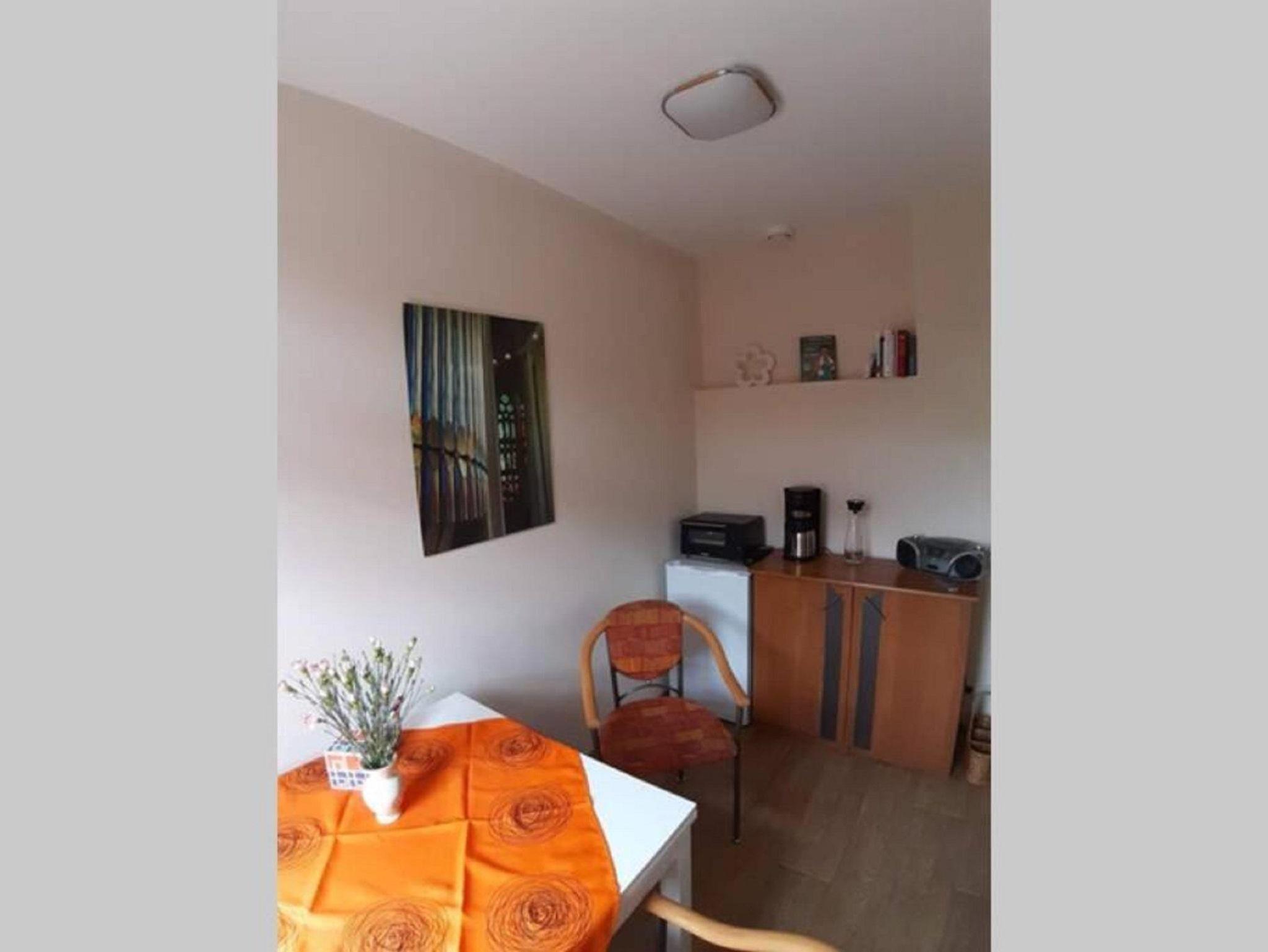 Die Ferienwohnung besteht aus zwei Zimmern, einem Flur und einem Bad. Das Bad ist mit einer Dusche, einem WC und einem Waschtisch ausgestattet. Im Flur ist eine Miniküche mit Spüle und Cerankochplatte. Weiterhin sind Geschirr und Töpfe vorhanden. Das Schlafzimmer ist mit zwei Betten und einem TV ausgestattet. In einem weiteren Raum befindet sich ein Kühlschrank mit ein paar Getränkten die gern genutzt werden können. Die Bezahlung erfolgt als Kasse des Vertrauens. Außerdem ist eine Kaffemaschiene und ein Wasserkocher vorhanden. Der Kaffee- und Teevorrat kann kostenlos aufgebraucht werden. Auch ein Minibackofen und ein Toaster sind vorhanden.